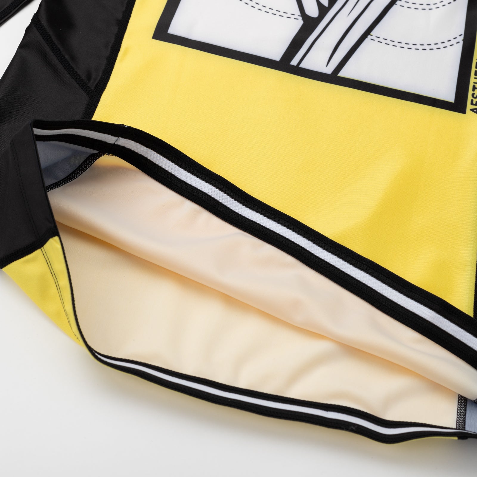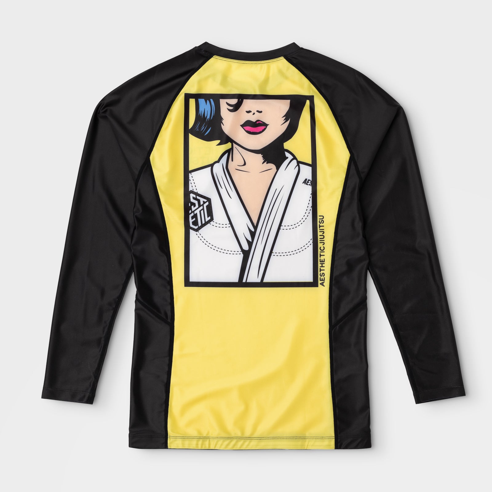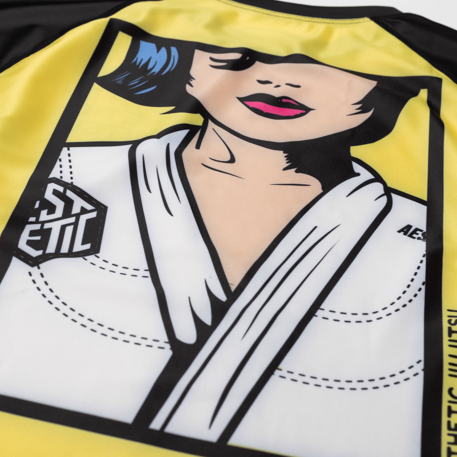 "The Girl" rash guard from Aesthetic is a tribute to the ladies with it's female grappler artwork depicted across the back panel. Made with a classic poly/Spandex blend and fully sublimated artwork.