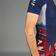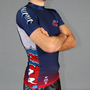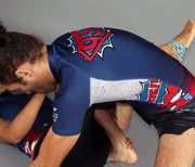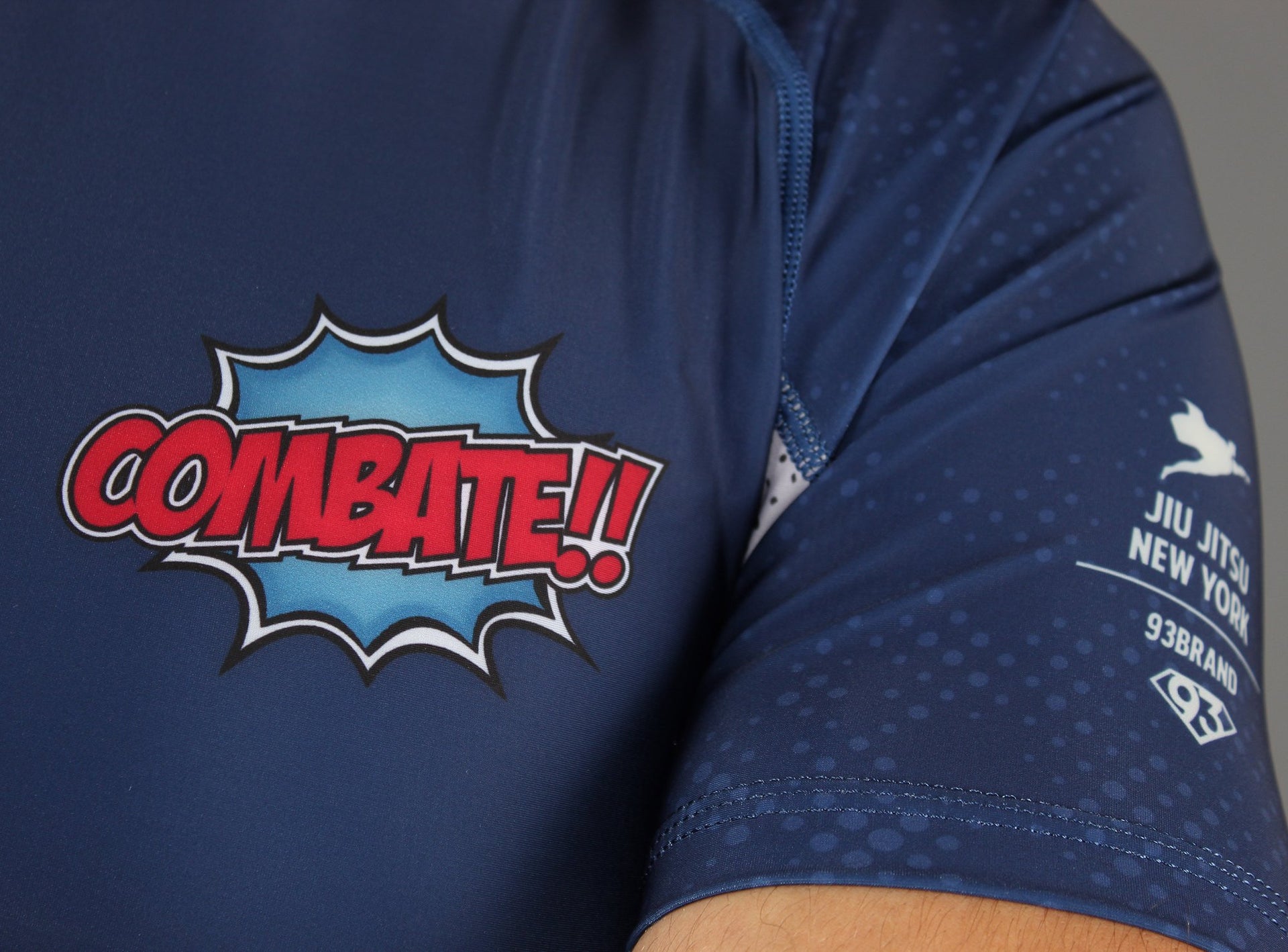 The "Combate!" series expands to include our new premium short-sleeve rashie! Like the Jiu Jitsu Gi, this is inspired by imagery and text from the comics we grew up on. With intricate patchwork and embroideries referencing one of the more iconic superheroes of yesteryear.