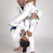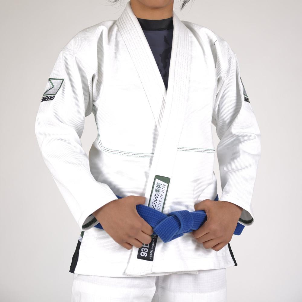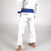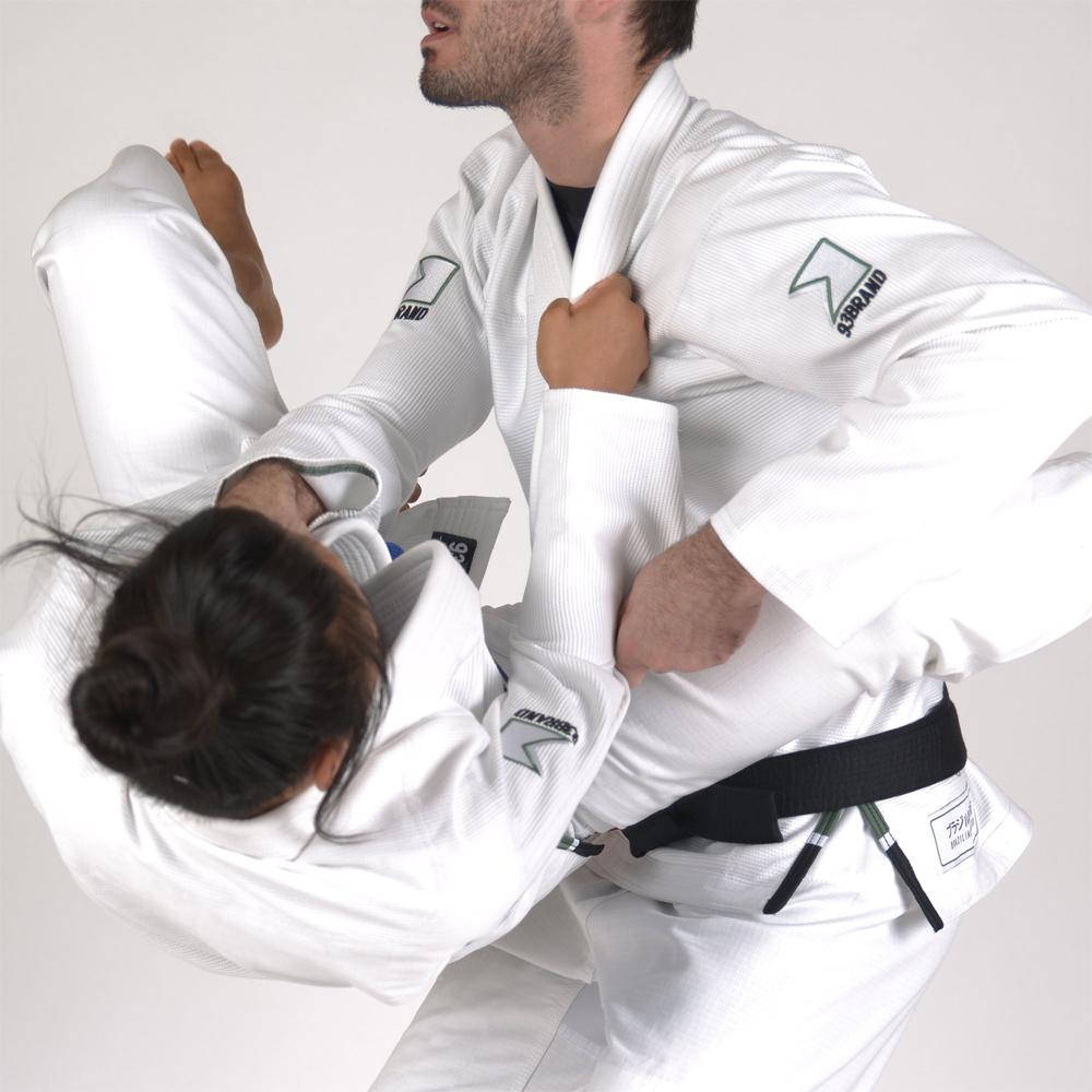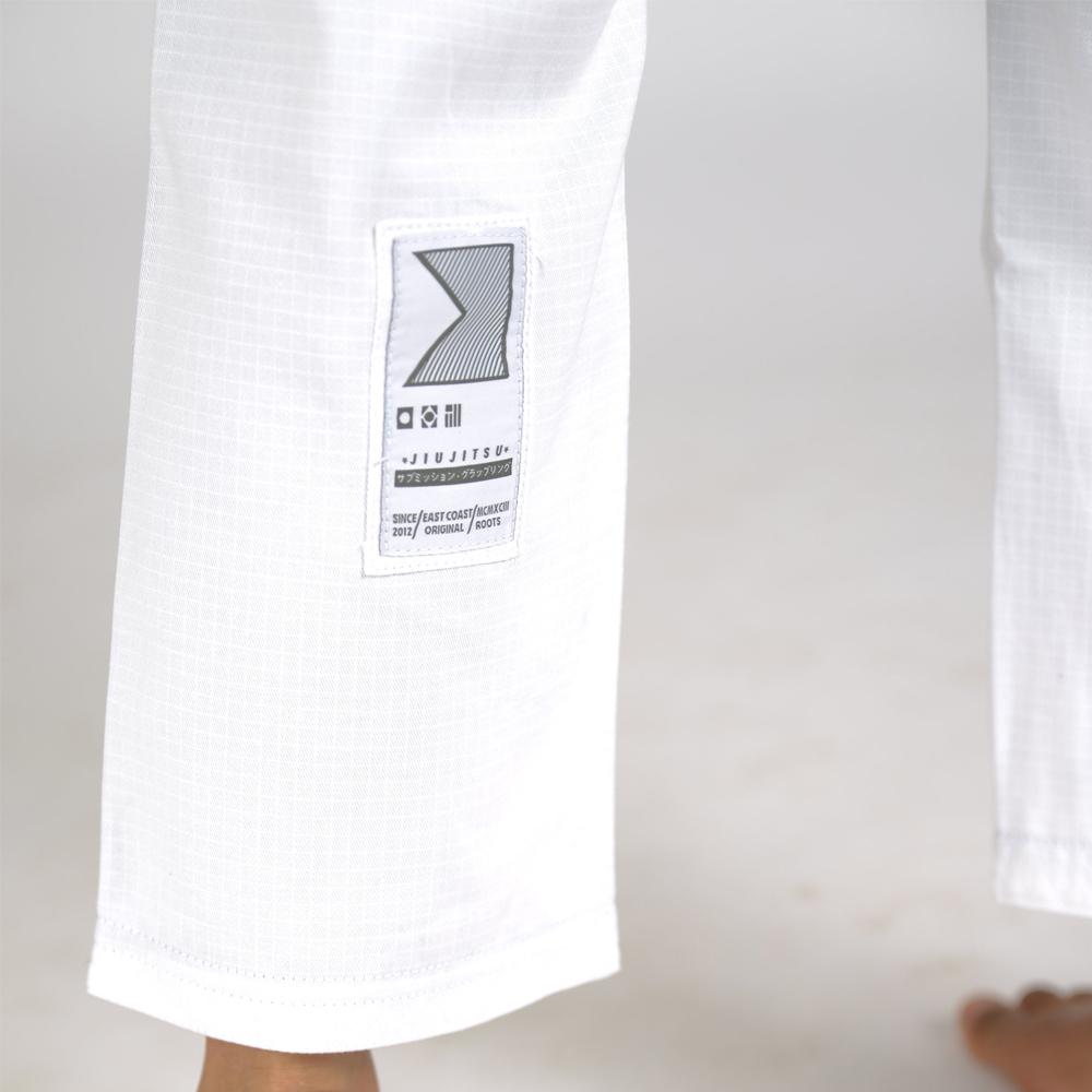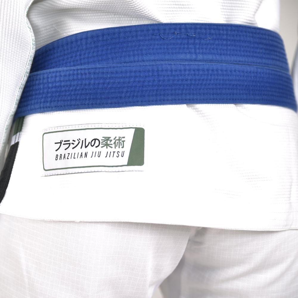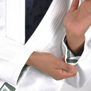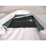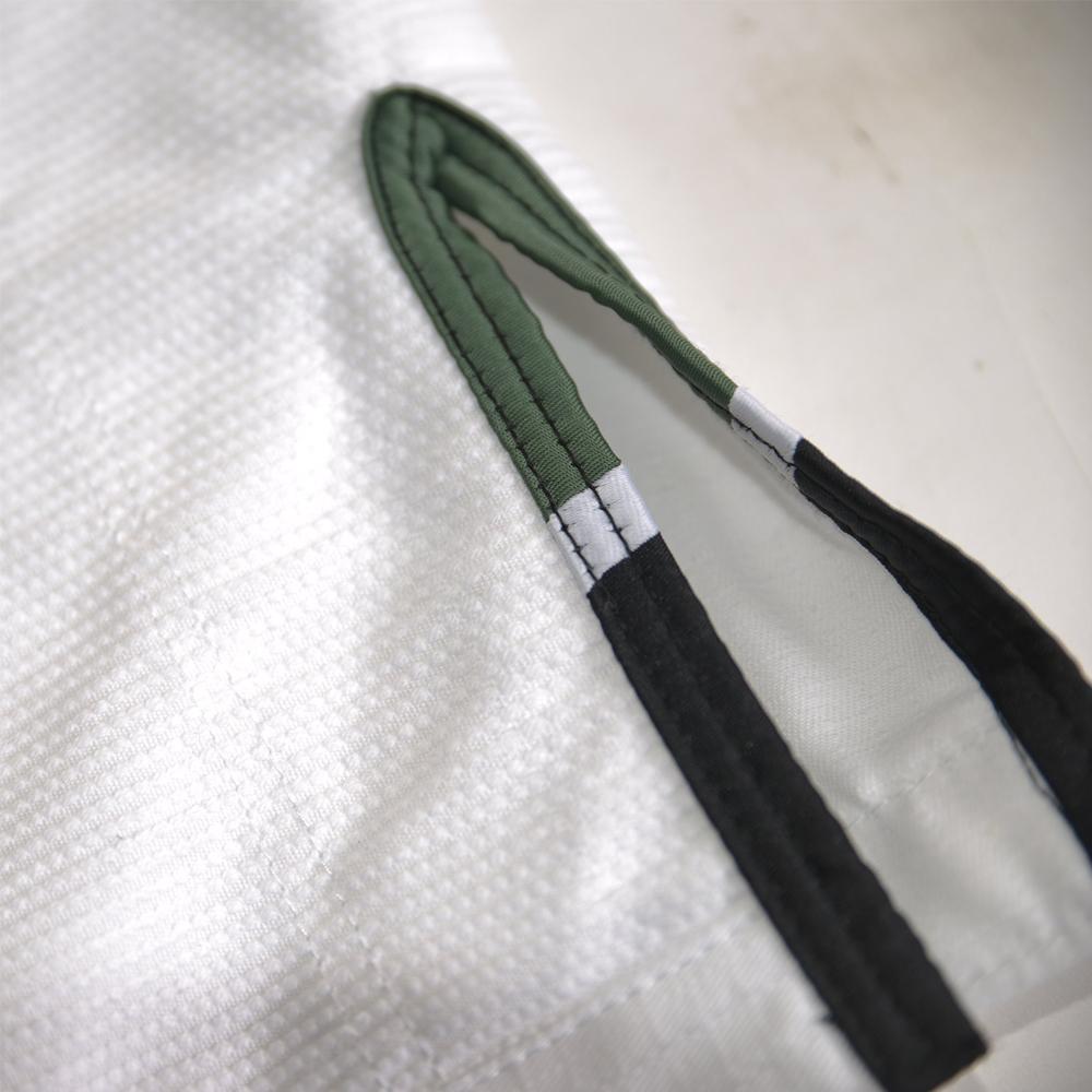 Inspired by the accent trim on the popular "SS3" model, this is an IBJJF approved white version (using the same green/black trim as the SS3). With unique mounted patches and quality embroideries throughout. Side vents and pant loops use a unique multi-color pattern.