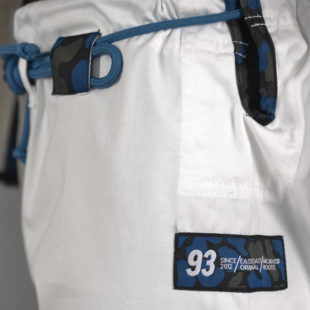Killing 2 birds with 1 stone by using pattern artwork on the side vent fabric, pant loops, and interior panels, instead of adding additional patches. Arm embroideries have a hollow fill to keep things light. No contrast stitching, leaving a nice clean white finish. Plenty of room for academy or sponsor patches. Interior should and vent reinforcements feature a sublimated blue/grey/black camo pattern.