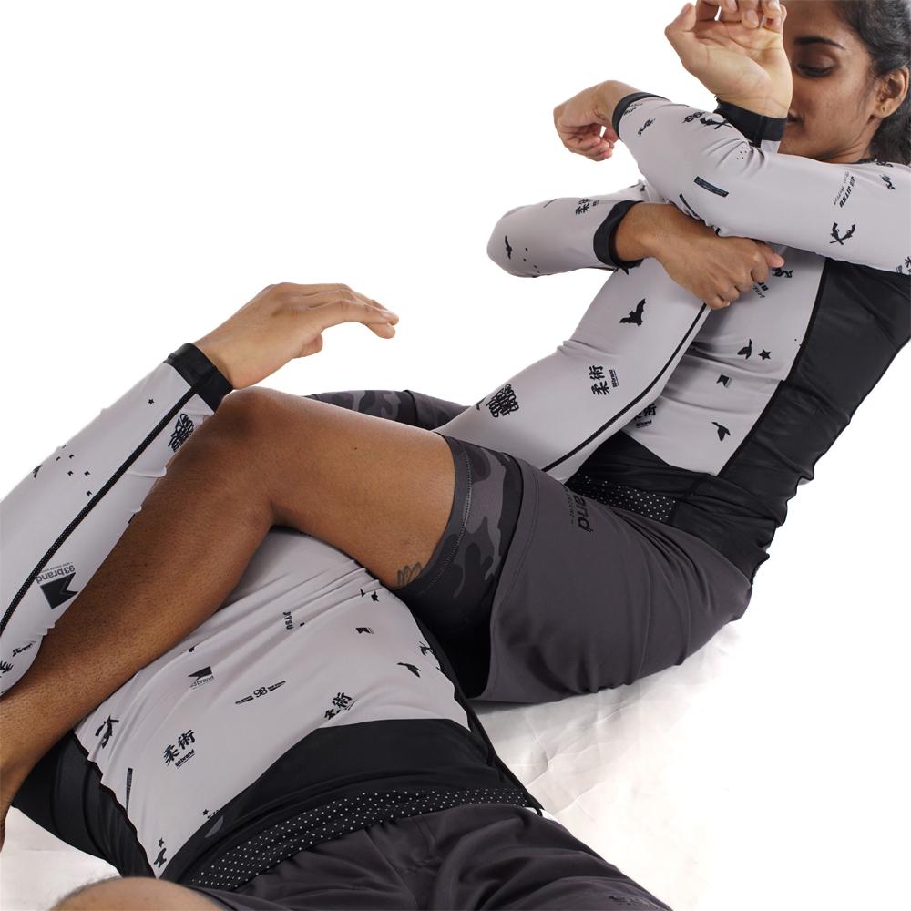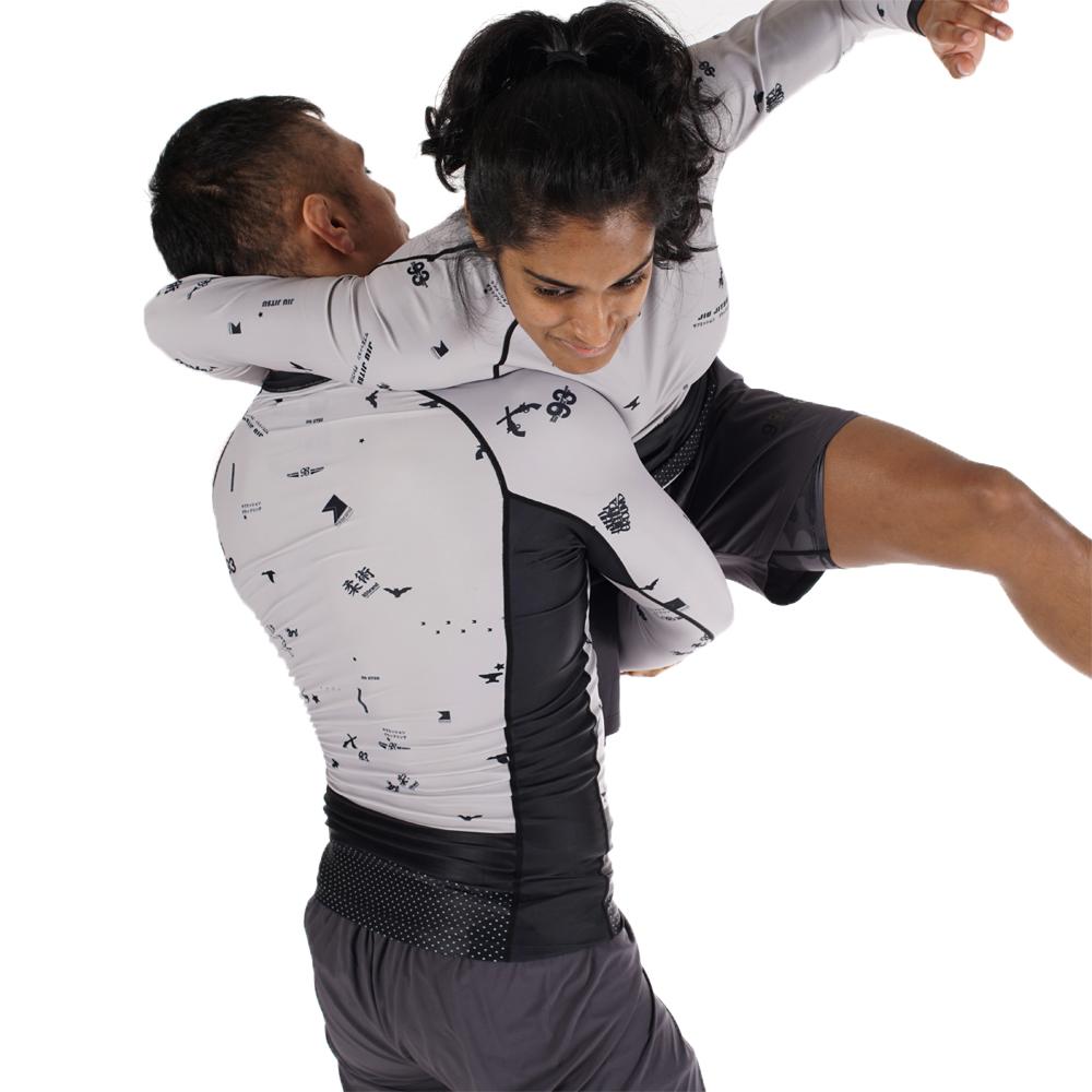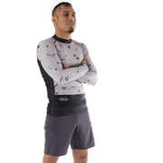Equipped with 93brand's 7/8 sleeve cut, which supplies compression/warmth/protection to the forearms without impeding your gripping ability (for guillotines, RNC, and heel hooks). 7/8 sleeves also make it more convenient to train with the rashguard under your Gi, since the cuffs won't poke out/get loosened and get caught in sleeve grips. Assembled with strong yet flexible flatlock stitching.