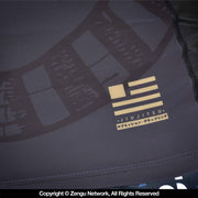 New rashguard from 93brand, featuring original illustrations by local NYC artists. The Strong Snake rashie, like the spats and shorts of the same name, combines the Gadsden flag with the Jiu Jitsu belt and stylized typography and Japanese lettering. Black with dark grey background gives the rest of the piece depth and texture. Assembled with flexible flatlock stitching and a generous torso length to prevent riding up while rolling.