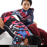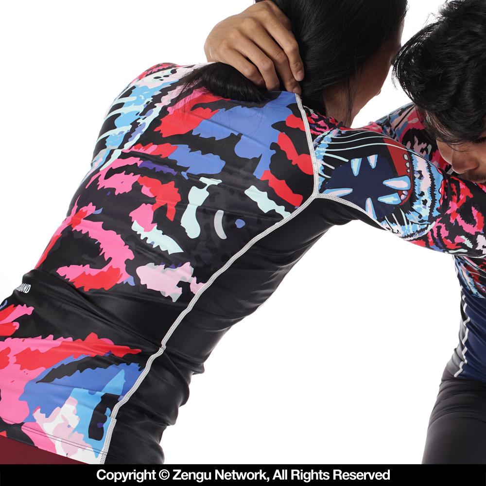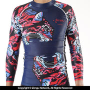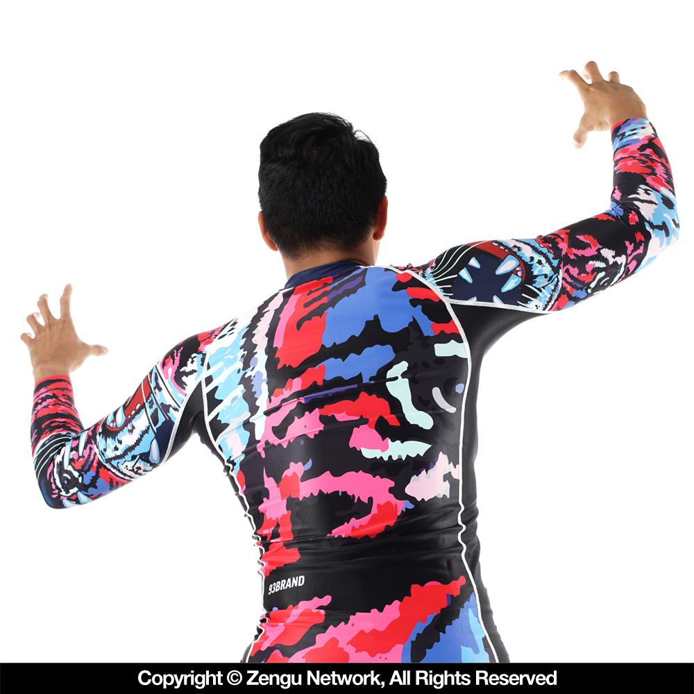 The new "Wild Tiger" Rashguard is the latest from the ongoing Tiger collaboration series, using colorways found on the recently released "Wild Tiger" Gi. Using digital illustrations by NY artist Jamie Kimak. Roaring tiger heads oppose each other on the front panel, many more are repeated randomly along the sleeves, and the color pattern detail is blown up large scale on the back panel. This premium rashie features an improved cut with a smoother overall fit and less bunching of materials. The soft 88/12 poly/spandex blend feels great against the skin, with all artwork fully sublimated for the finest detail (100% immune to fading and cracking).