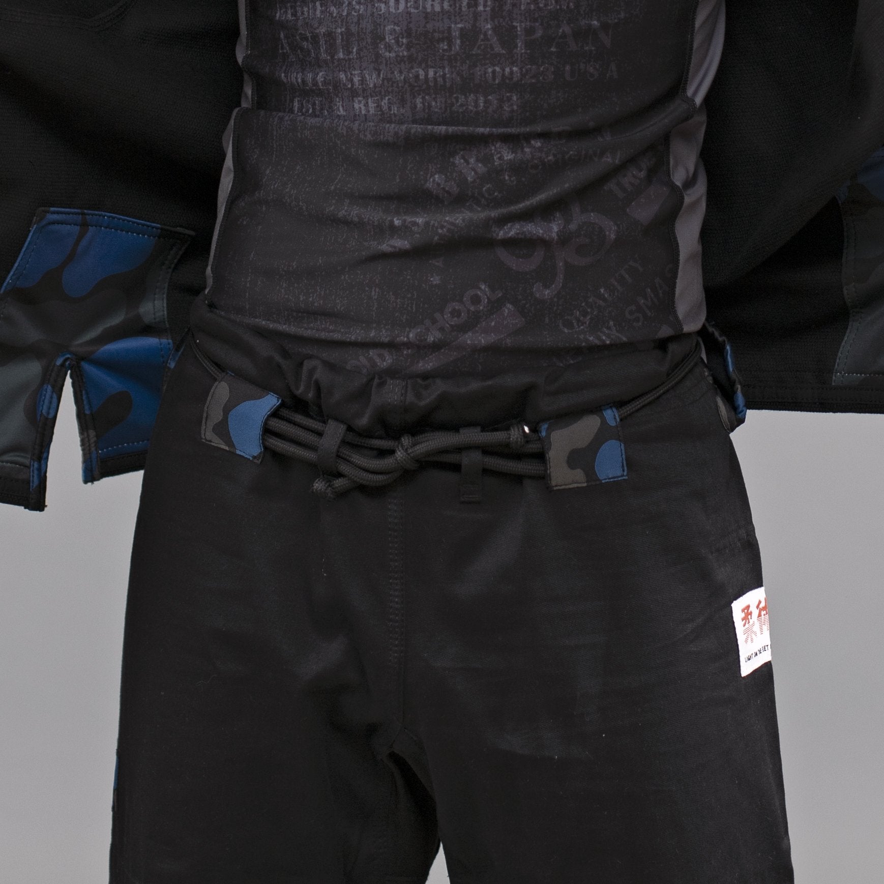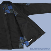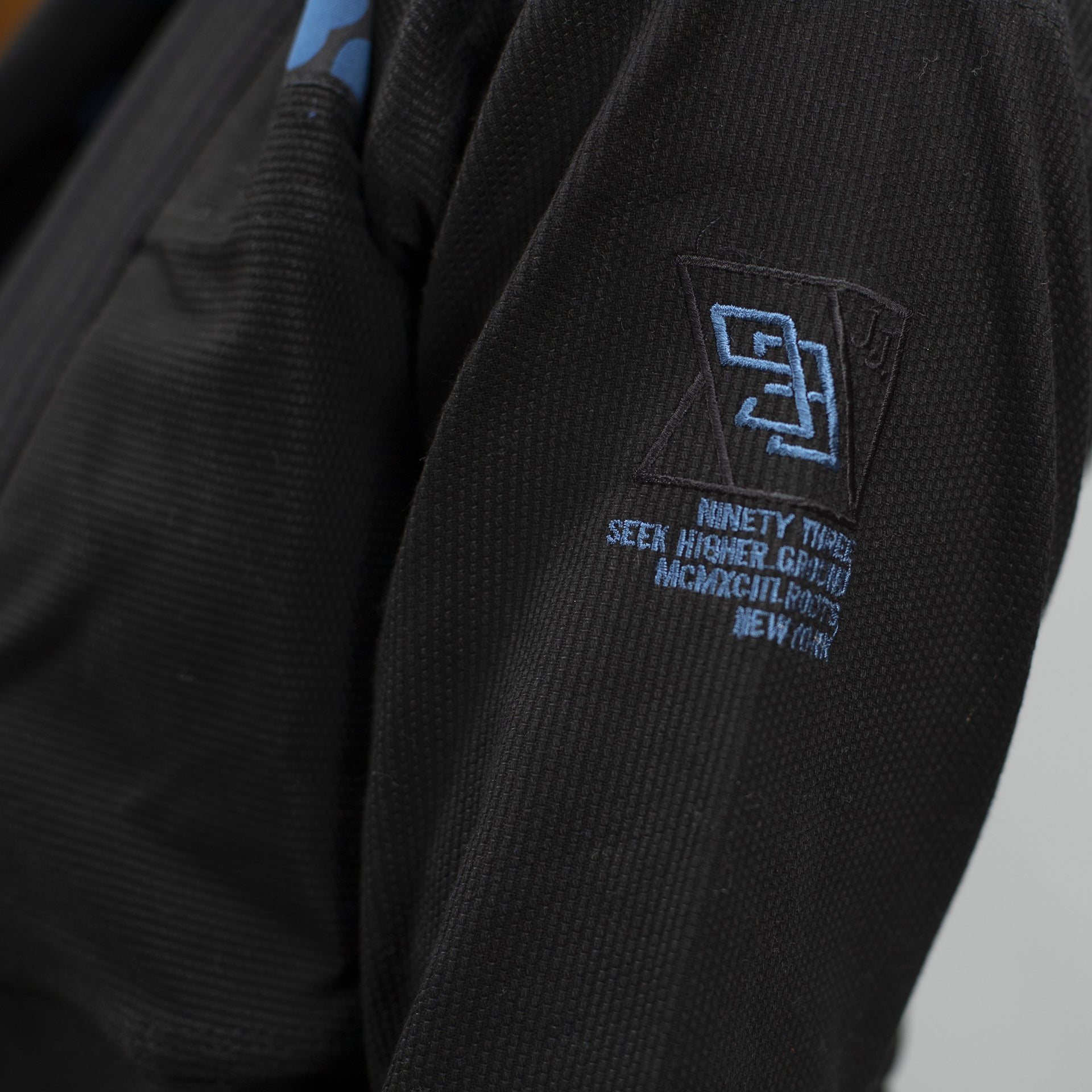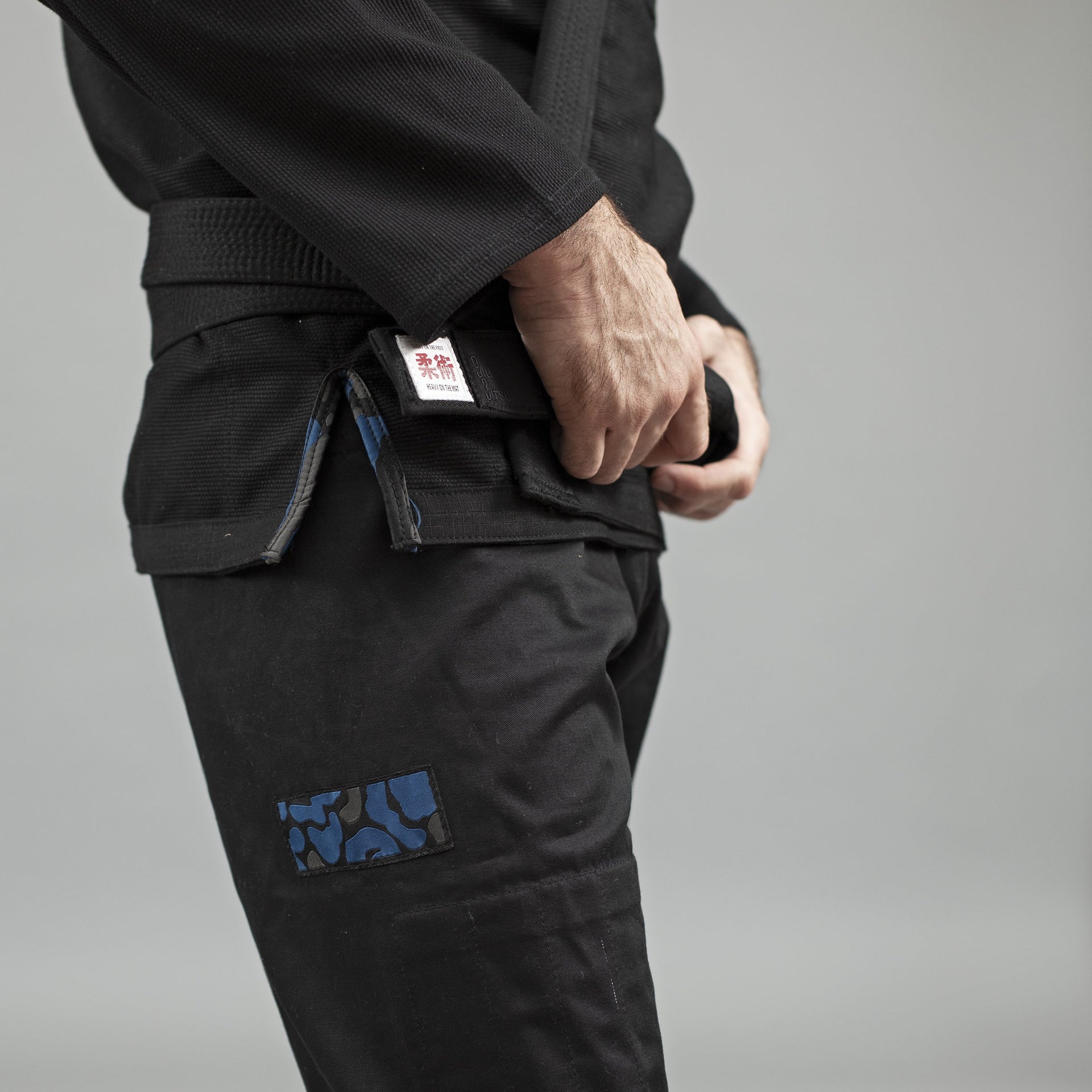 Killing 2 birds with 1 stone by using pattern artwork on the side vent fabric, pant loops, and interior panels, instead of adding additional patches. Arm embroideries have a hollow fill to keep things light. No contrast stitching, leaving a nice clean black finish. Plenty of room for academy or sponsor patches. Interior should and vent reinforcements feature a sublimated blue/grey/black camo pattern.