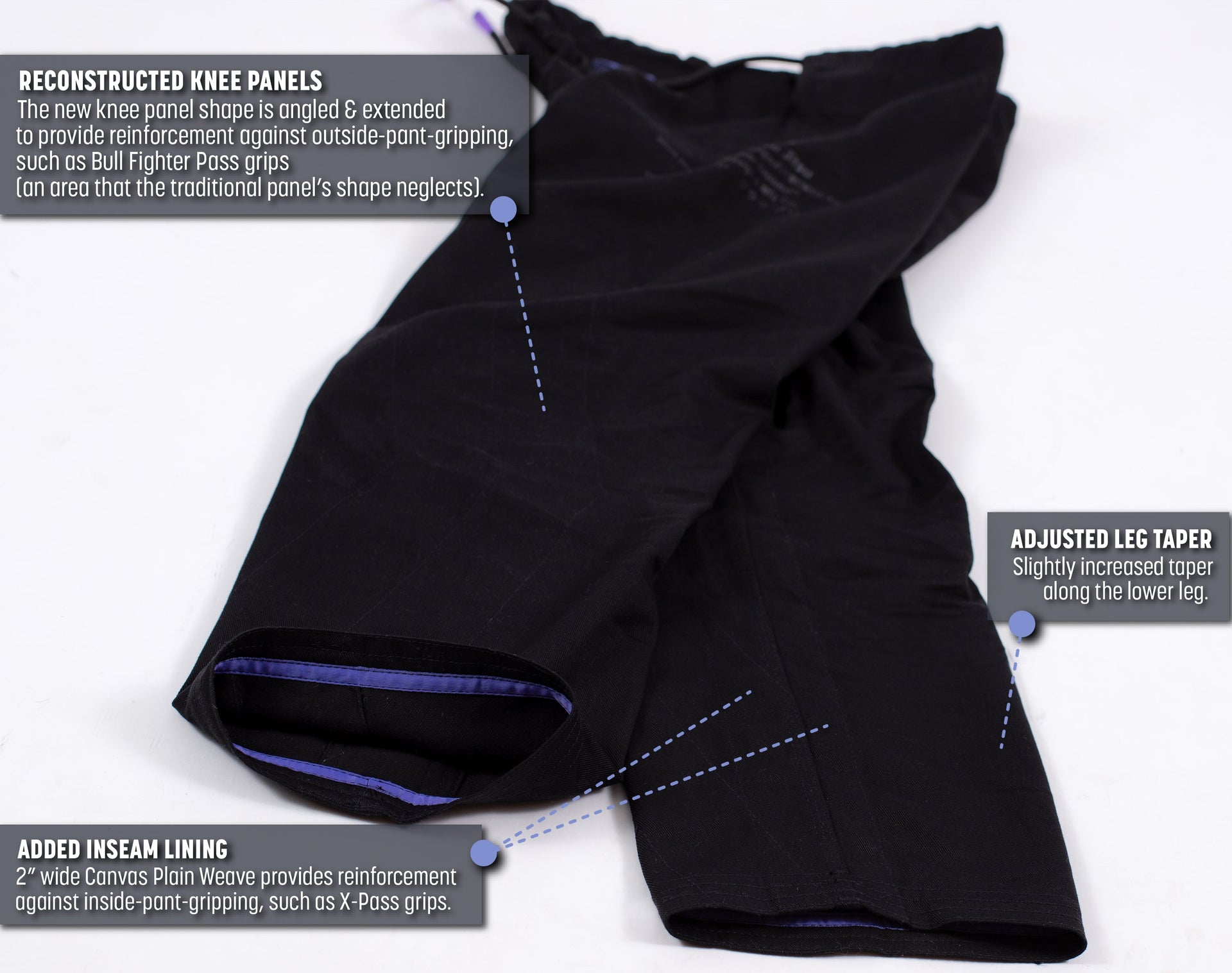 Traditional Gi pants see a rectangular panel straight down the front leg. But bull-fighter grips often involve your opponent grabbing outside the knee area. So they remodeled their already-extended knee panel to progressively angle outward toward the knee - and used Pearl Weave - so the result is a much harder fabric for your opponents to maintain passing grips such as bull-fighter.