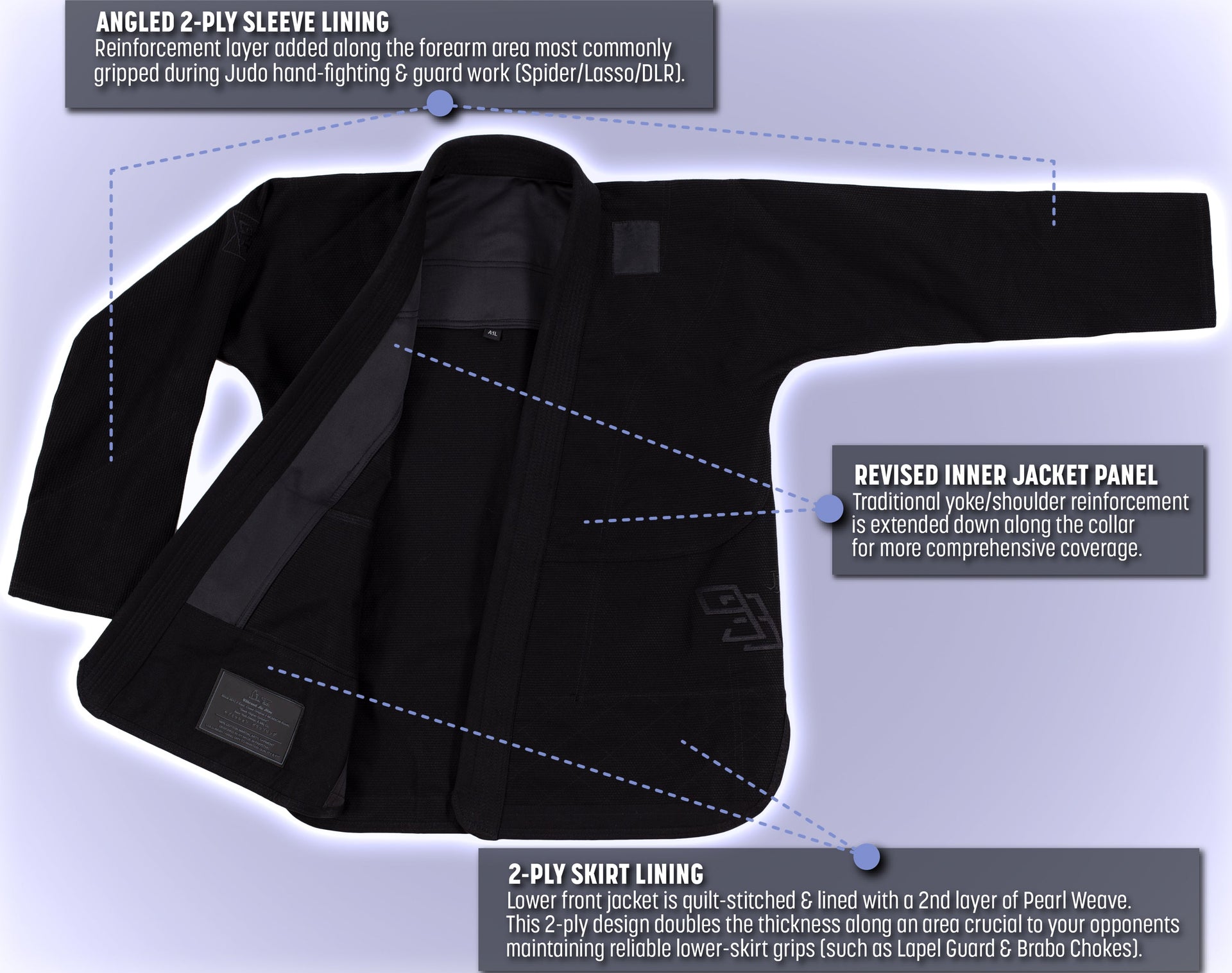 We all hate being stuck in a nasty Lapel Guard, so they've added a 2nd panel of Pearl Weave along the bottom of the skirt, along with slanting the ends of the lapel - the idea being to make the material harder to bunch up for grips, and the angle of the lapel ends making it harder for opponents to get a strong grip on the bottom of your lapels.