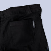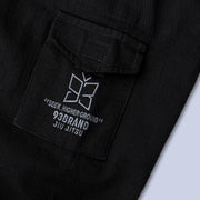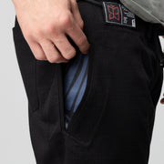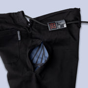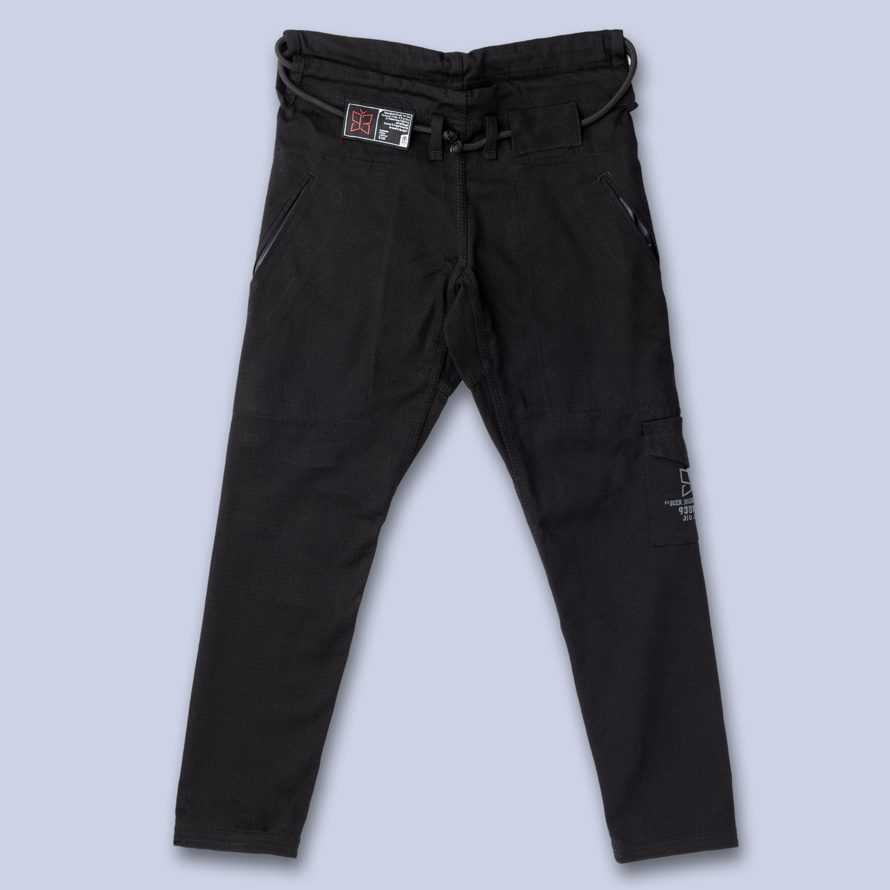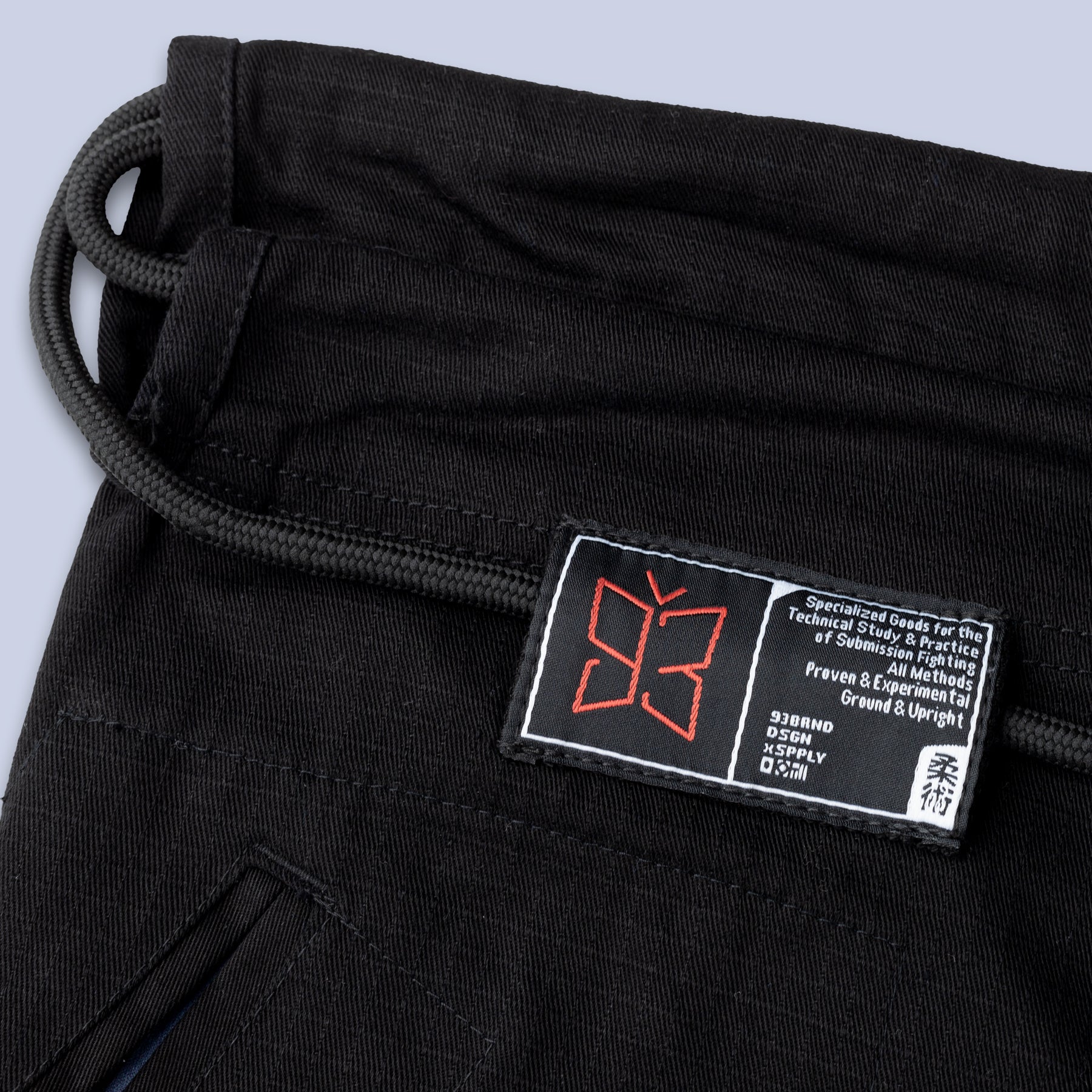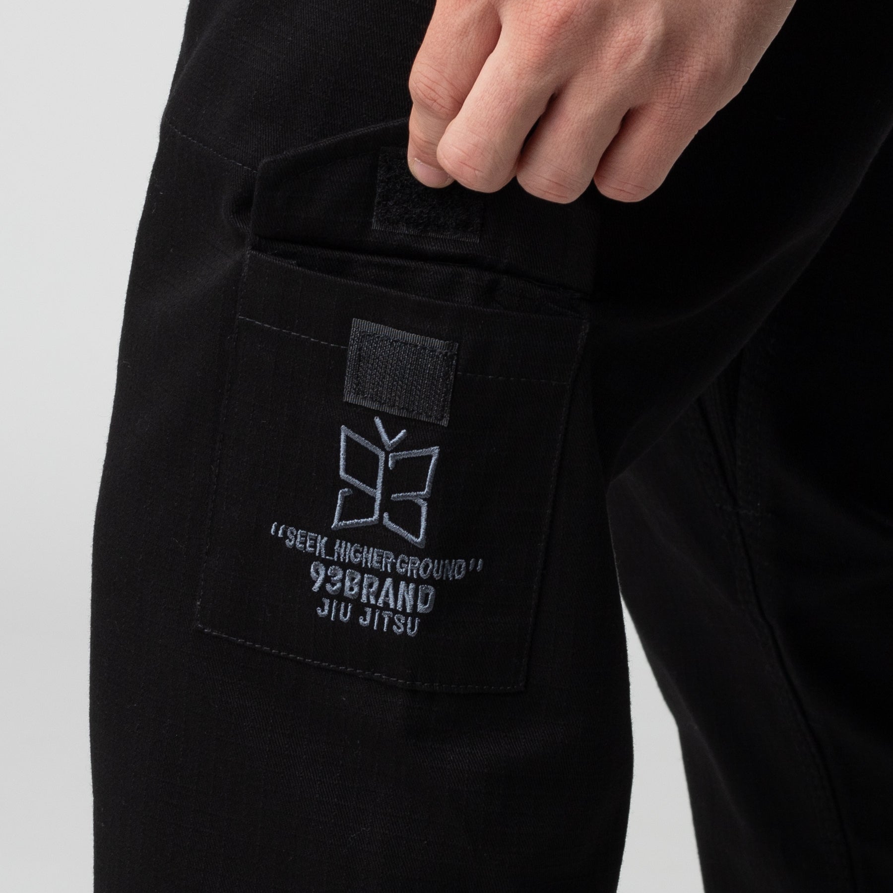 The Gentle Art also gets a shout-out via a few key elements, like the traditional Gi pant gusset, elevated rear waist, and 93brand's drawstring/loop system. 300GSM Pearl Weave is used for the rear pocket, for a little reminder of the mats when you reach for your wallet. Pearl Weave is also used for 4-point loop system, with a butterfly-guard-inspired woven label on the 4th loop. New for this style is the addition of the card/cash flap pocket.
