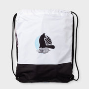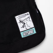 The pants have a round stretch drawstring, running through 4 pant loops. The 2 outermost loops are extended (4x as wide as usual loops) and include a KITSUNE embroidery on the right side and a direct print on the left side.