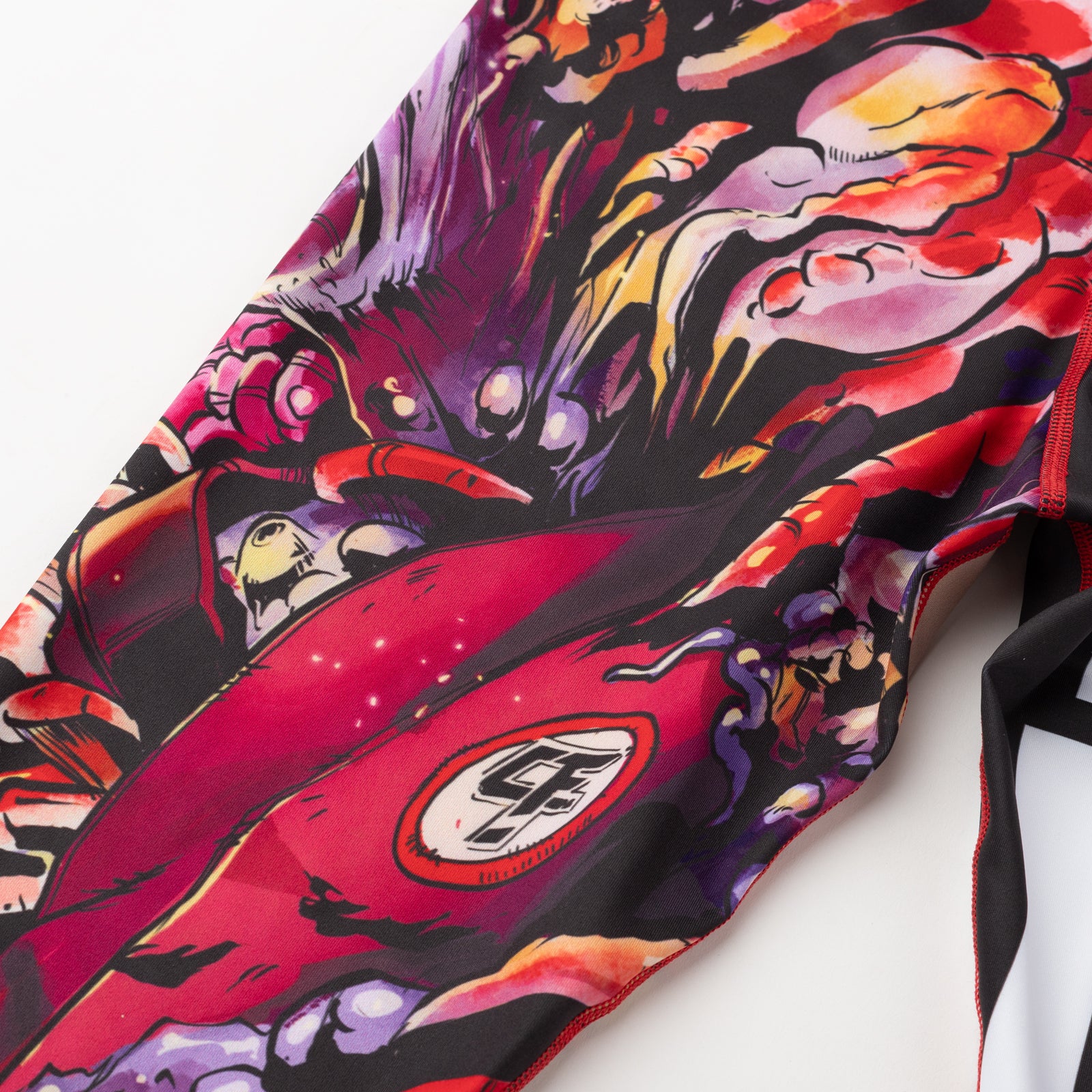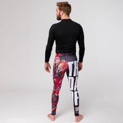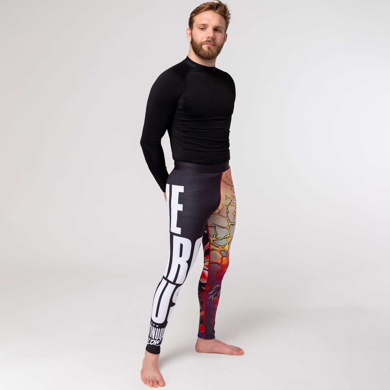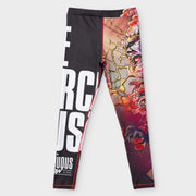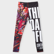 Continuous Flow’s “The Darced of Us” spats have a stylish graphic layout with detailed artwork running the length of the left leg and bold white text extending off the panel on the right. Constructed with contrasting dark red stitching and minimal branding overall. Women’s sizes are made with a comfortable high waist design as seen in the photos.