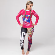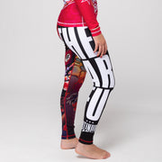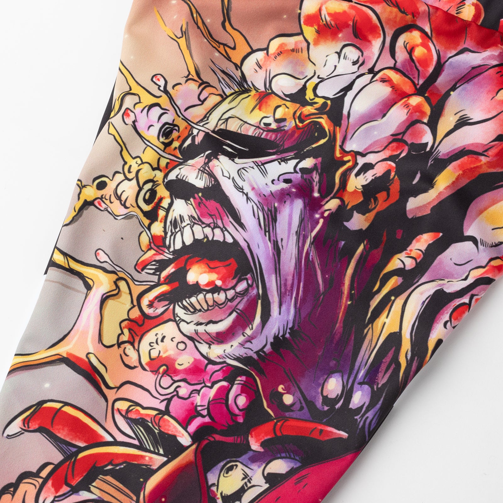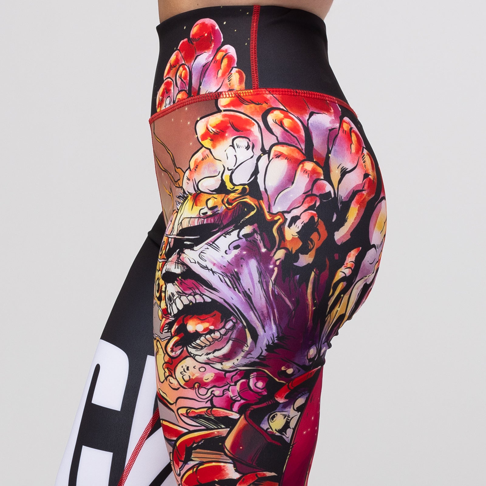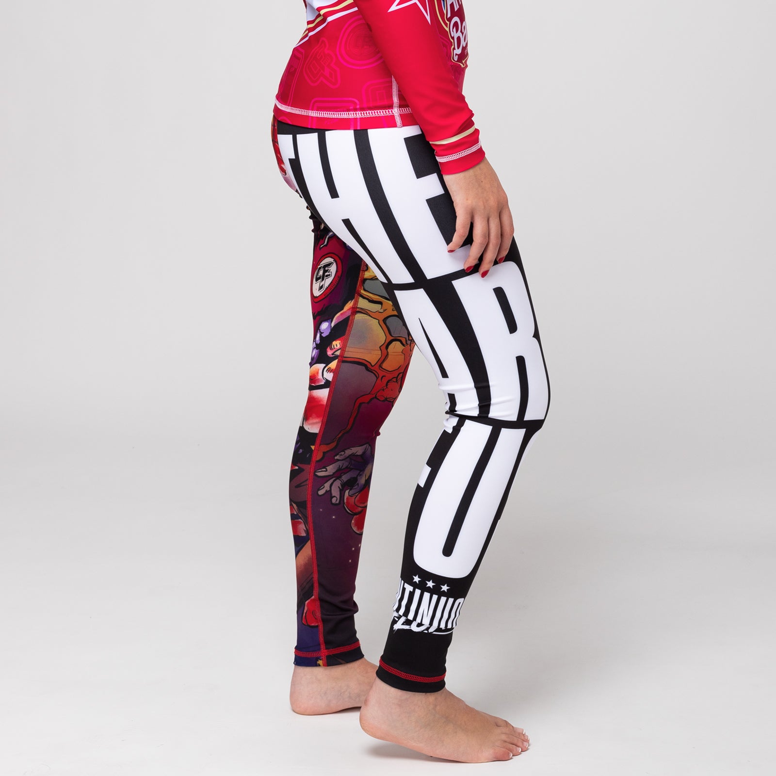 Continuous Flow’s “The Darced of Us” spats have a stylish graphic layout with detailed artwork running the length of the left leg and bold white text extending off the panel on the right. Constructed with contrasting dark red stitching and minimal branding overall. Women’s sizes are made with a comfortable high waist design as seen in the photos.