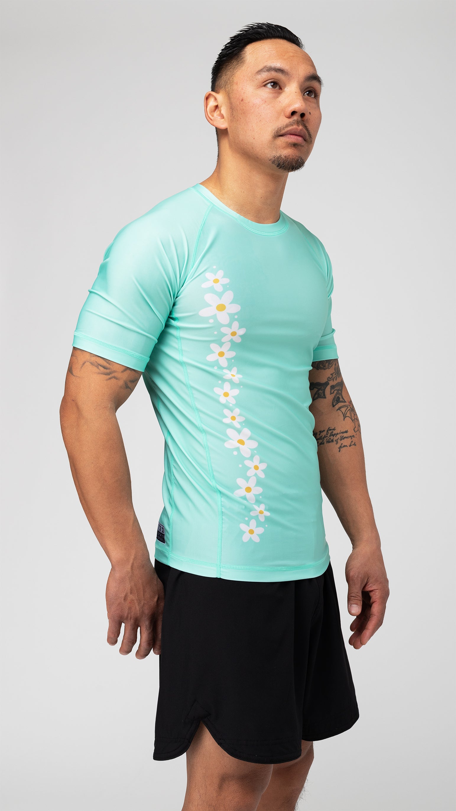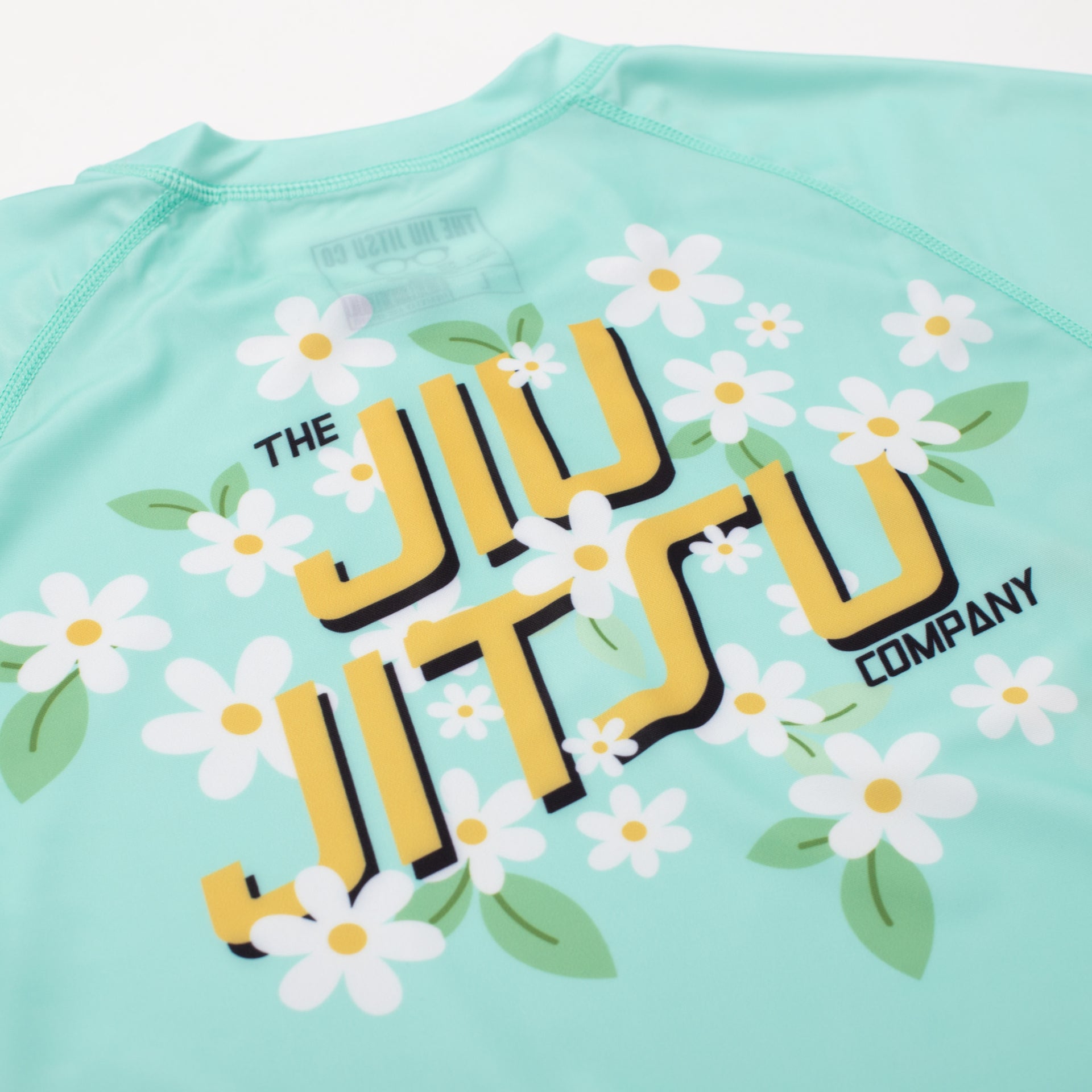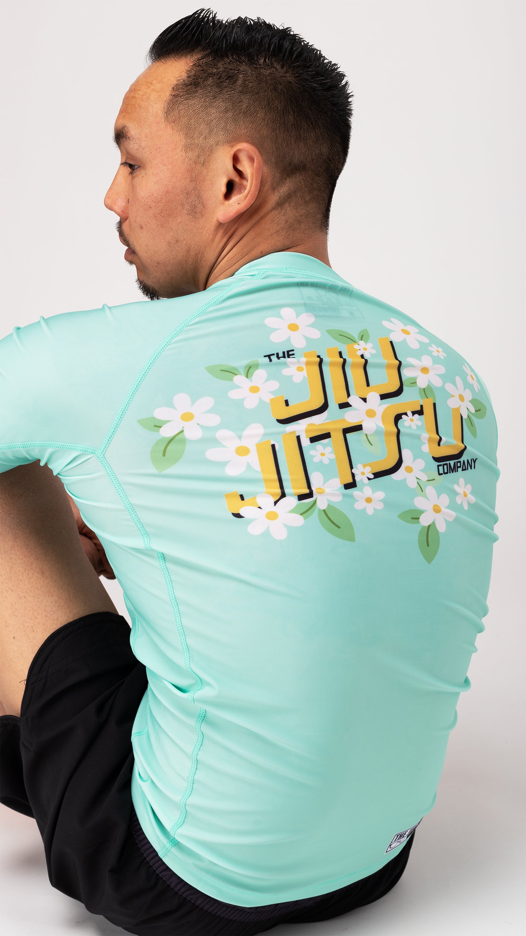 The Fresh Mint rash guard from the Jiu Jitsu Company blends a pastel mint shade with some daisy-inspired floral accents. This nogi top has a premium compression fit with all the essential specs.