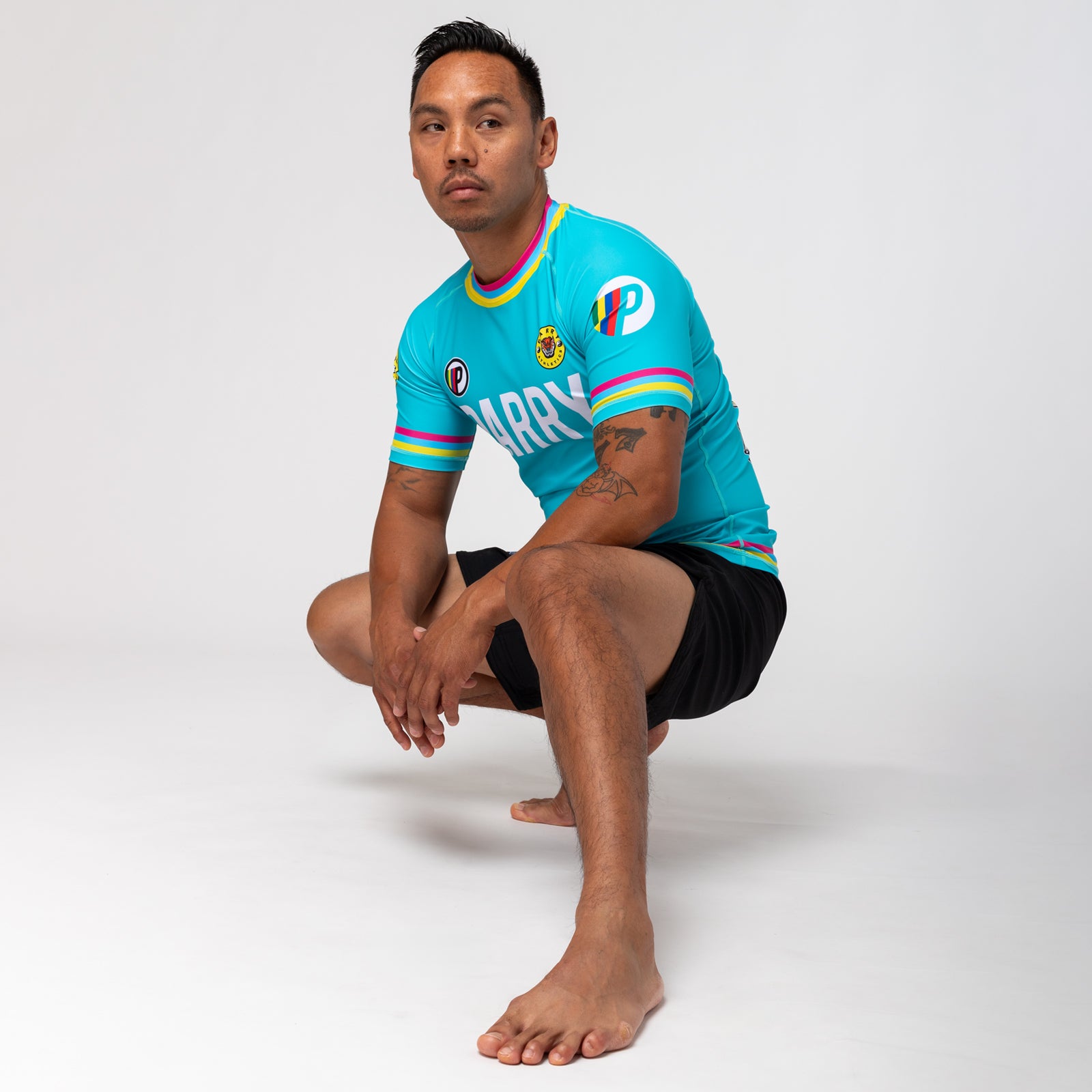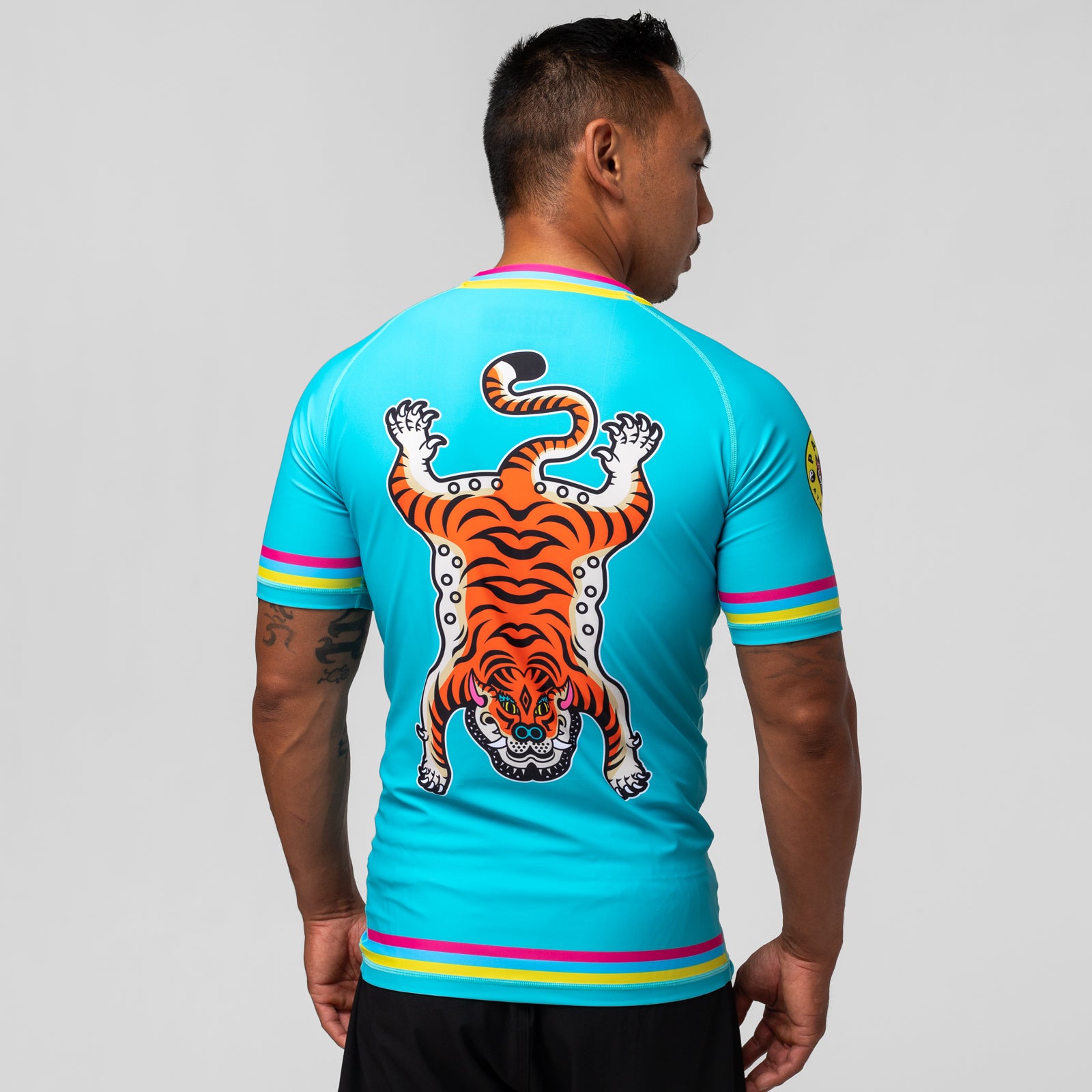 The Tiger rash guard from Parry features a beautiful tiger graphic on the back and carries their signature bold text on the front panel. The unique color stripes add an extra touch of personality.
