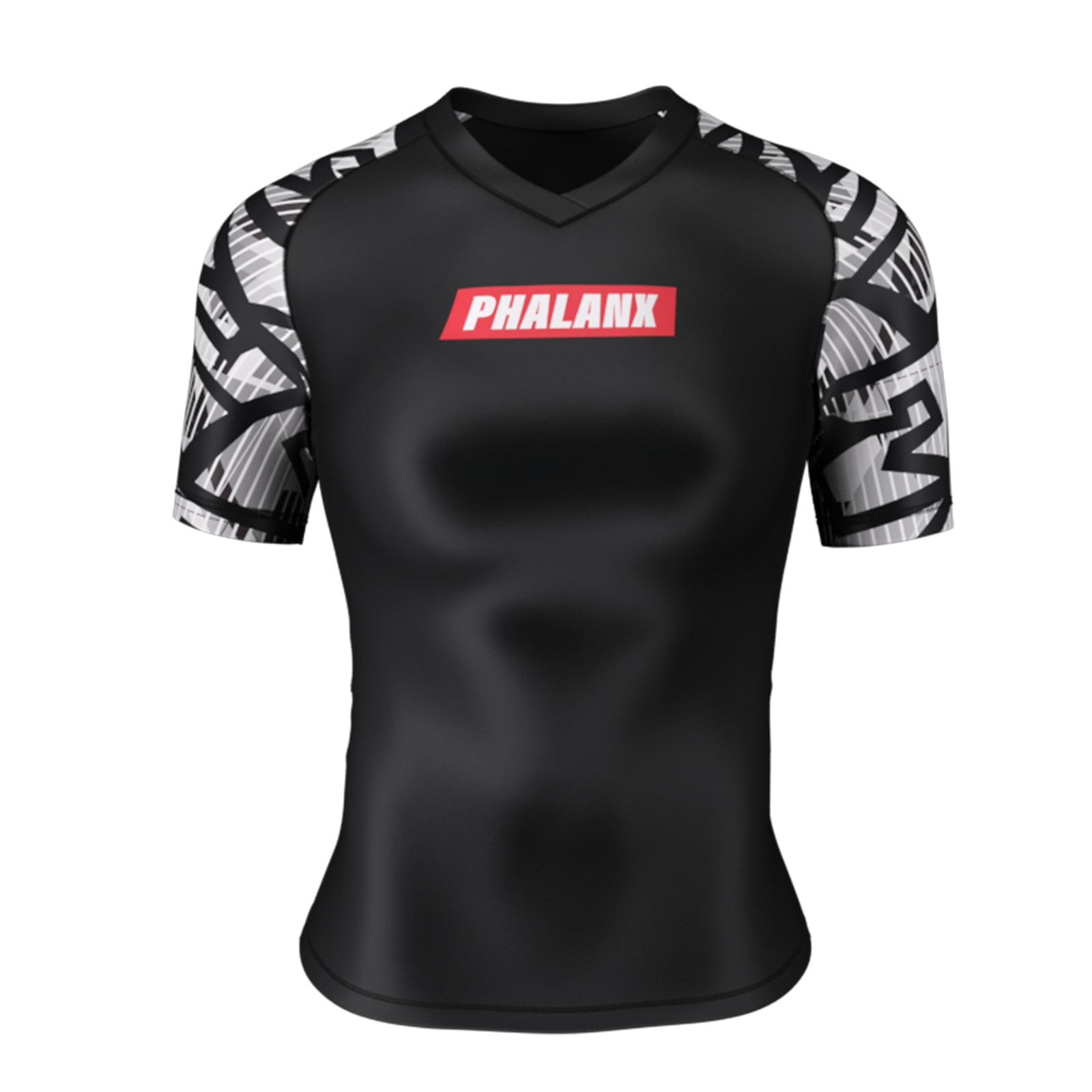 The Phalanx "Premier" short sleeve rash guard is designed with the athlete in mind. It features sublimated designs that will never crack or fade, moisture-wicking fabric to keep you dry during your workout, flat lock stitching for superior comfort and durability, and SPF protection to stay safe in the sun.