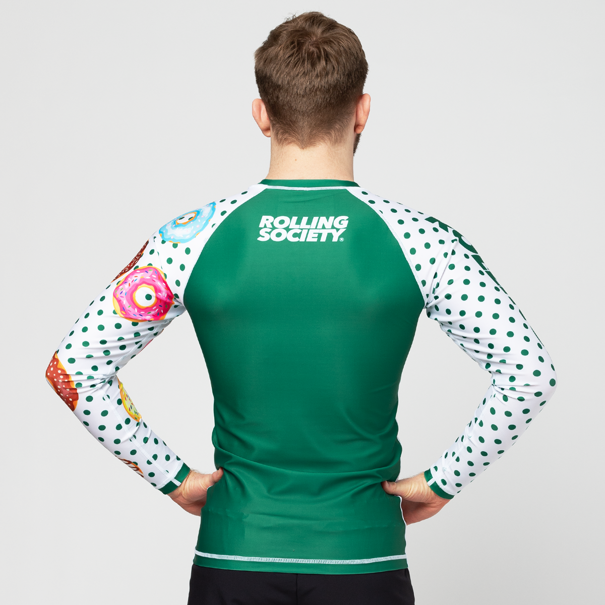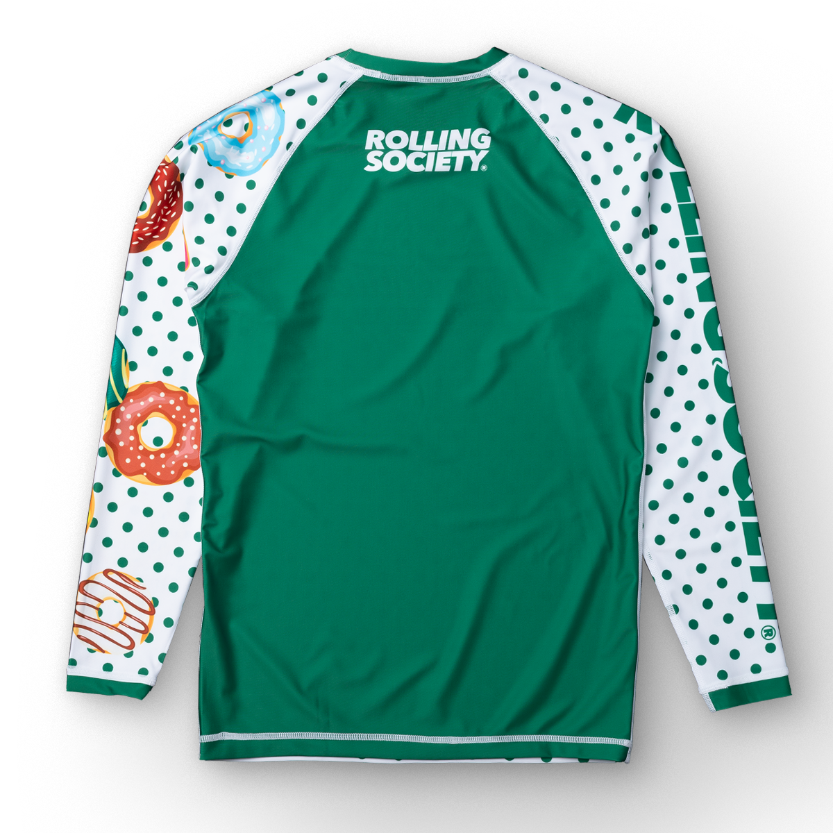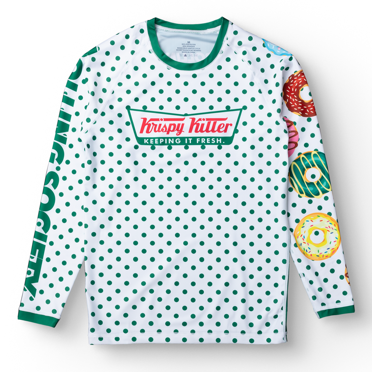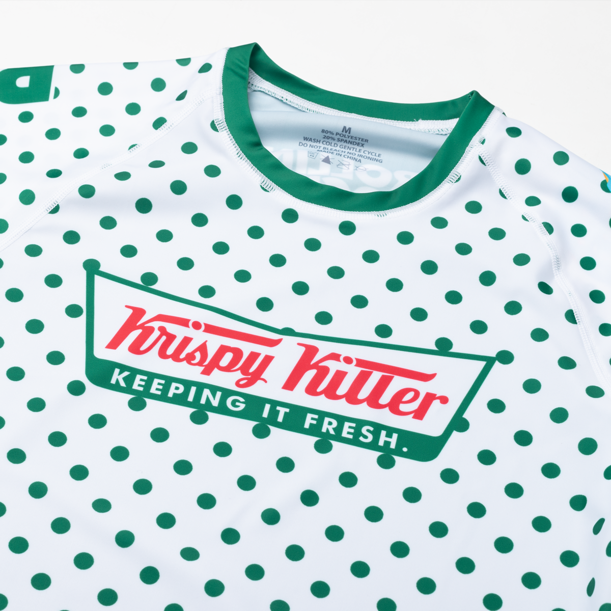 Roll in style and sprinkle in some humor with Rolling Society's "Krispy Killer" rash guard. With sublimated donut artwork that's so realistic you'll have to remind your opponents not to take a bite. Constructed with a classic polyester/Spandex blend and flexible flatlock stitching.