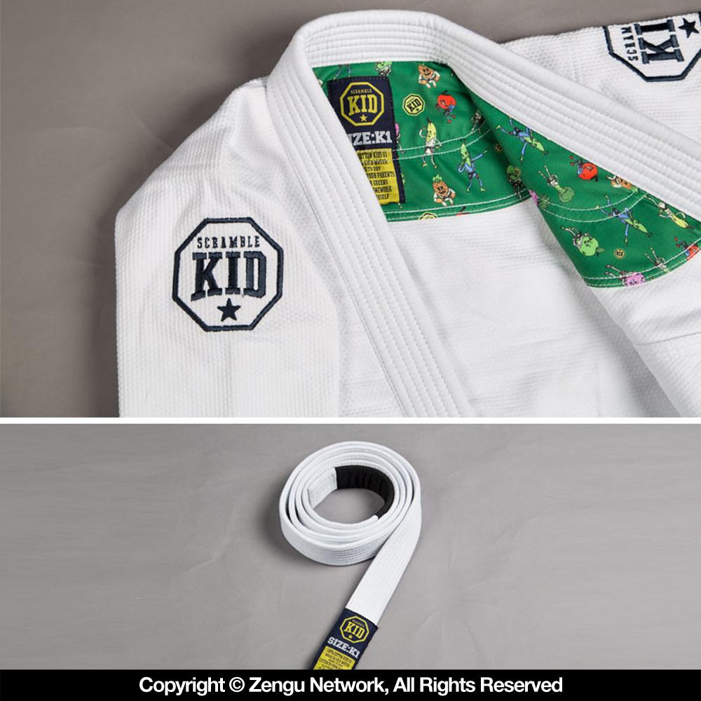 Well made BJJ kimonos by Scramble, made for the grappling youth! Using lightweight yet resilient fabrics, the Scramble Kids Gi is sure to pass the test of time while also being comfy enough for your child to be happy wearing it. The sublimated interior shoulder panel features colorful artwork to give it that playful vibe. Equipped with an elastic waistband and adjustable drawstring, so if you order a size up (so they grow into it), the elastic will help the pants work.