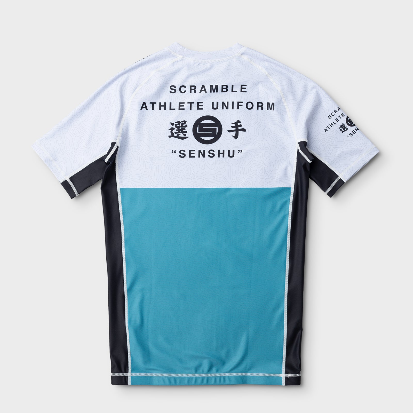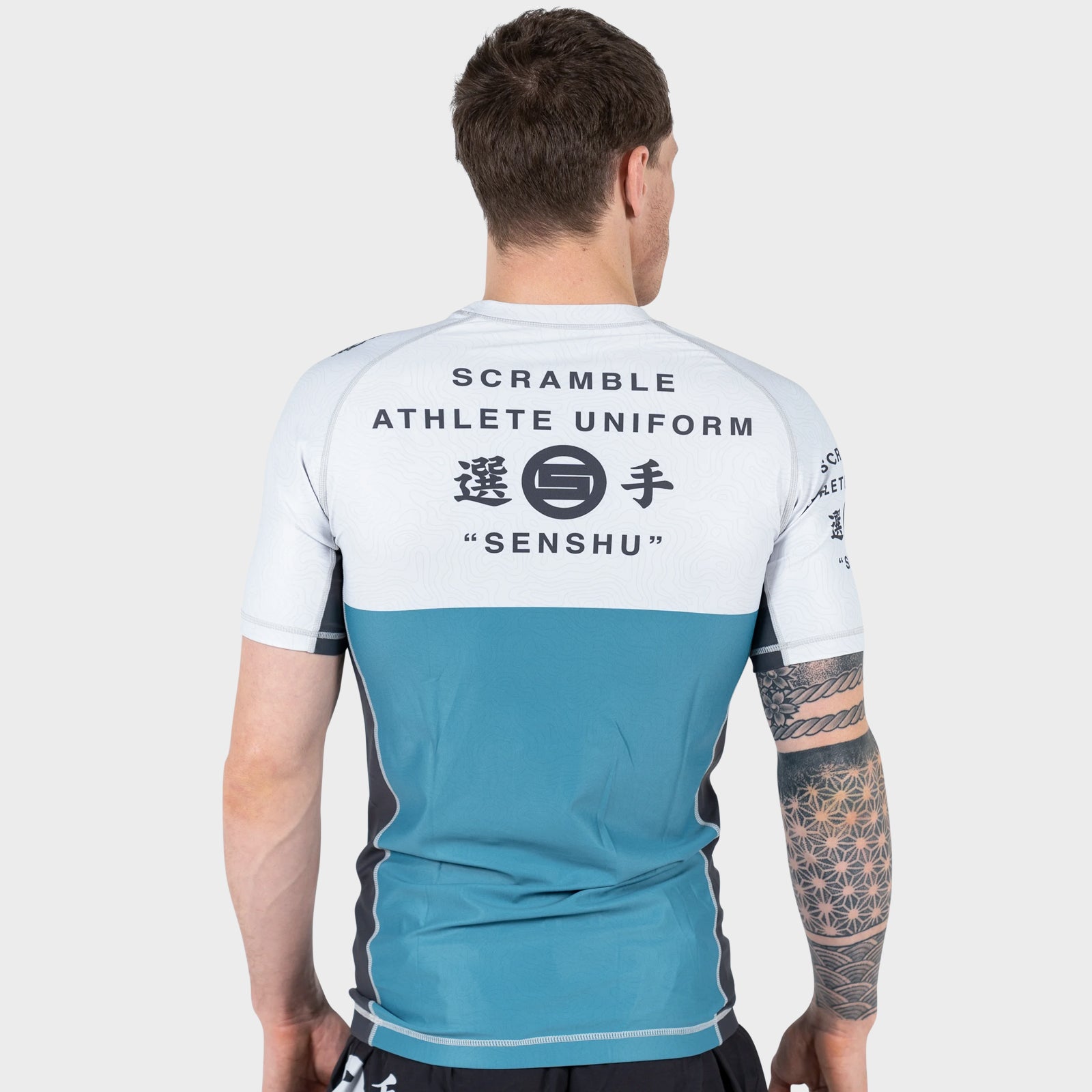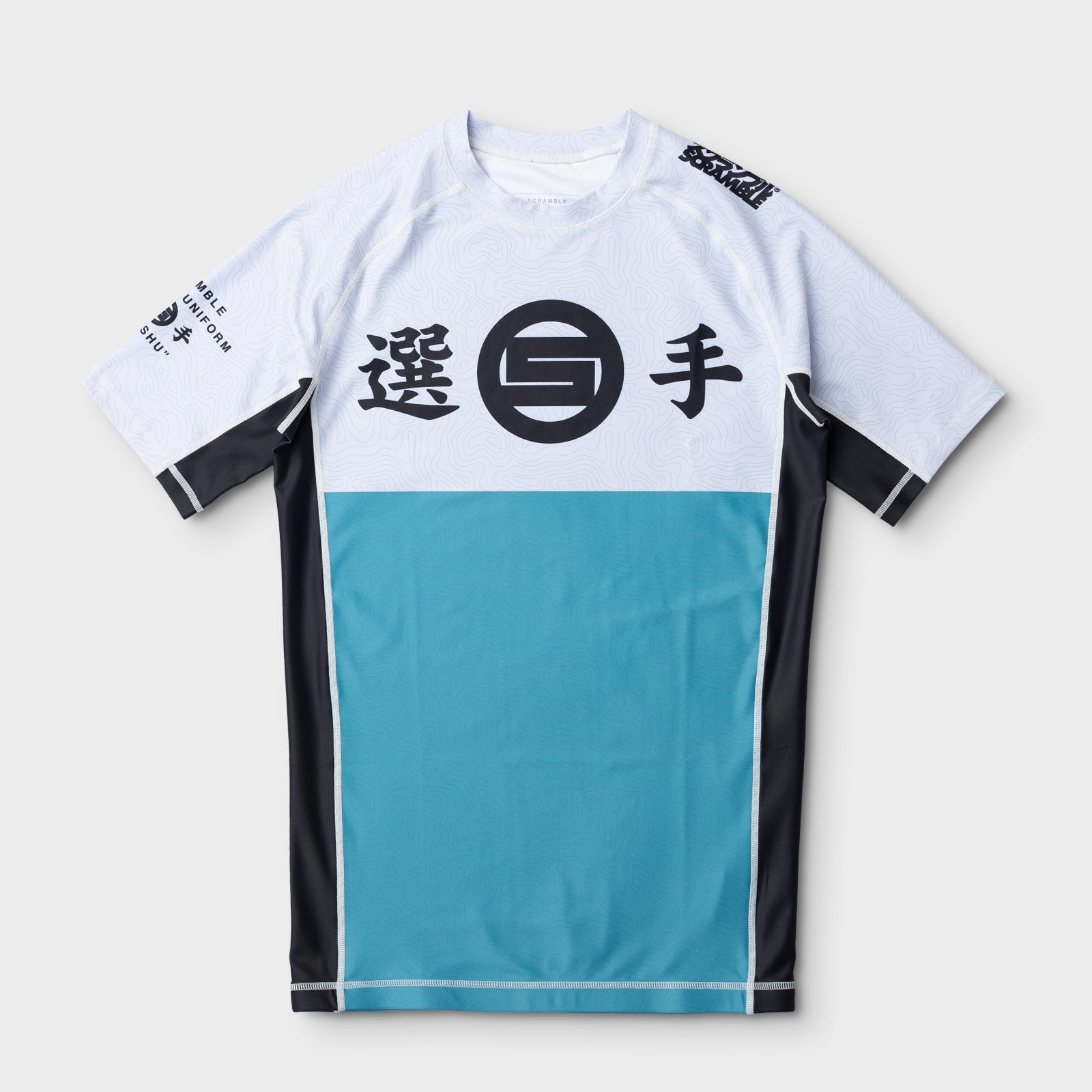 Scramble's Senshu range is worn by athletes competing at the highest levels of grappling, jiujitsu, and MMA. The design features a neutral color palette, subtle patterns within the color blocks, and their distinctive blend of traditional Japanese styles with bold Western typography.