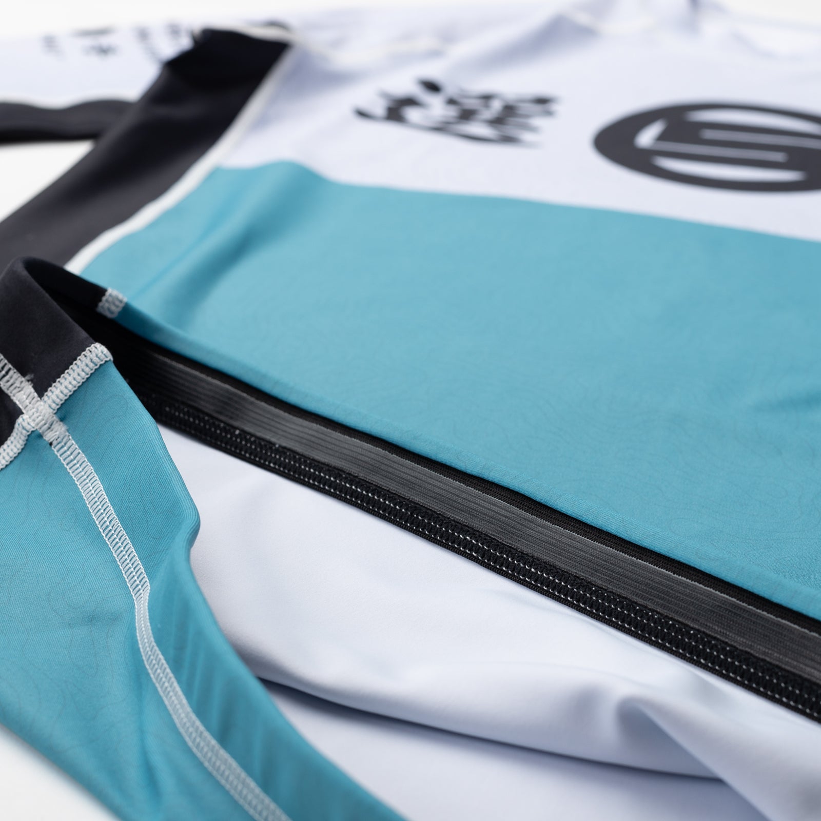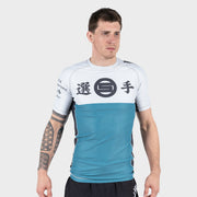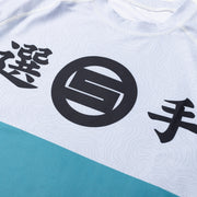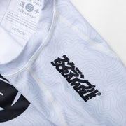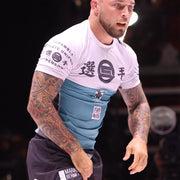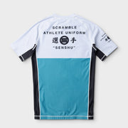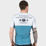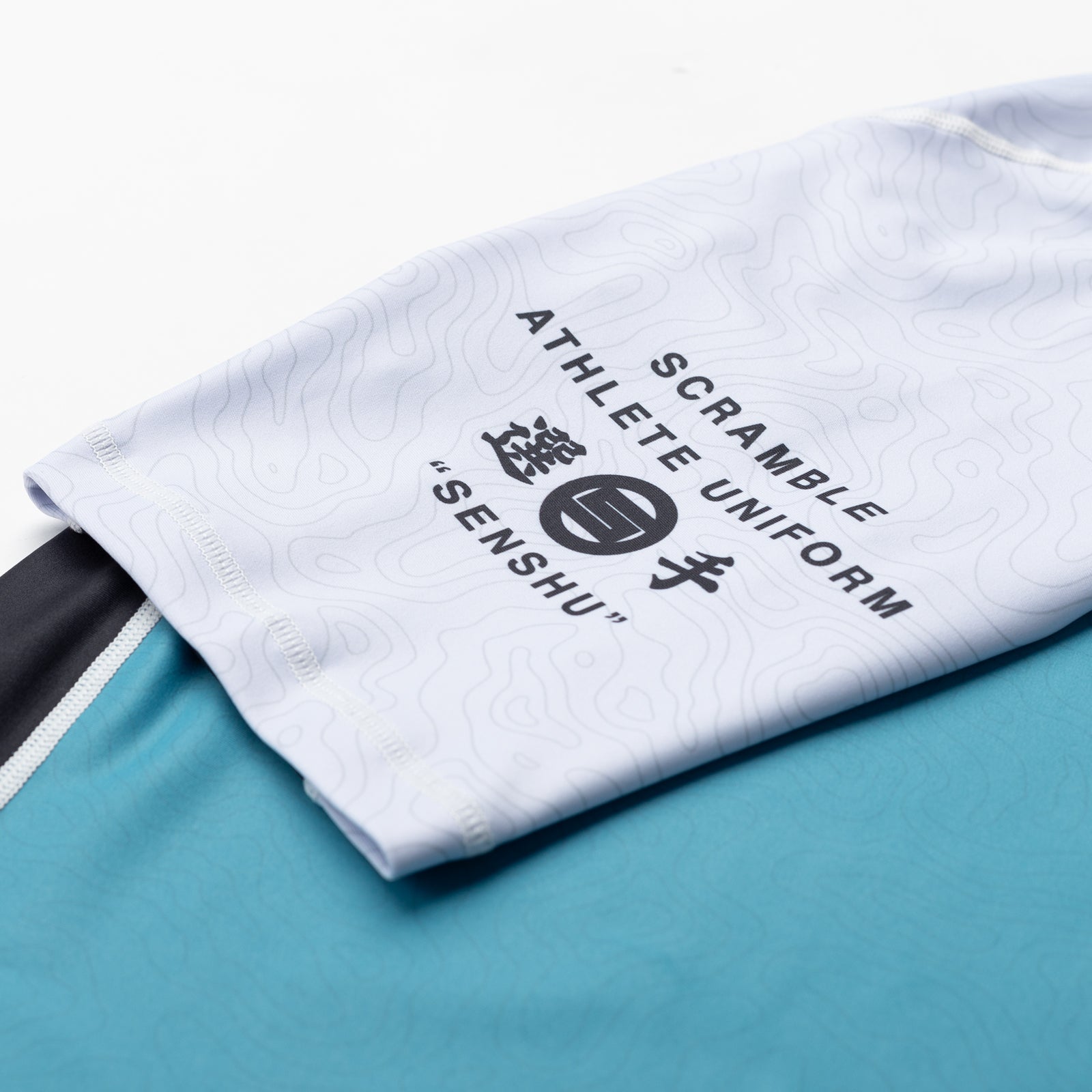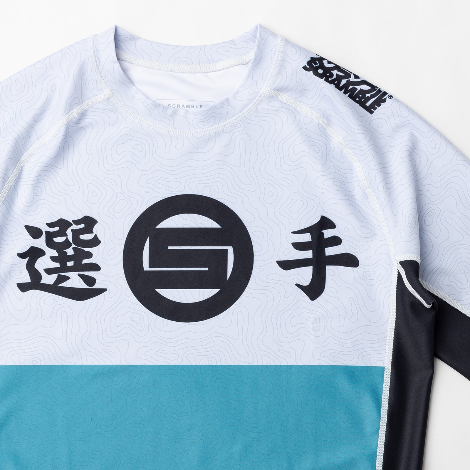 Scramble's Senshu range is worn by athletes competing at the highest levels of grappling, jiujitsu, and MMA. The design features a neutral color palette, subtle patterns within the color blocks, and their distinctive blend of traditional Japanese styles with bold Western typography.