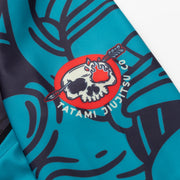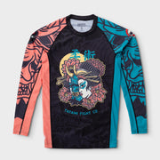 This rash guard features some Japanese inspired artwork with beautiful coral and blue accents. All designs are fully sublimated into the material.