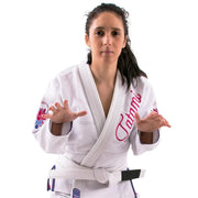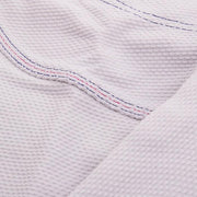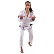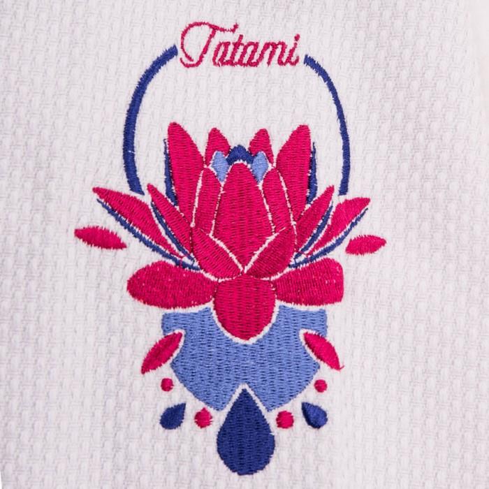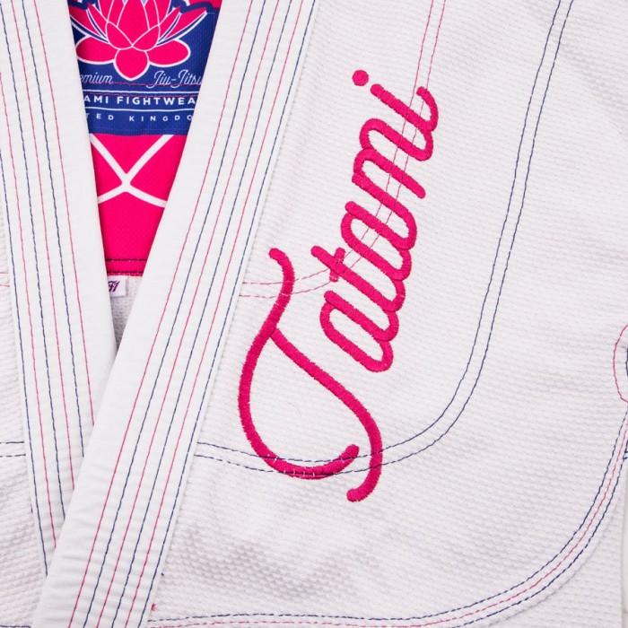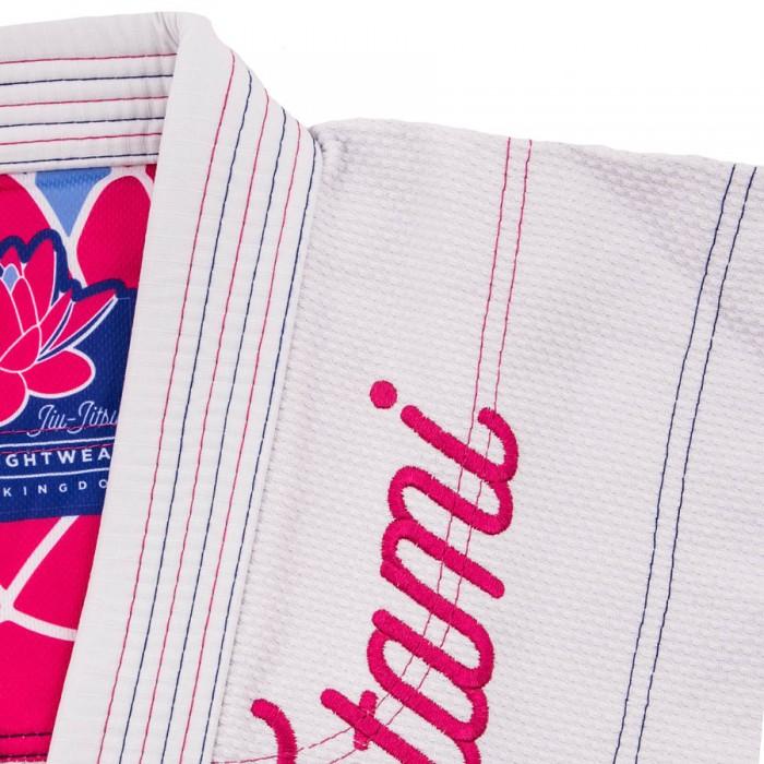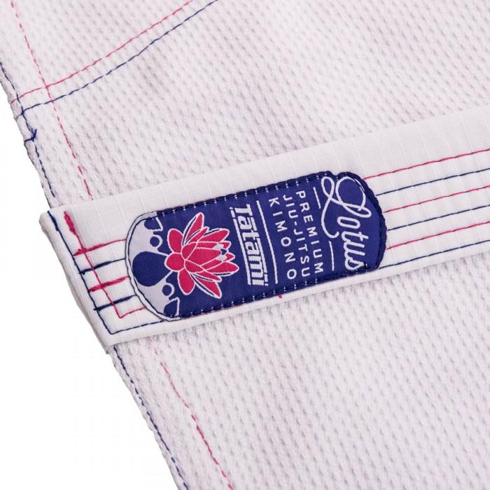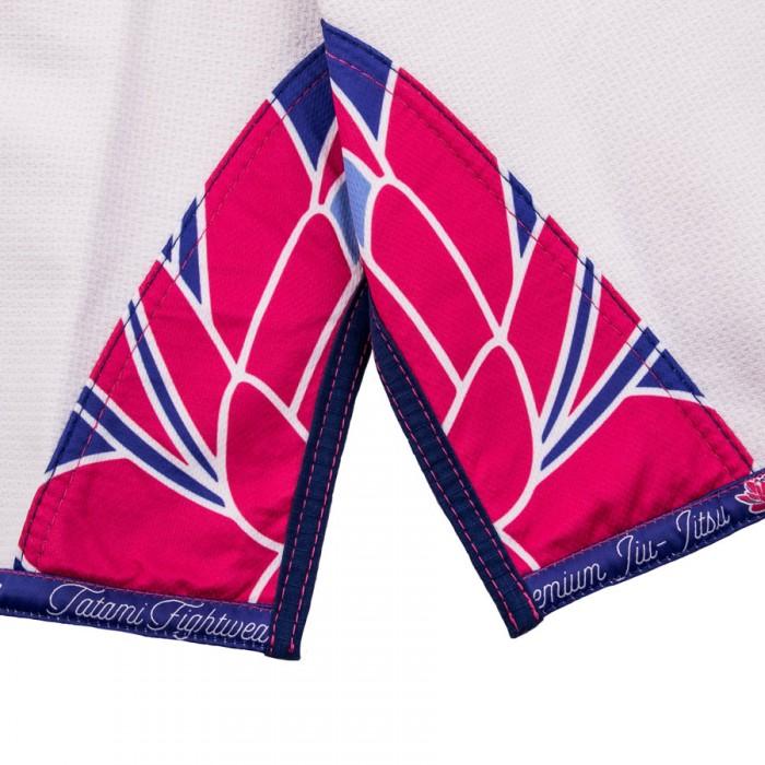 Tatami's latest women's edition Gi, the Lotus, features their usual attention to detail along with some other improvements and additions. Our favorite detail is the two-tone contrast stitching, where all the threads alternate between pink and purple. A similar color scheme is followed along the interior reinforcement panels (which are sublimated mesh).