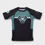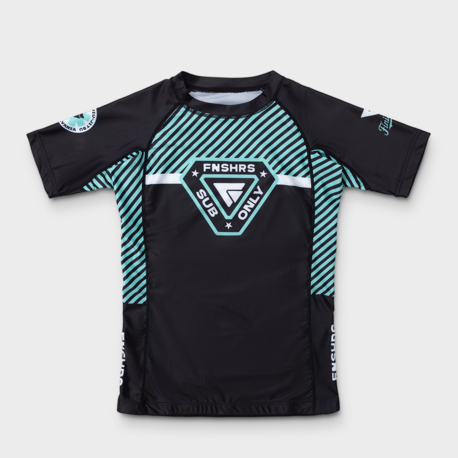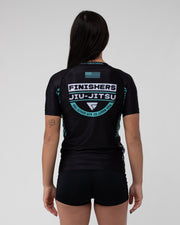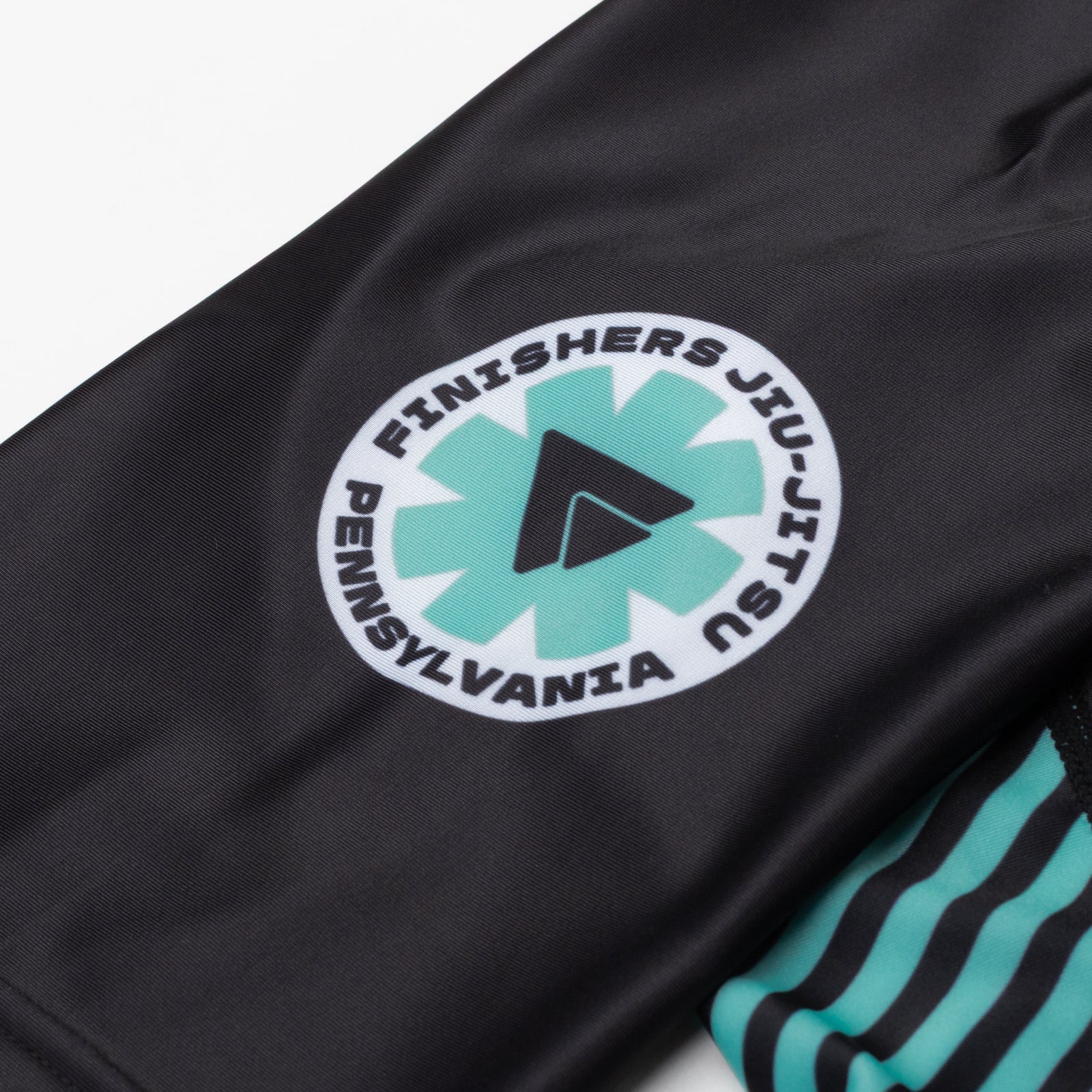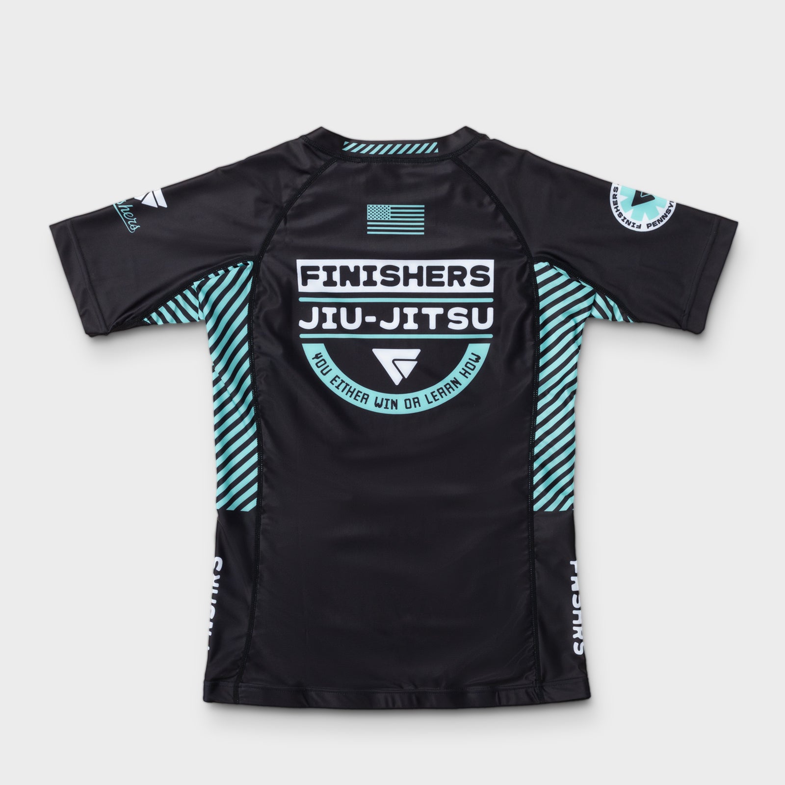 The Finisher's "Win or Learn How" rash guard makes a great compression top for Nogi training. It's constructed with a sturdy poly/spandex blend, flatlock stitching, and a grip lining at the waist to keep the rash guard secure while rolling. Classic Finisher's branding and designs are sublimated into the fabric with a beautiful light teal accent color. The model is 5'4" 125 lbs wearing women's small.