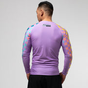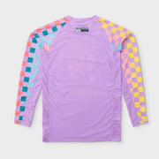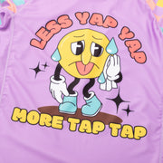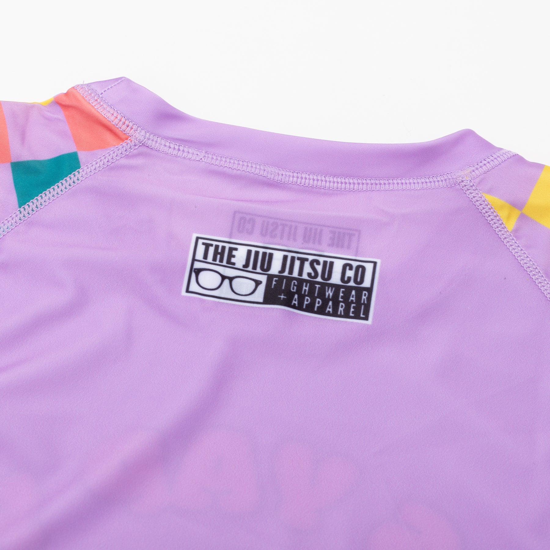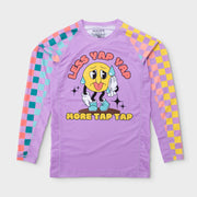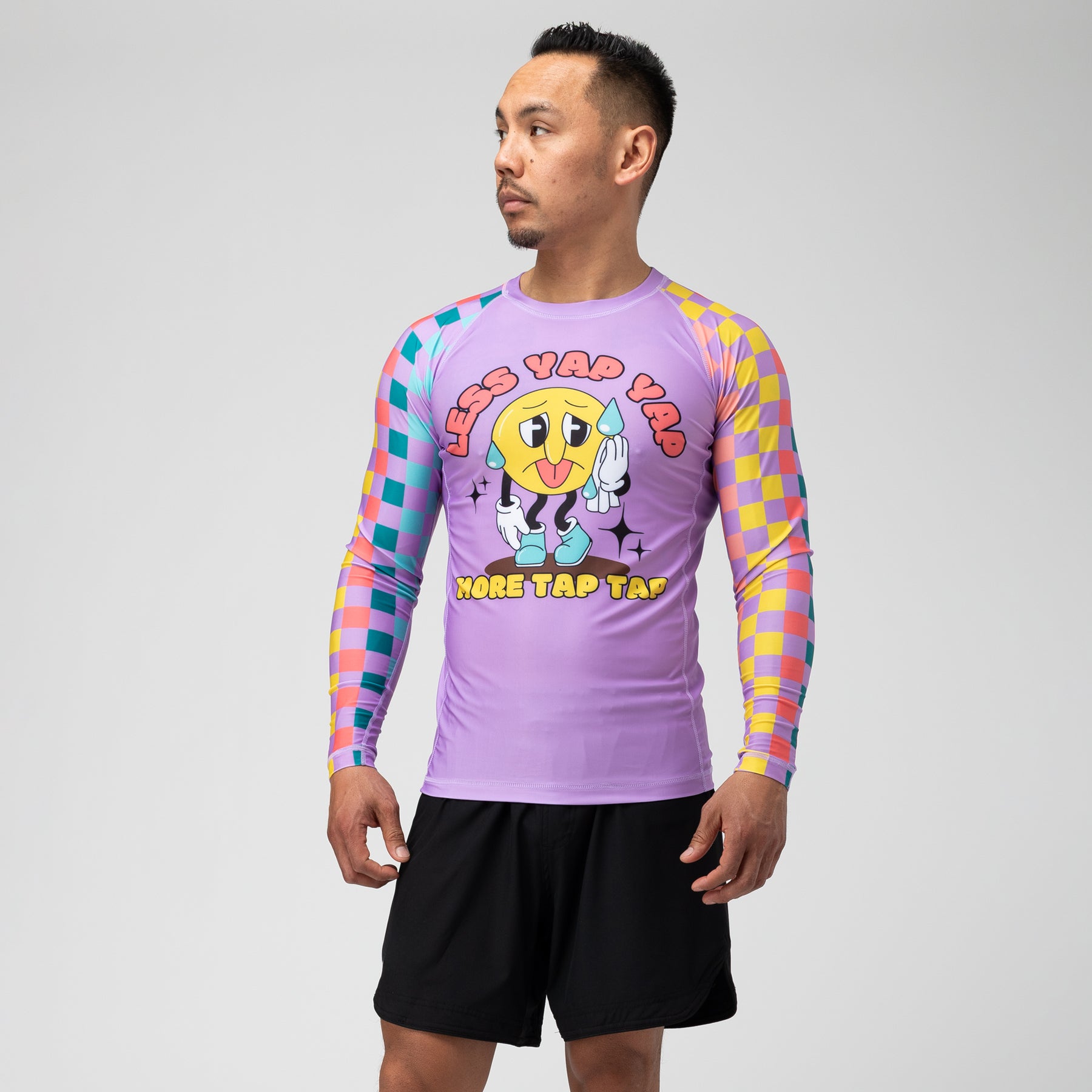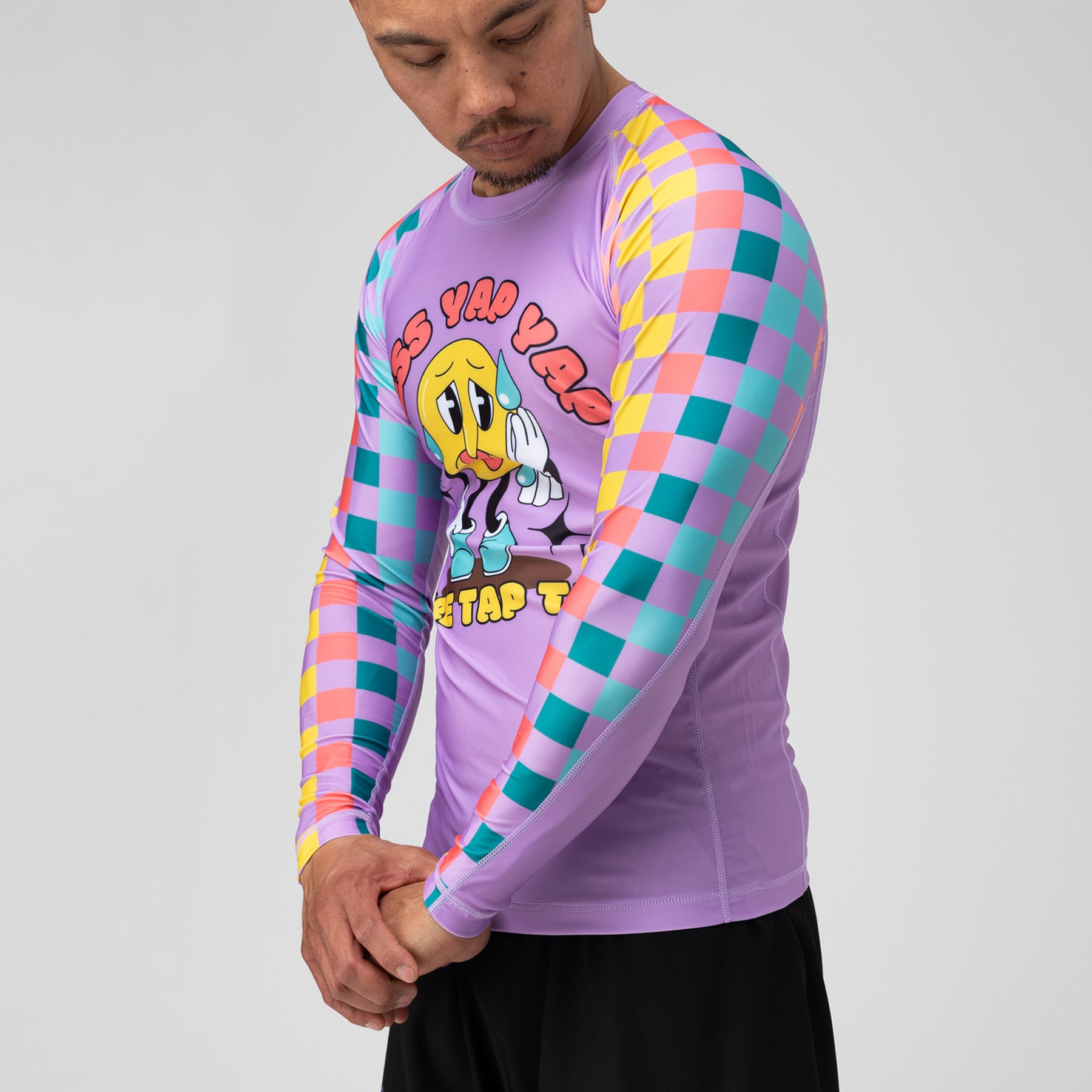 Introducing The Jiu Jitsu Company's vibrant purple Yap Yap rash guard! This cartoon-style design serves as a bold reminder to prioritize action over words.