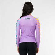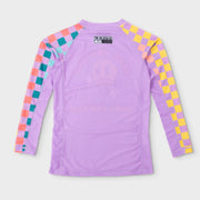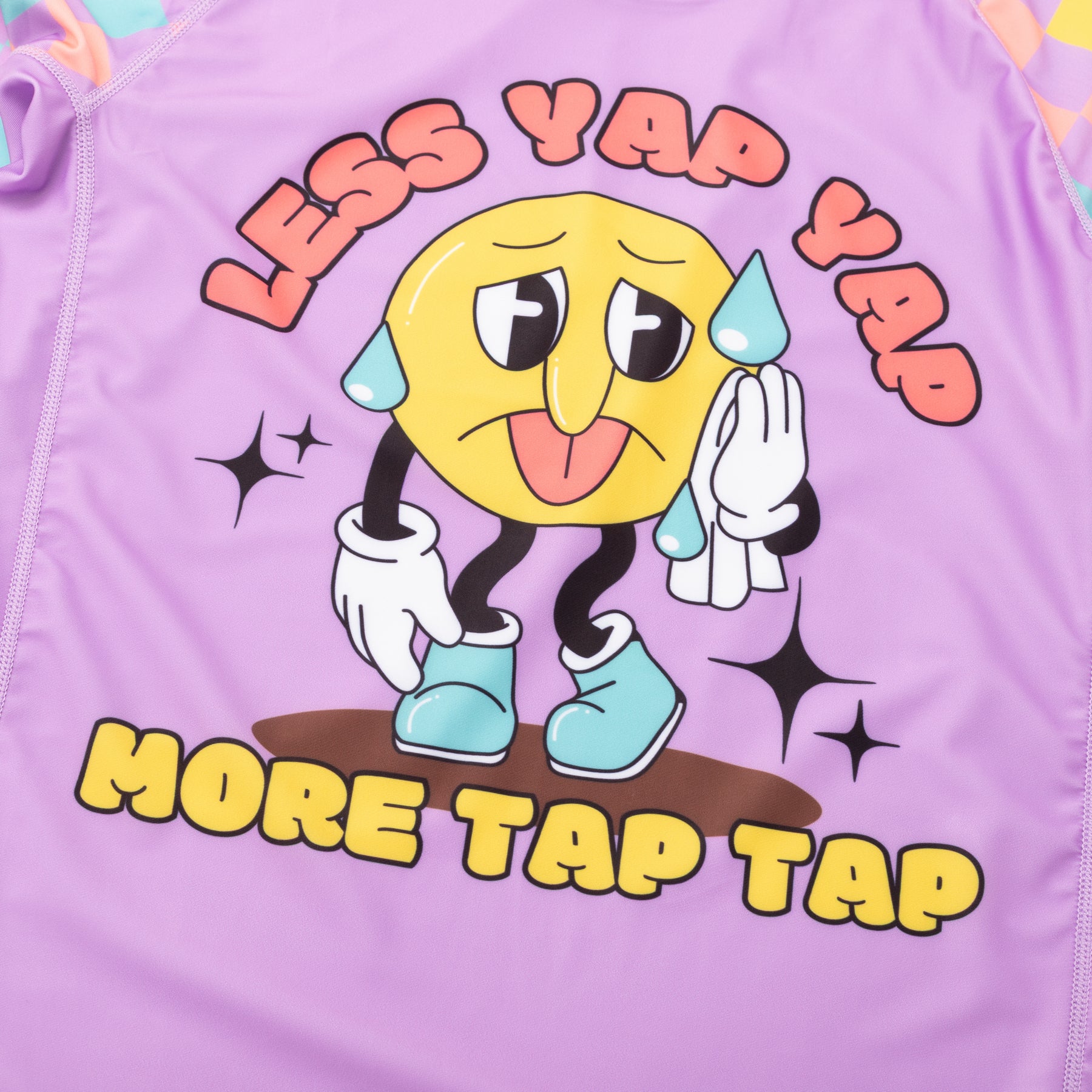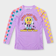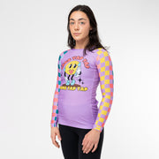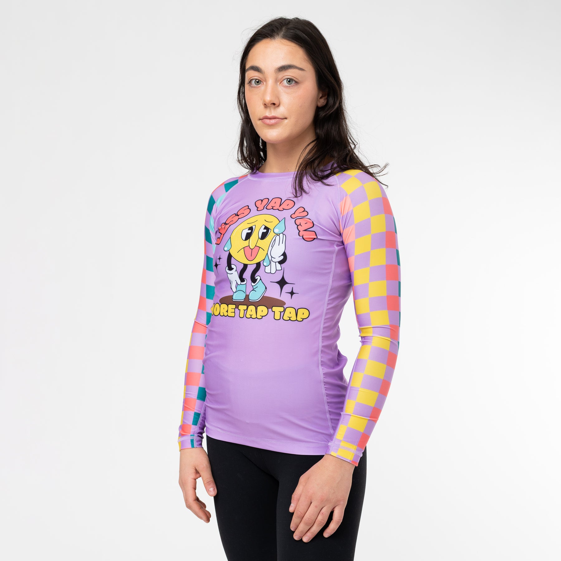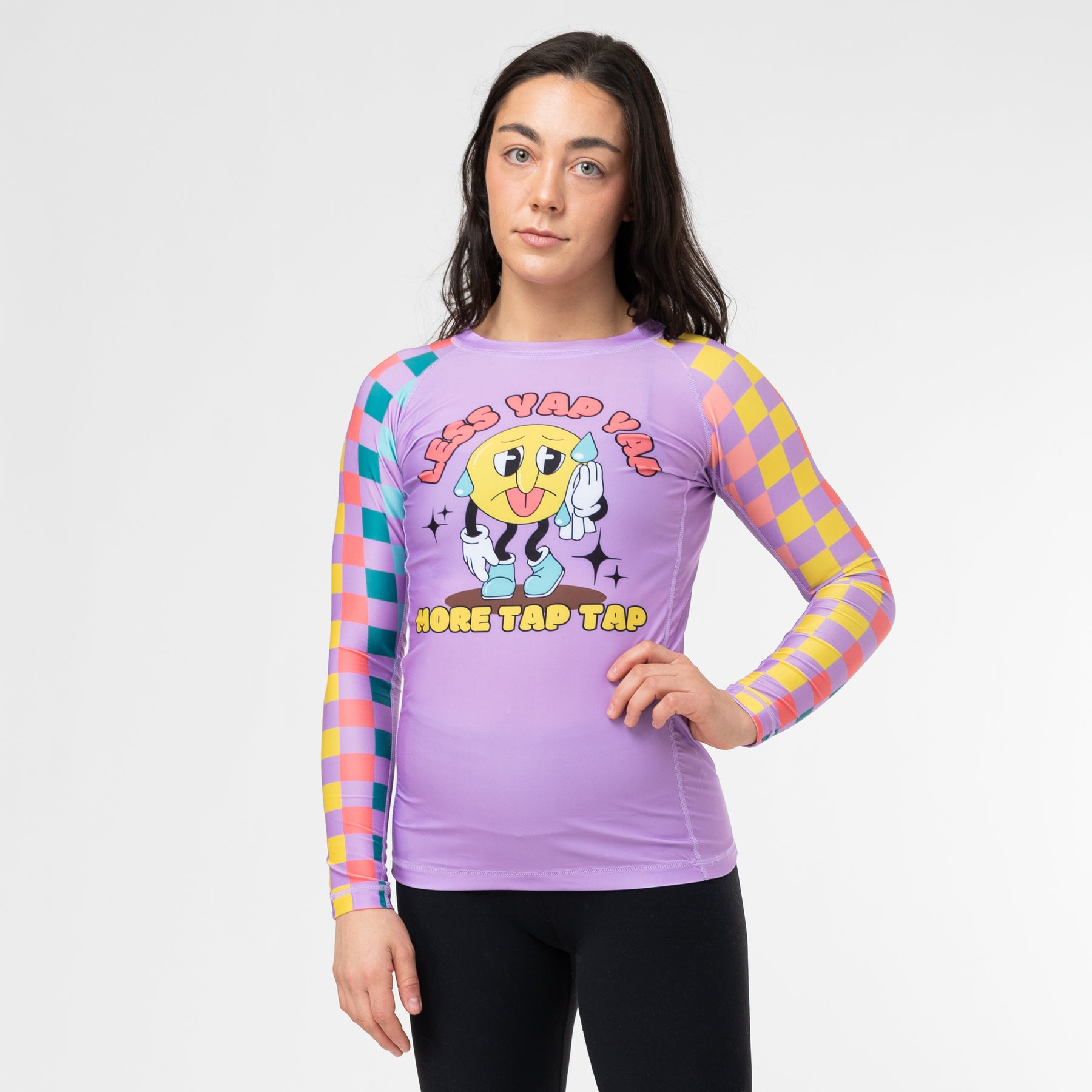 Introducing The Jiu Jitsu Company's vibrant purple Yap Yap rash guard! This cartoon-style design serves as a bold reminder to prioritize action over words. The model is 5'4" 125 lbs wearing women's small.