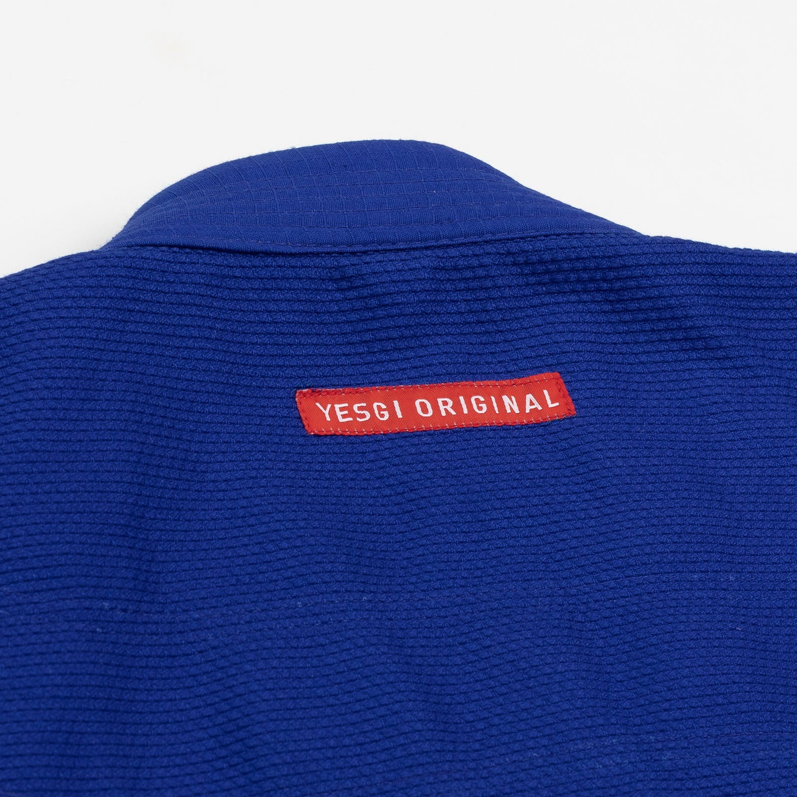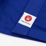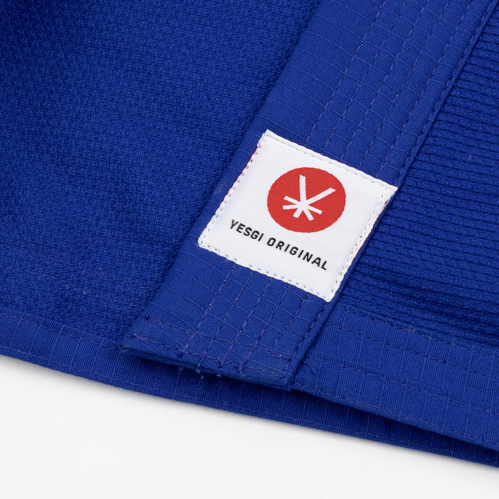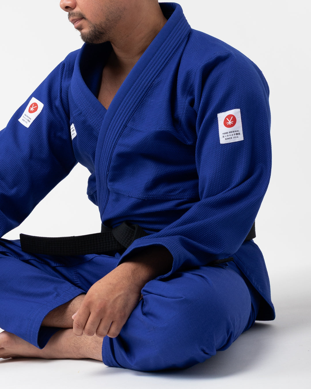 The blue Yesgi Original Kimono is a minimalist design with subtle branded patches and no contrasting stitching. It features a mid-weight 450 gsm top paired with 10 oz pants. The pearl weave jacket includes rounded vents and reinforced cuffs and hem, while the ripstop pants come with multiple drawstring loops and reinforced knees.