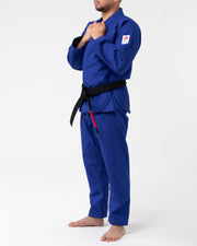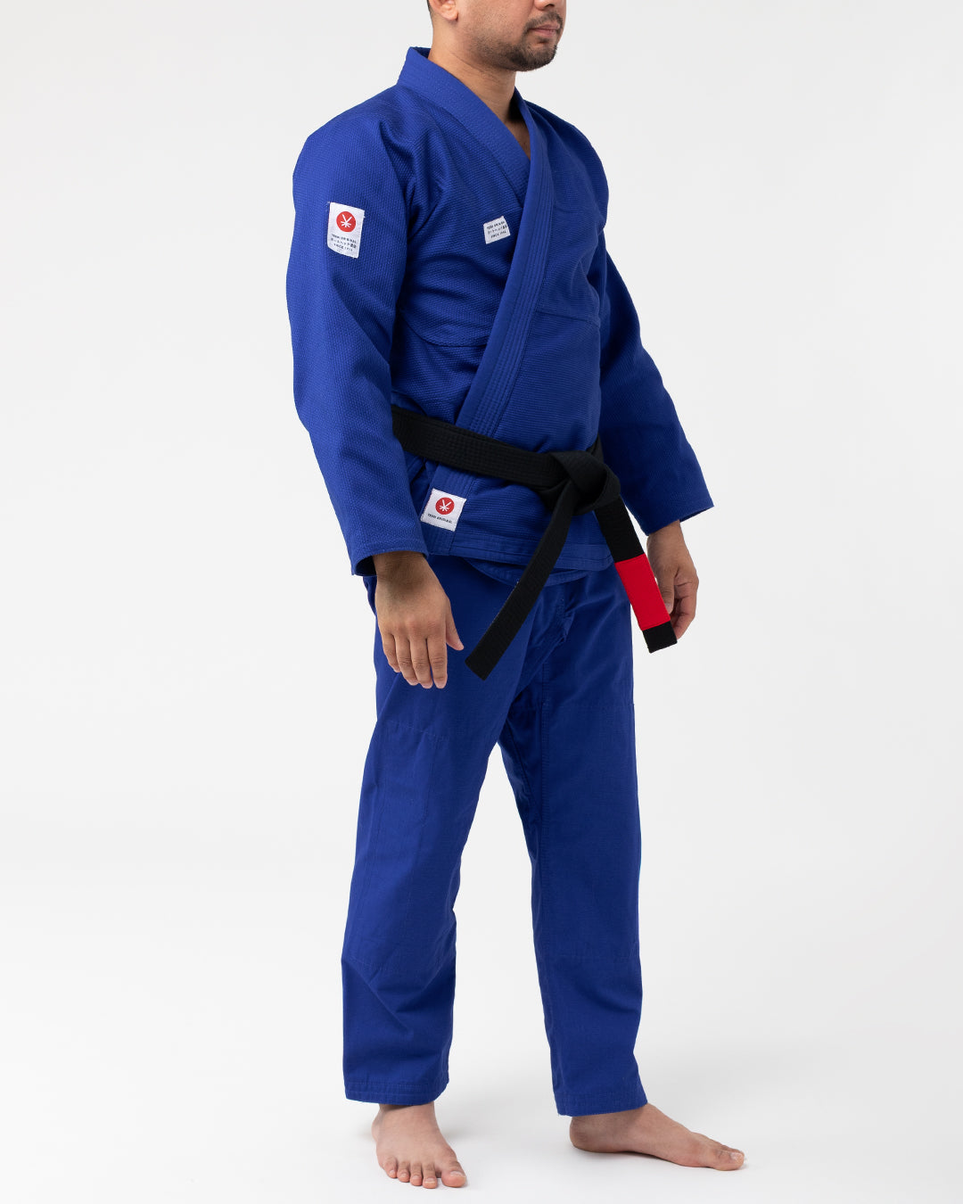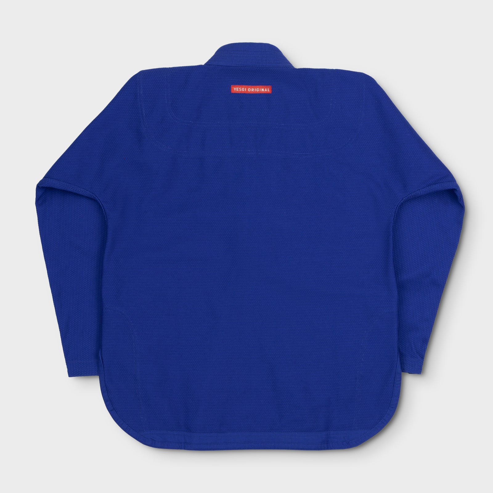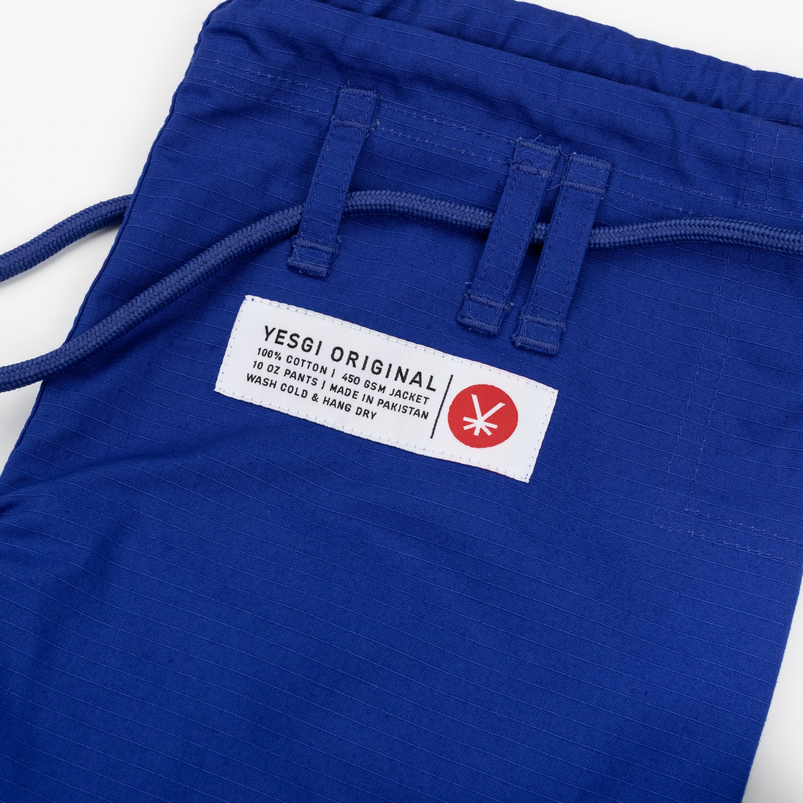The blue Yesgi Original Kimono is a minimalist design with subtle branded patches and no contrasting stitching. It features a mid-weight 450 gsm top paired with 10 oz pants. The pearl weave jacket includes rounded vents and reinforced cuffs and hem, while the ripstop pants come with multiple drawstring loops and reinforced knees.