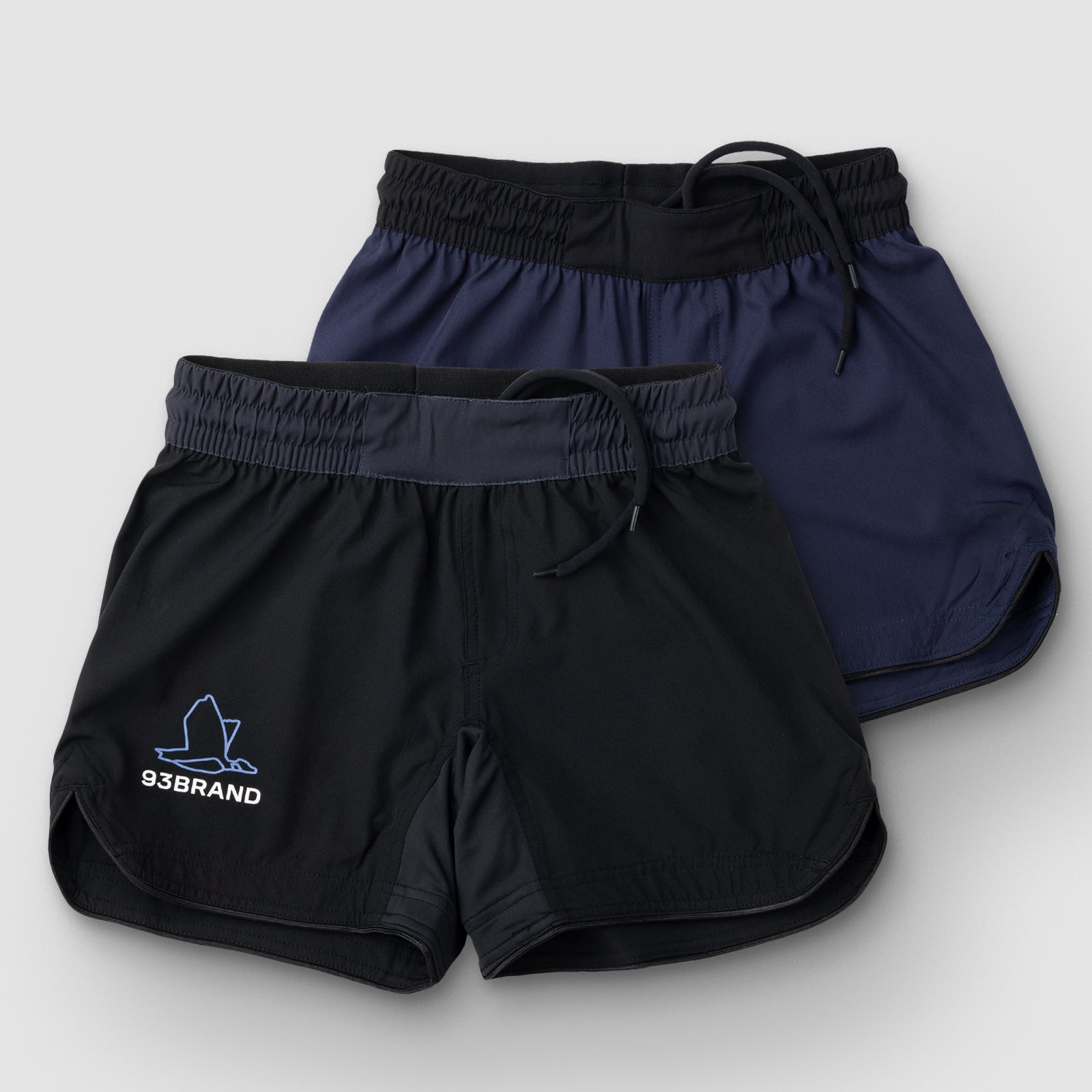 93brand is back with another legendary Standard Issue 2pack. Each order includes one midnight black and one French navy colorway. They're constructed with a soft and lightweight poly/Spandex material that's ideal for grappling. Notably, these Standard Issue shorts feature an elastic waistband and a cushioned drawstring to secure the fit—no Velcro closure! Both pairs have minimal branding with a small print on the right leg.