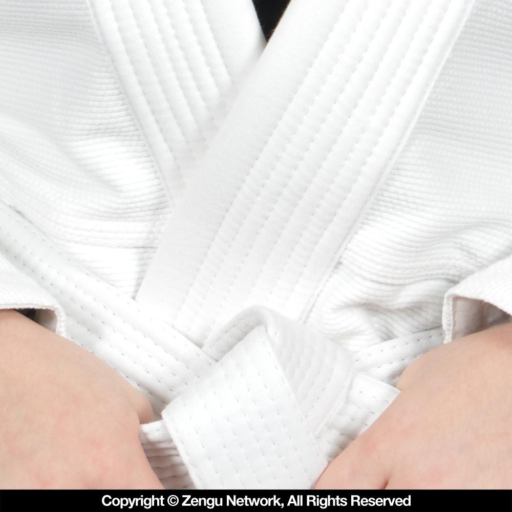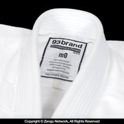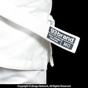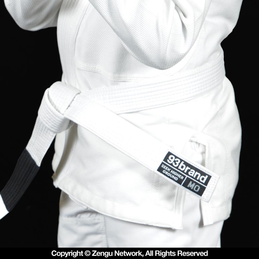 This all-white kimono has absolutely no patches, tags, or embroideries on the exterior. Not even a manufacturer's label at the bottom of the lapel or little logo on the thigh. It is truly a modest all-white uniform. Whether you want to patch it up or leave it plain is your call, and you'll have that option with the money saved. . . Since the bling is absent, 93 is able to devote development toward improving quality rather than looks, all while keeping the price nice and low.