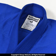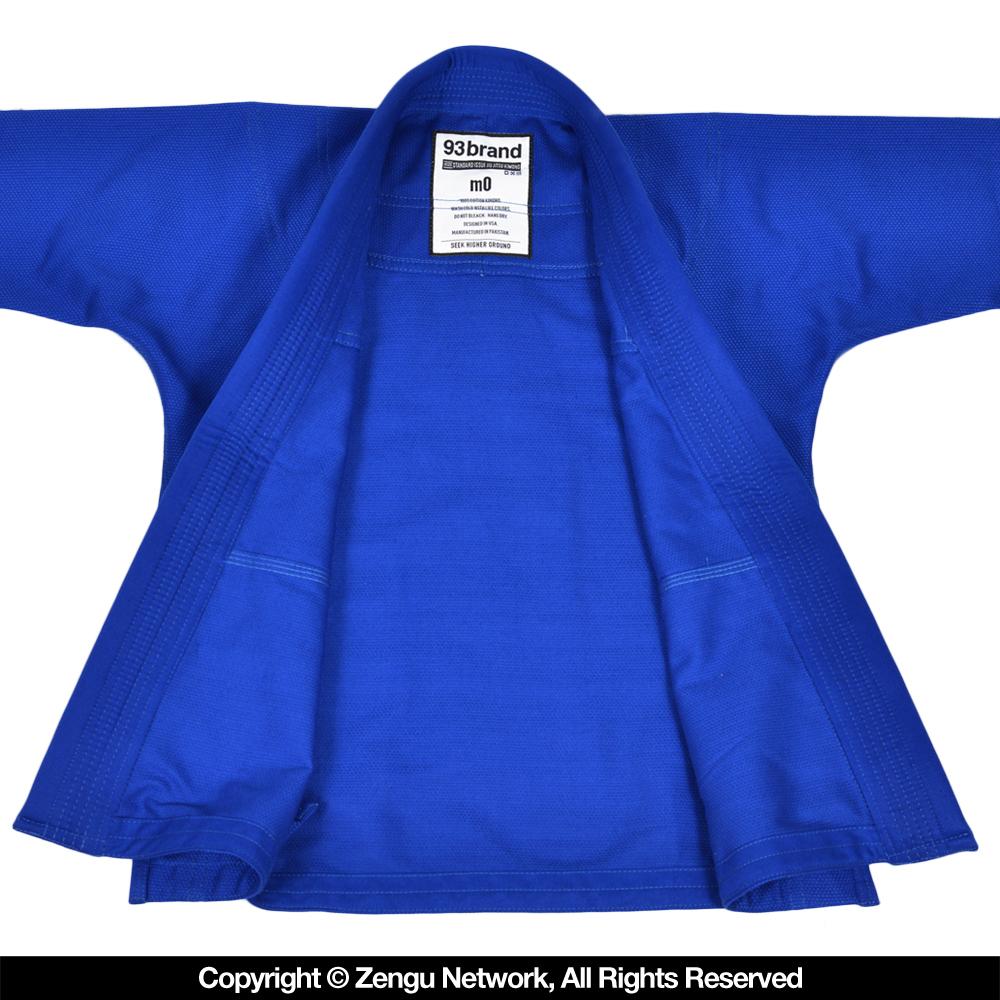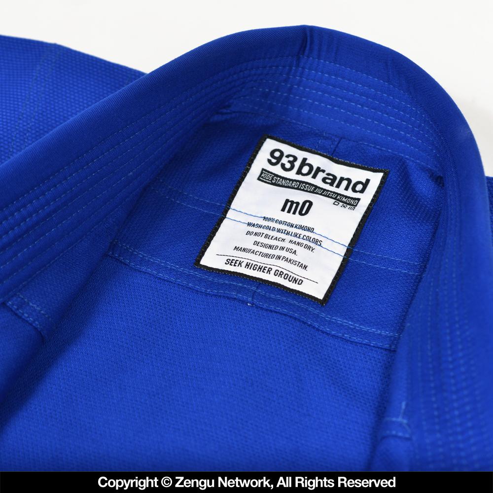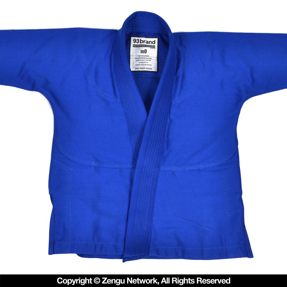 This all-blue kimono has absolutely no patches, tags, or embroideries on the exterior. Not even a manufacturer's label at the bottom of the lapel or little logo on the thigh. It is truly a modest all-blue uniform. Whether you want to patch it up or leave it plain is your call, and you'll have that option with the money saved. . . Since the bling is absent, 93 is able to devote development toward improving quality rather than looks, all while keeping the price nice and low.