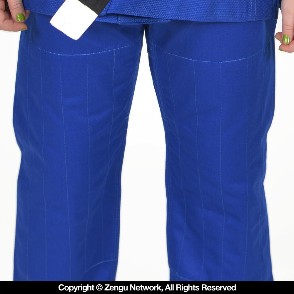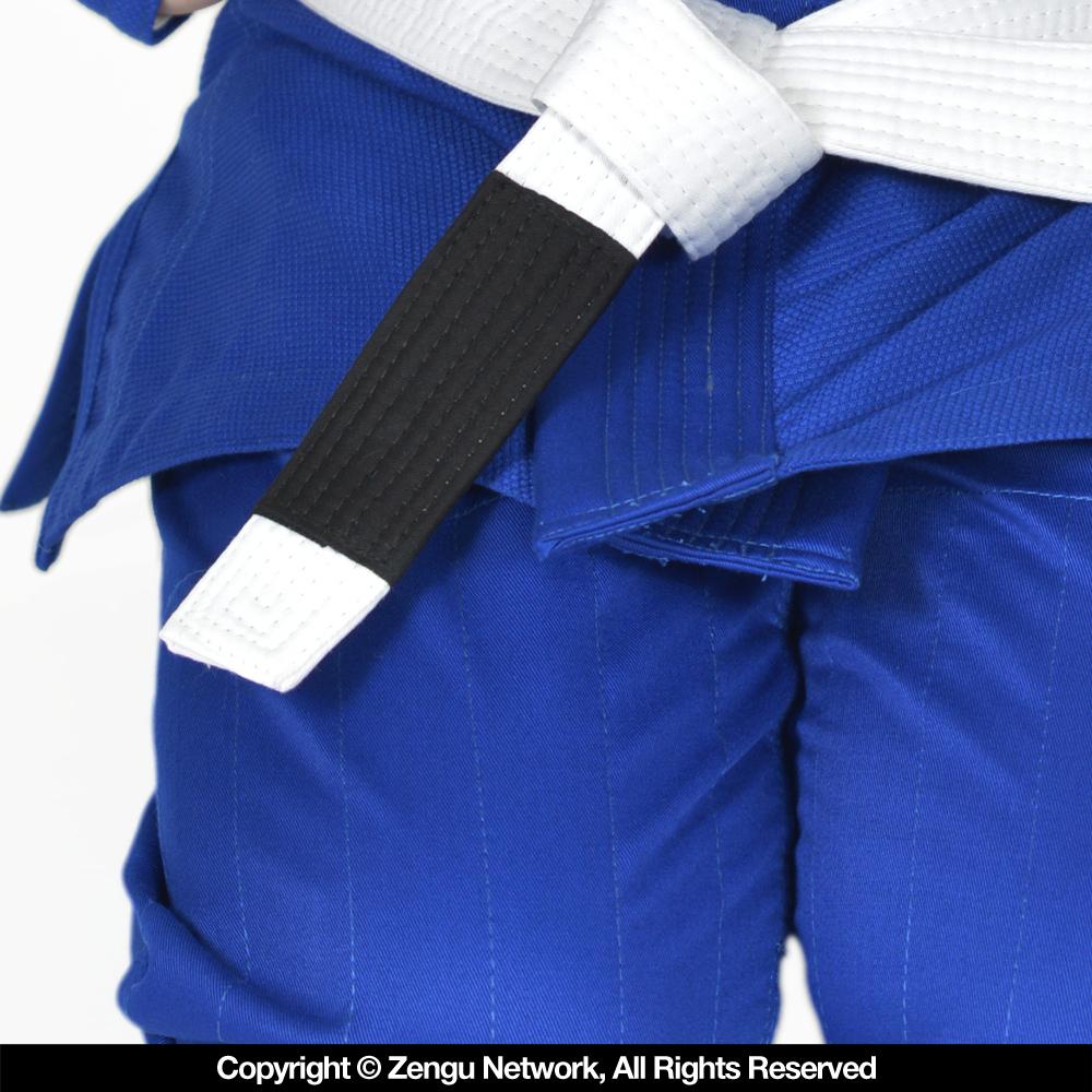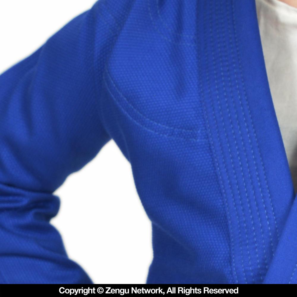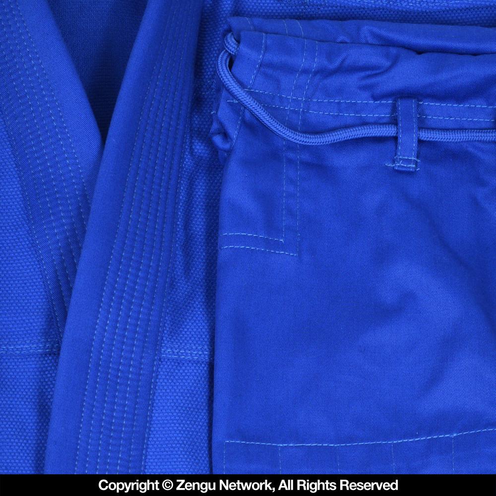 This all-blue kimono has absolutely no patches, tags, or embroideries on the exterior. Not even a manufacturer's label at the bottom of the lapel or little logo on the thigh. It is truly a modest all-blue uniform. Whether you want to patch it up or leave it plain is your call, and you'll have that option with the money saved. . . Since the bling is absent, 93 is able to devote development toward improving quality rather than looks, all while keeping the price nice and low.