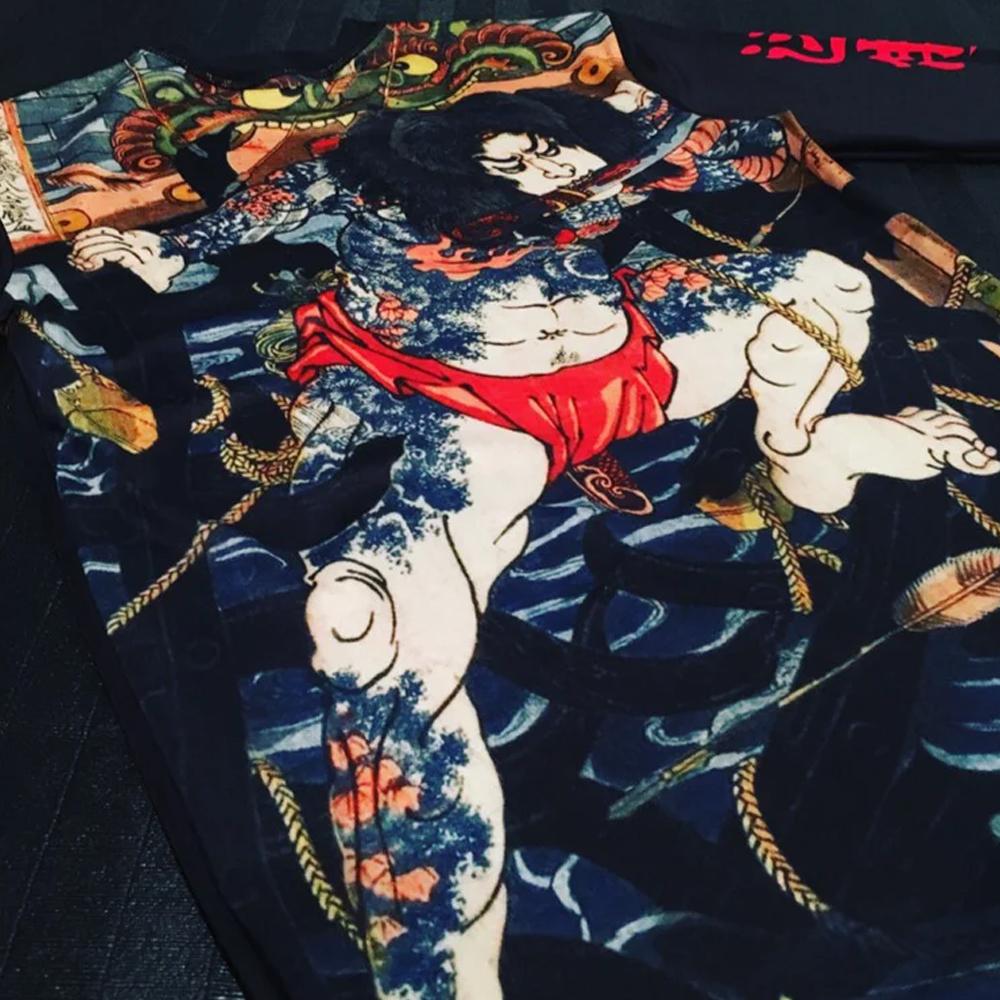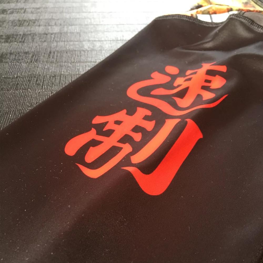 Behold the "Raging Samurai" Long sleeve Rash Guard. Authentic period art depicting a Tattoo'd Samurai slicing through the competition, this rash guard is soon to be one of your favorites. The quality of the printing can not be overstated! "Hold Fast" translated in Kanji on the right arm, and "Hold Fast" the length of the left.