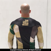 Do or Die is back with another outstanding compression top, complete with fully sublimated colors and sharp graphics. The original camo pattern looks great on their long-sleeve cut, accented with solid black side panels and solid black chest graphics. The comfortable 12-panel design provides very consistent compression from top to bottom, and - thanks to the longer torso cut - there is no riding up while you roll. Each panel is sealed to the next via flatlock seams, each with heavy-duty black threading.