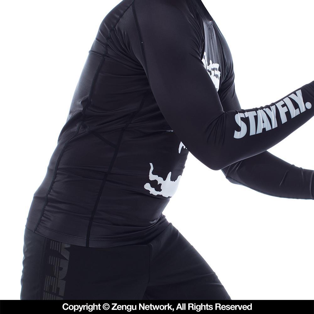 The new Stay Fly Rashguard from Hyperfly. The product consits of a dry fit material which is 92% polyester/8% spandex. Dry Fit materials are designed to keep the sweat away and keep you comfortable.