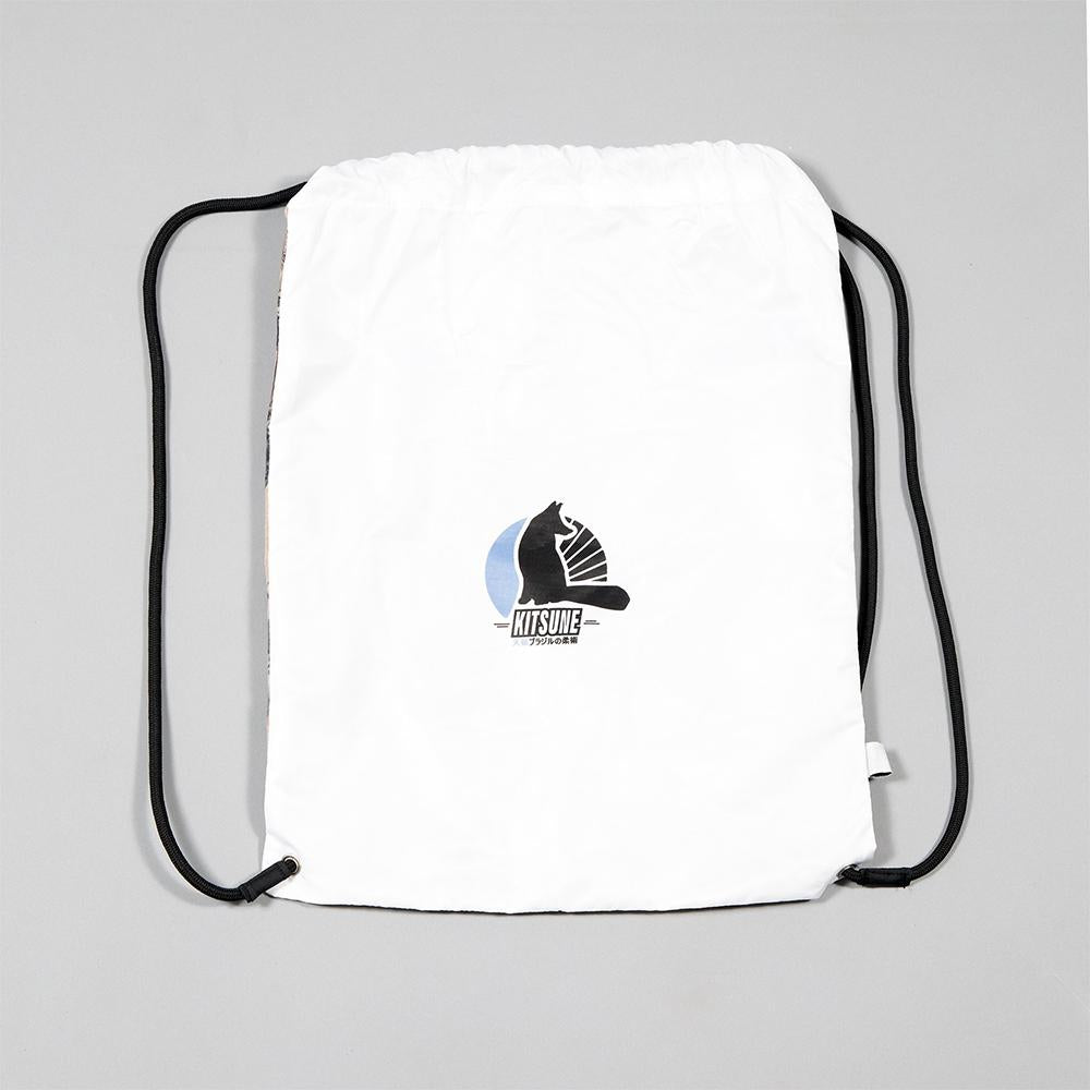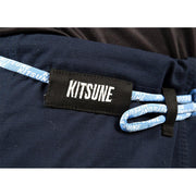 Round stretch drawstring, running through 4 pant loops. The 2 outermost loops are extended (4x as wide as usual loops) and include a KITSUNE embroidery on the right side and a direct print on the left side.