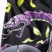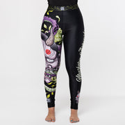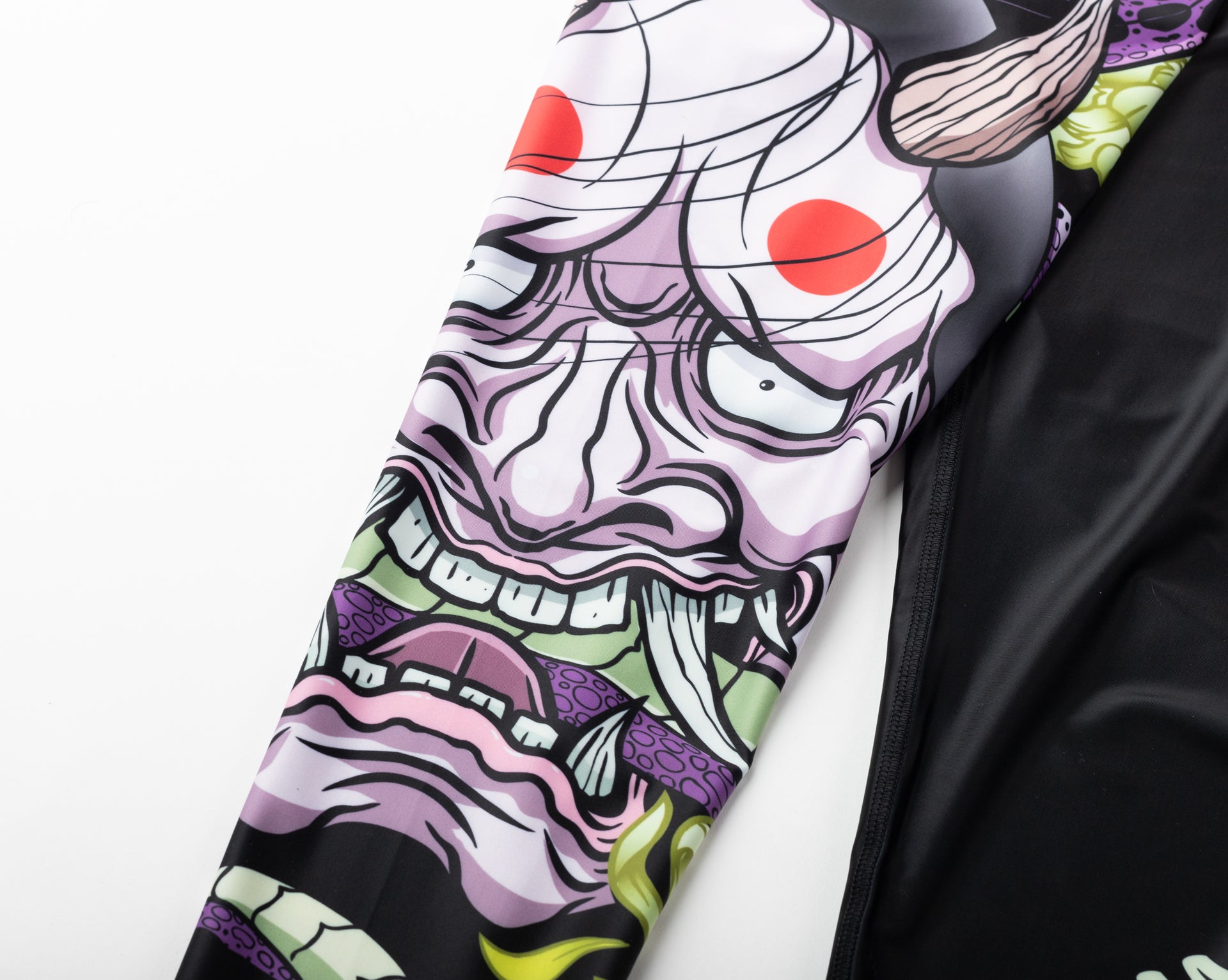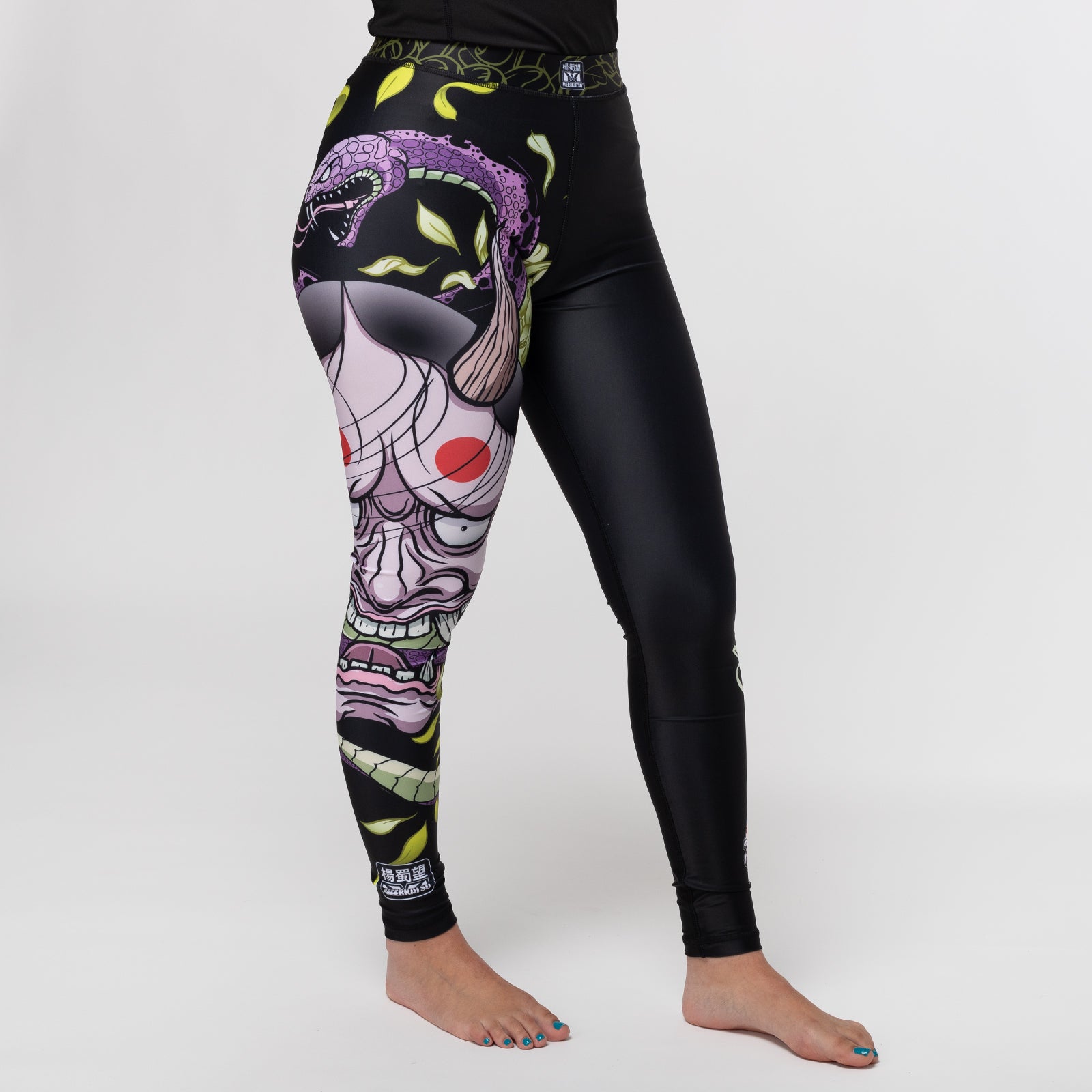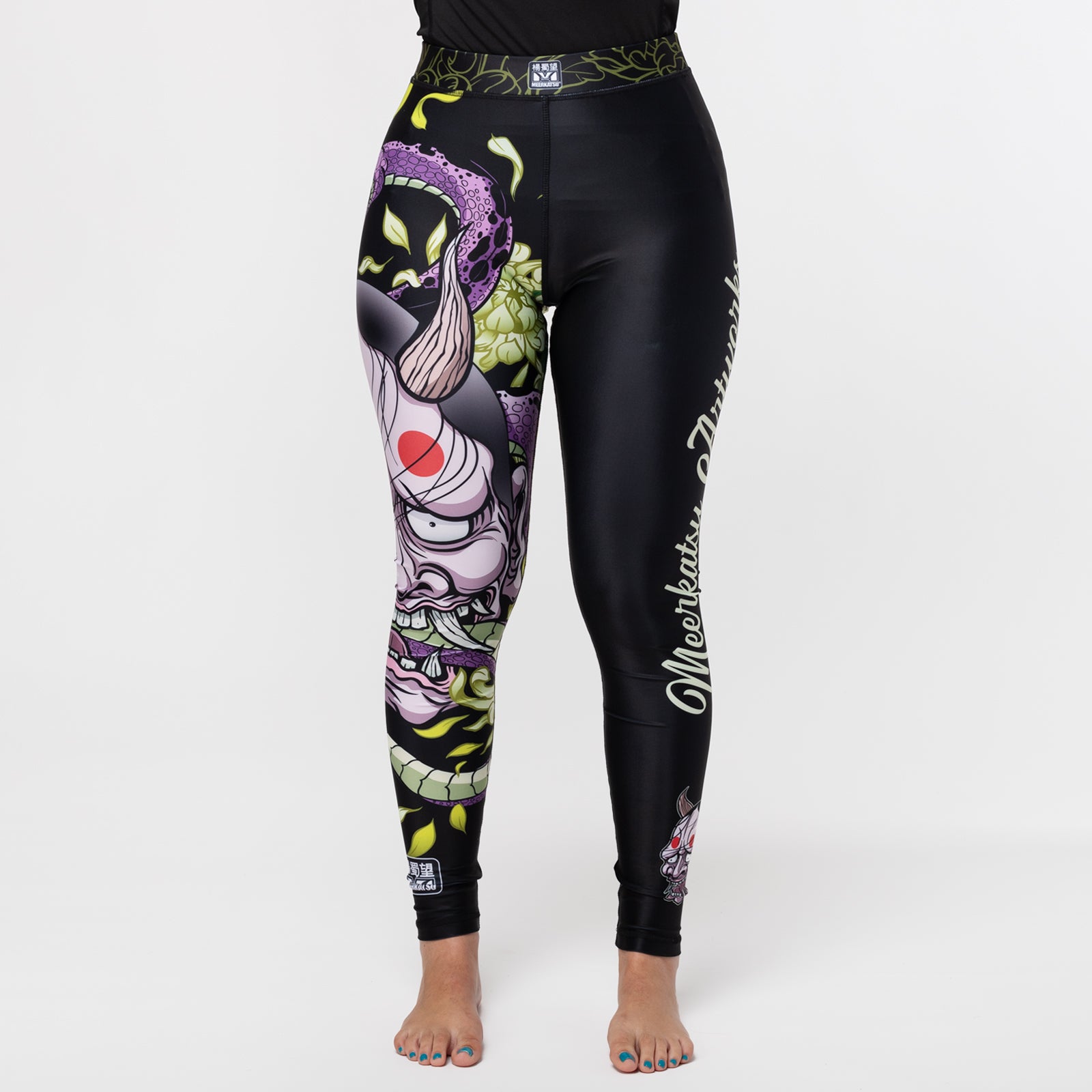 Renowned Jiu Jitsu designer Meerkatsu brings us the "Laughing Hannya" grappling spats which feature original hand-drawn artwork. The graphics depict the familiar Hannya design from Japanese folklore surrounded by a venomous snake and chrysanthemum flowers.