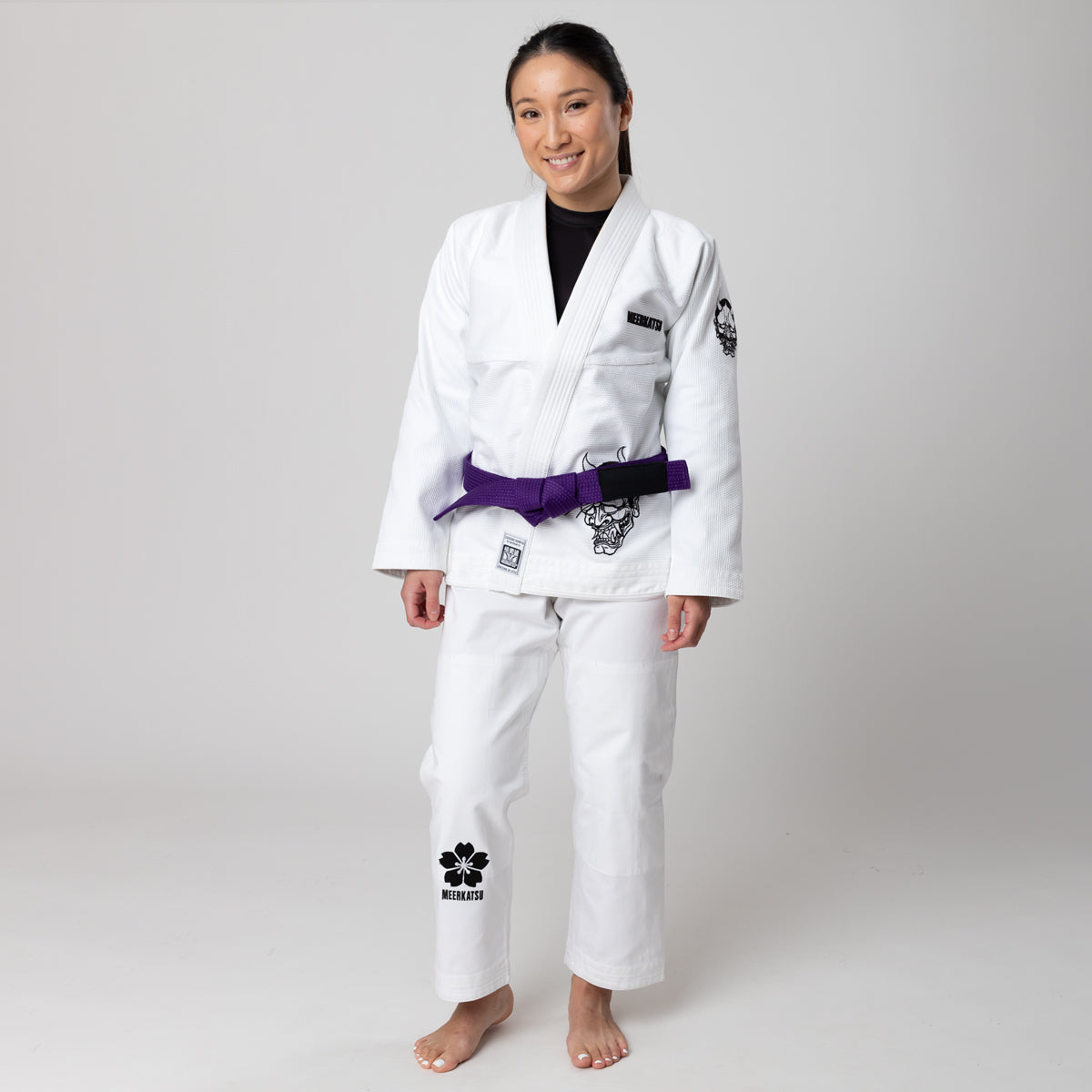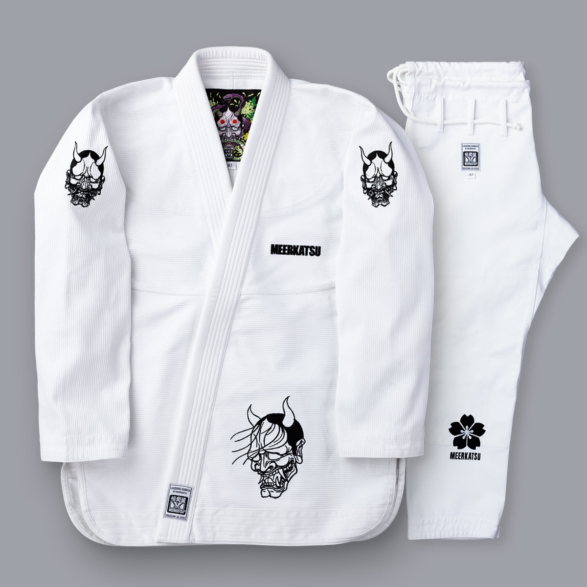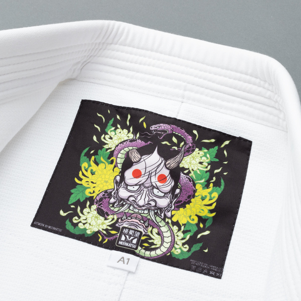 Introducing Meerkatsu's Laughing Hannya Jiu Jitsu Gi. Constructed with a lightweight pearl weave jacket and soft cotton pants. The interior neck patch sports the familiar Hannya design from Japanese folklore surrounded by a venomous snake and chrysanthemum flowers.
