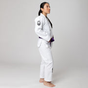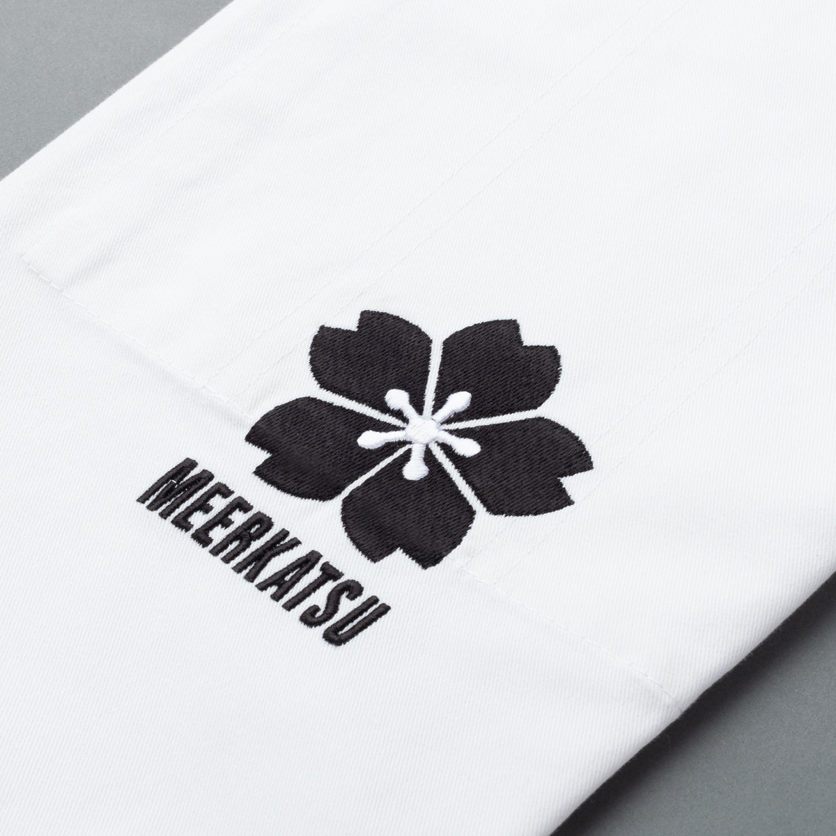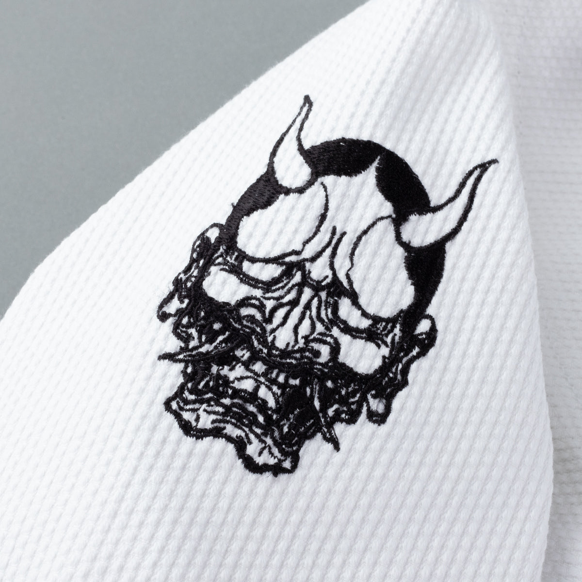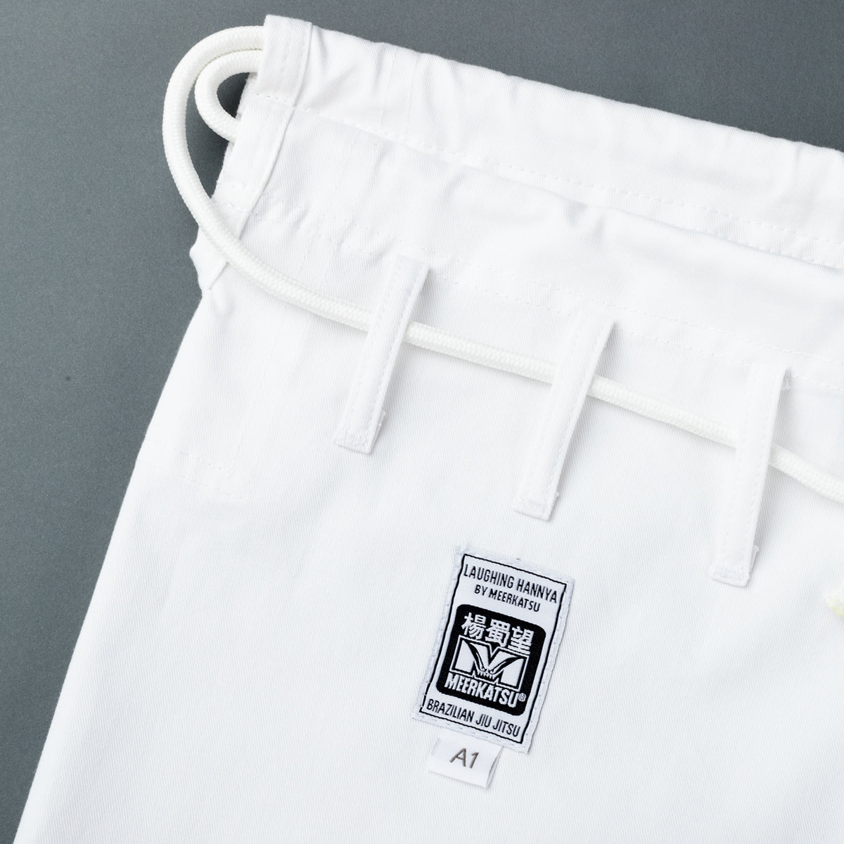 Introducing Meerkatsu's Laughing Hannya Jiu Jitsu Gi. Constructed with a lightweight pearl weave jacket and soft cotton pants. The interior neck patch sports the familiar Hannya design from Japanese folklore surrounded by a venomous snake and chrysanthemum flowers.