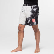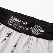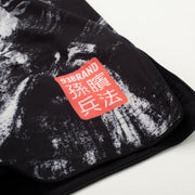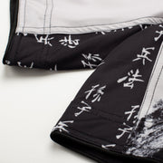 The overall design features an off-white base with bold graphics and branding that are fully sublimated into the material.  The crotch gusset panel is made of a stretch fabric for added flexibility and sports a contrasting white repeating kanji design.  Split side vents and lightweight materials contribute to the overall light and flexible feel.