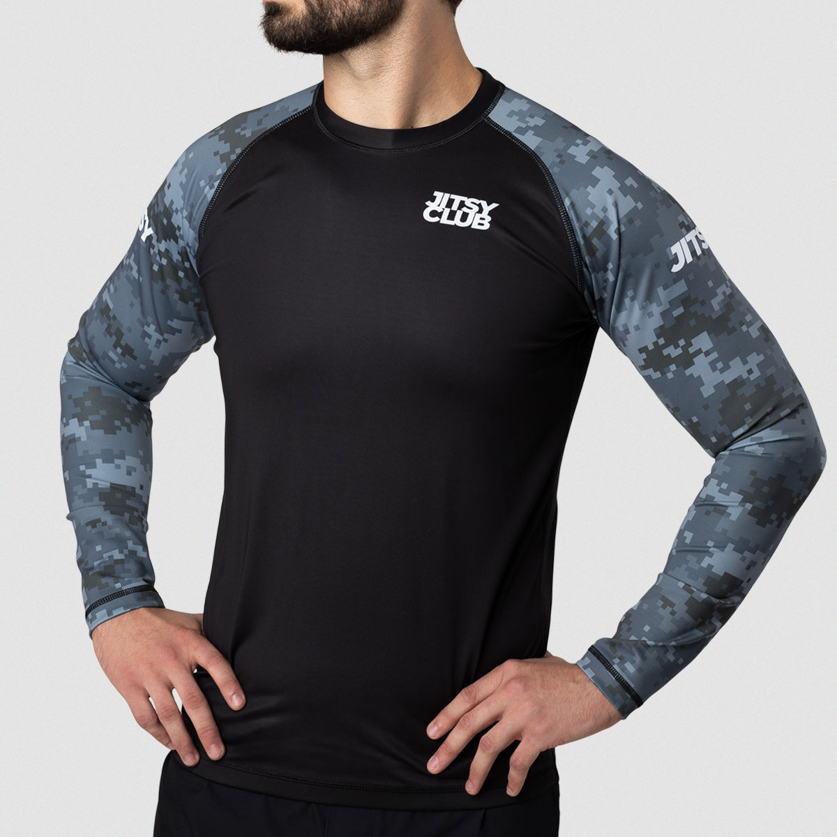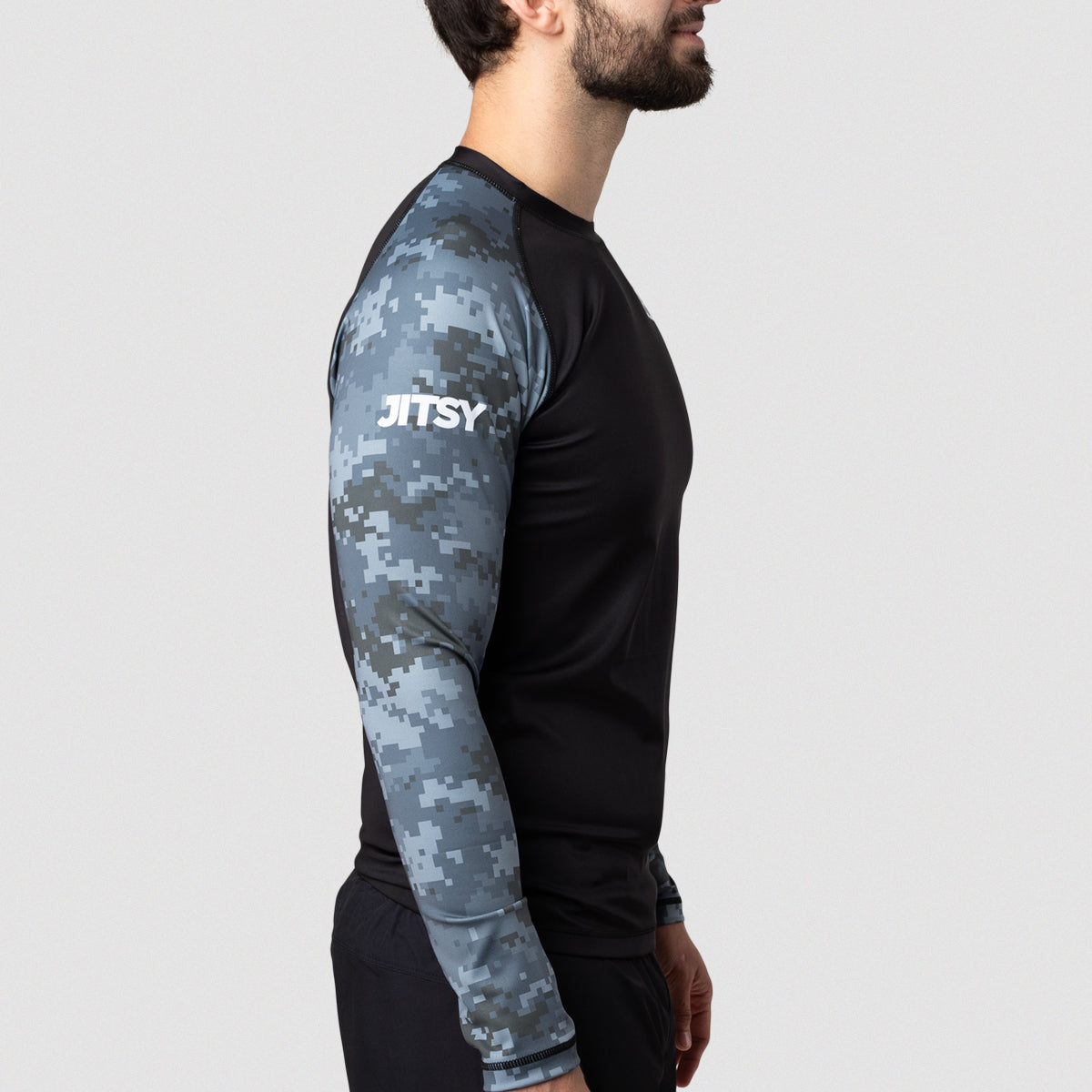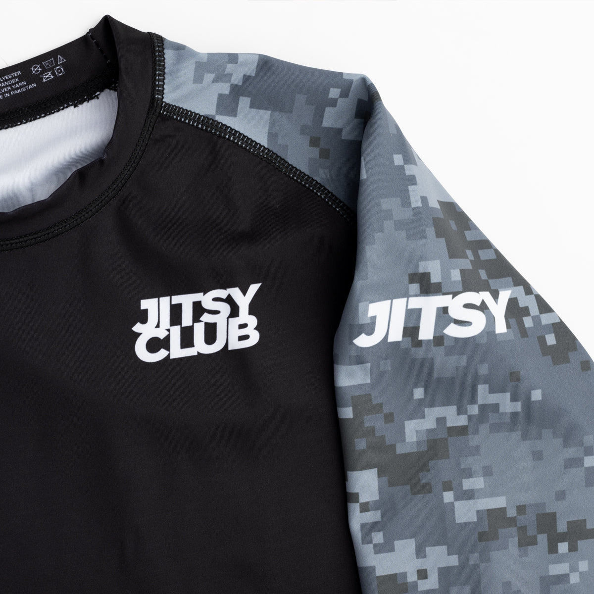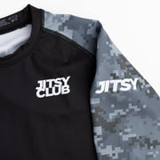 The Arctic Digital Camo rash guard from Jitsy Club is constructed with a thick yet comfortable blend of polyester, Spandex, and silver yarn. This compression top will work well for Nogi Jiu Jitsu, wrestling, MMA and other combat sports.