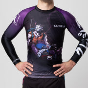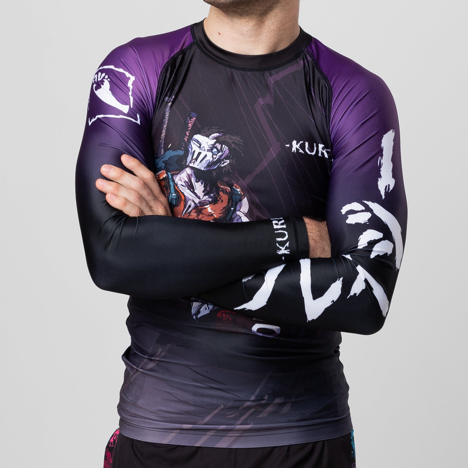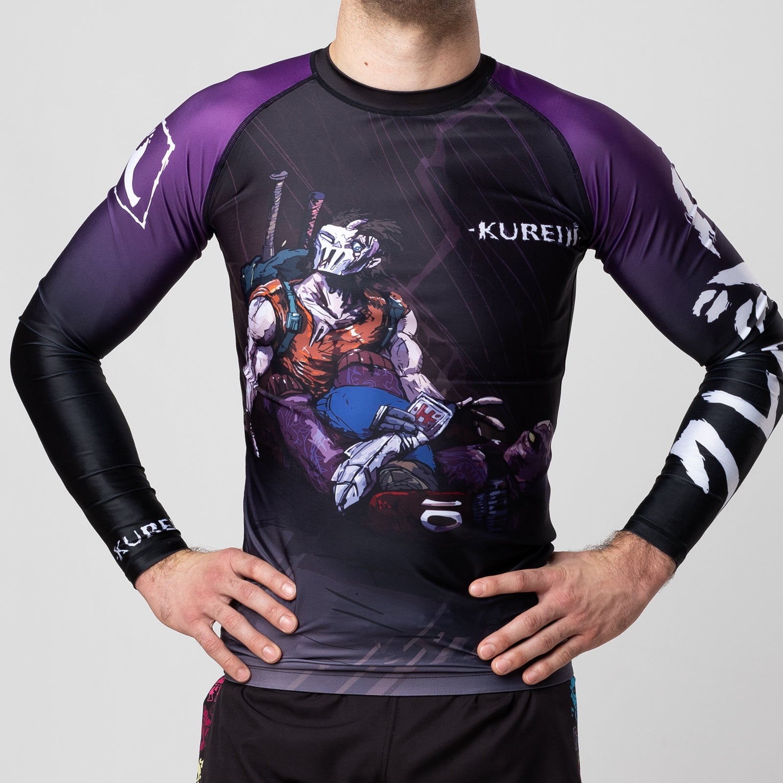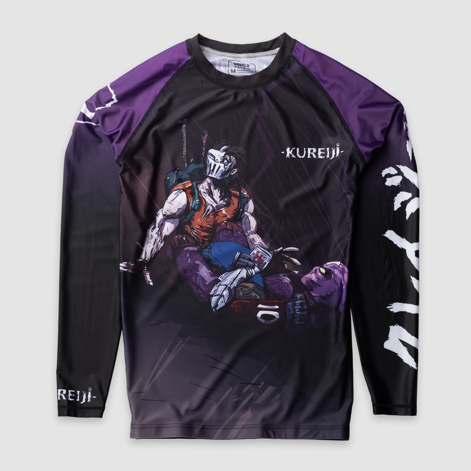 The "Foot Lock Klan" rash guard from Kureiji is made with a classic poly/Spandex blend and strong flexible seams. The internal silicon lining at the waist prevents the rash guard from riding up.