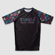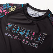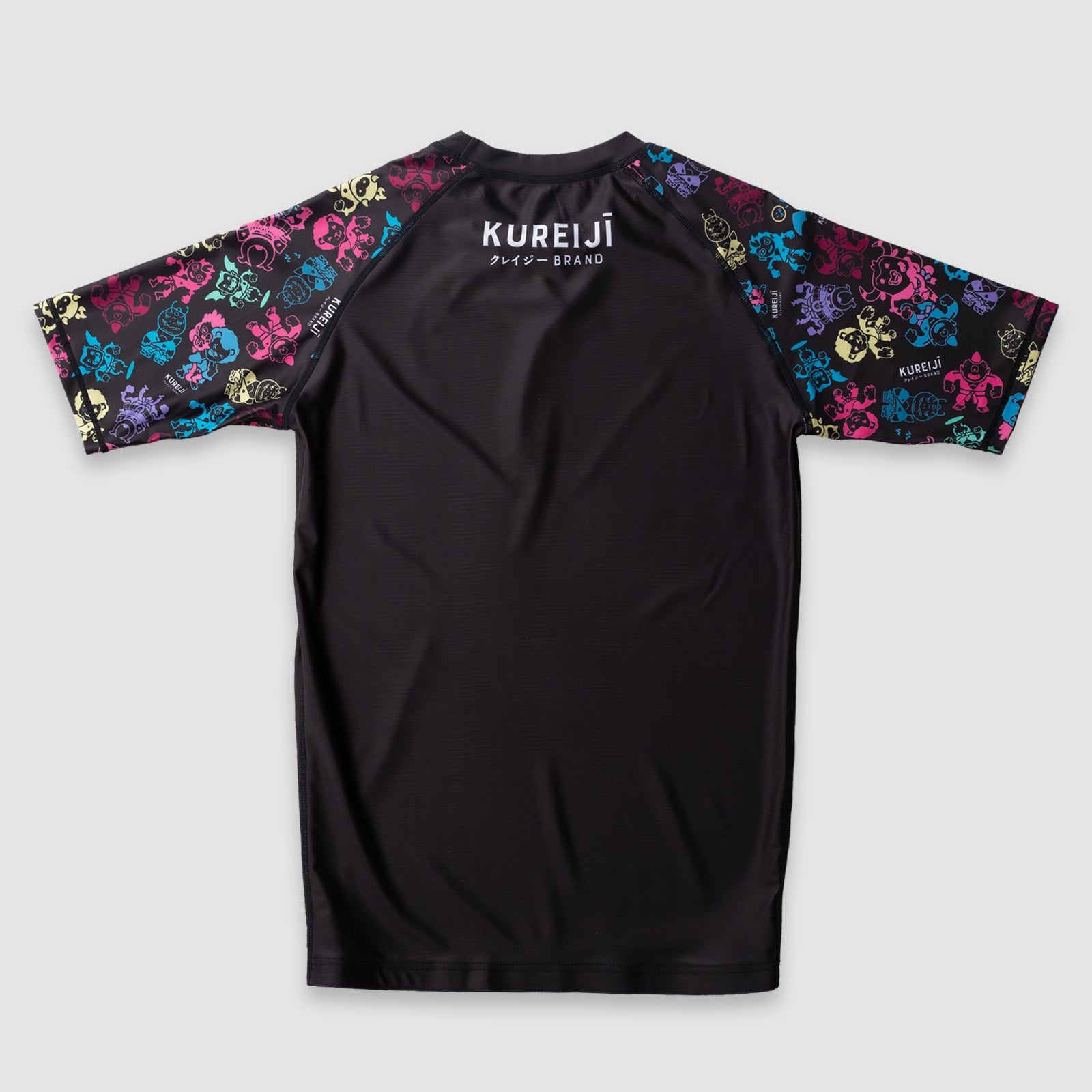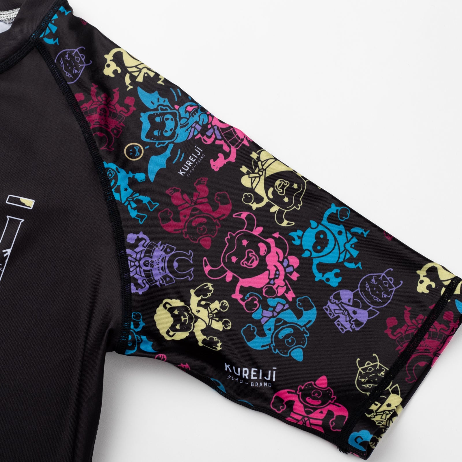 The "Kritters" rash guard from Kureiji is made with a classic poly/Spandex blend and strong flexible seams. The internal silicon lining at the waist prevents the rash guard from riding up. On each sleeve, you’ll see vibrant characters in kimonos who are prepared for combat.