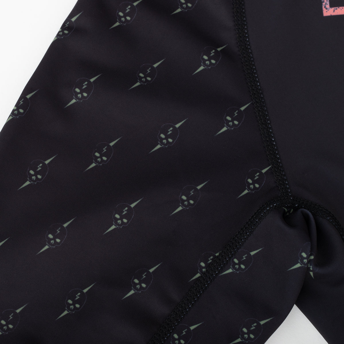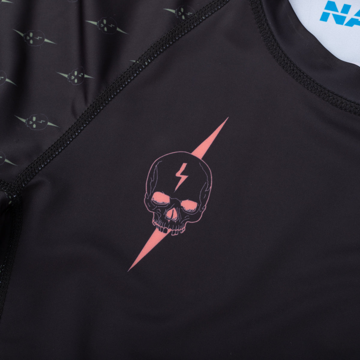 The Death Cuddle Jiu Jitsu rash guard is Nation Athletic's first ever (and best selling) rash guard to date. A lightweight competition rash guard featuring beautiful distressed artwork on the back panel and a repeating skull design along the side panels and sleeves.