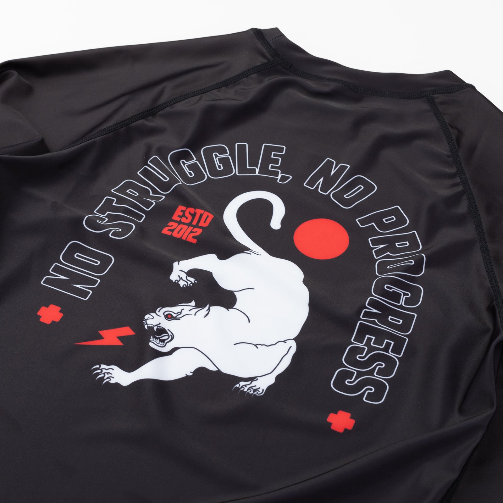 The Panther Rash Guard features one of Progress Jiu Jitsu's most popular designs. Fully sublimated panther graphic and branding throughout, including unique "Progress" text extending off the front panel. Made with a classic poly/Spandex blend and a snug compression fit.