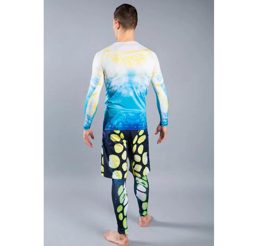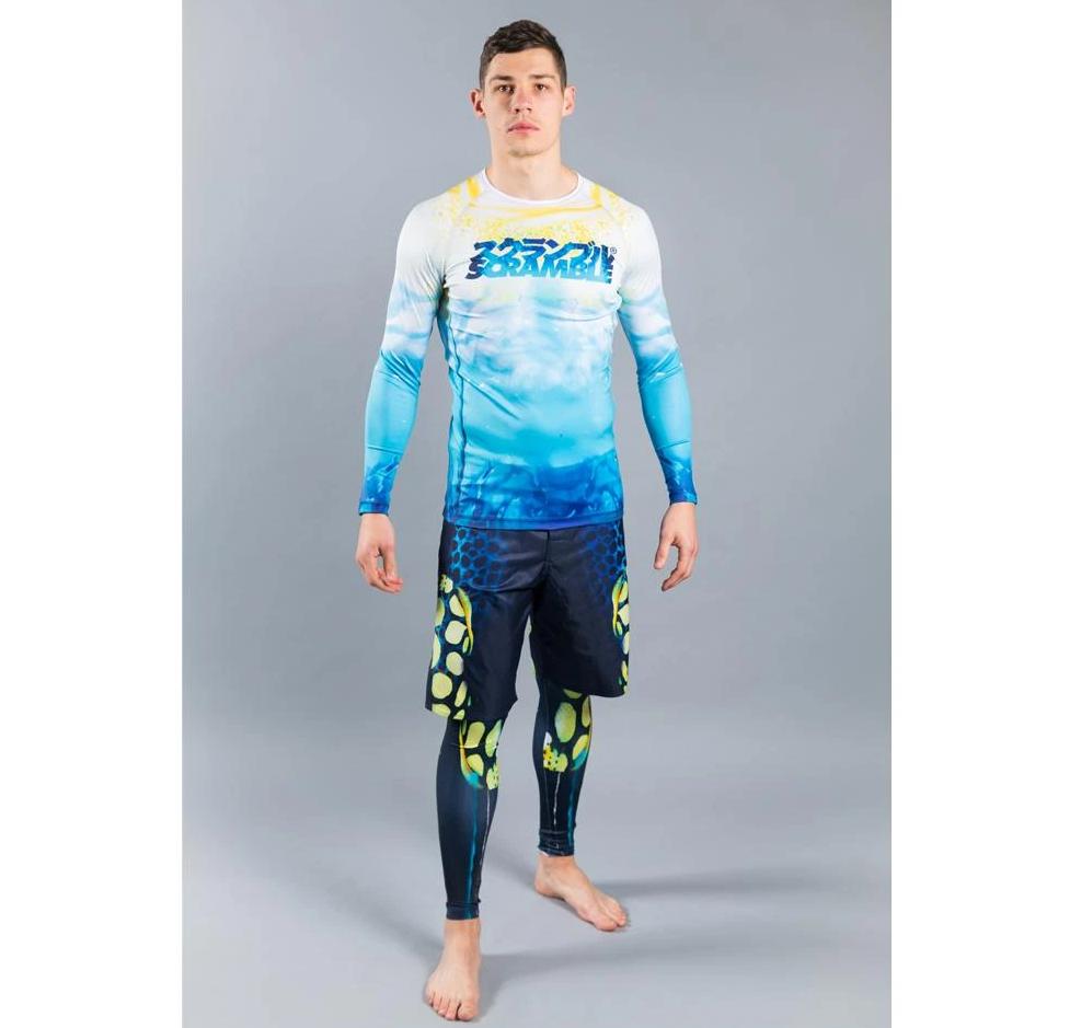 If you're looking to bring some color to your no-gi collection then look no further. Scramble's new "Pacifica" design was inspired by the beautiful waters and marine life of the South Pacific. These spats are a polyester/spandex blend with secure flatlock stitching. The sublimated graphics will not peel, crack, or fade over time. The "Pacifica" design is available in a rashguard, fight shorts, and spats.