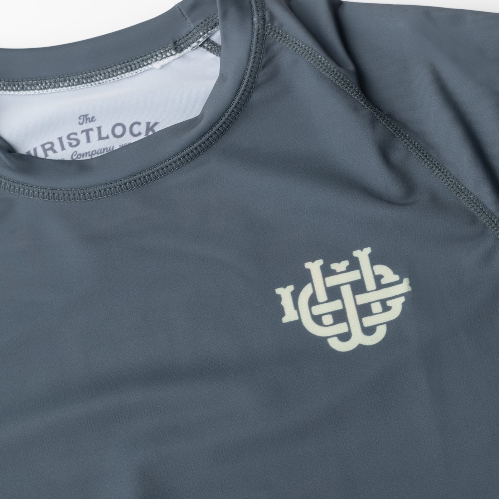 The "Legacy" rash guard from The Wristlock Company features a classic polyester/Spandex blend with a slick interlocking logo design on the front and back panel.