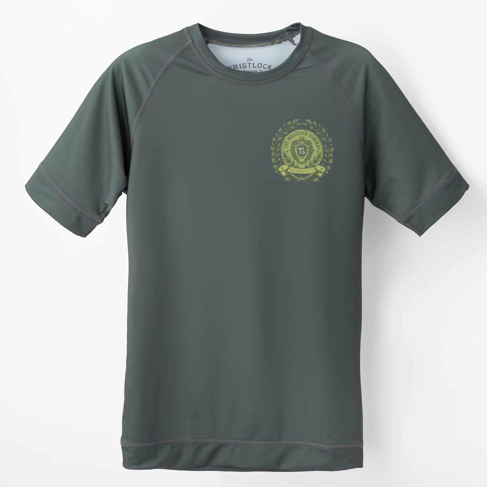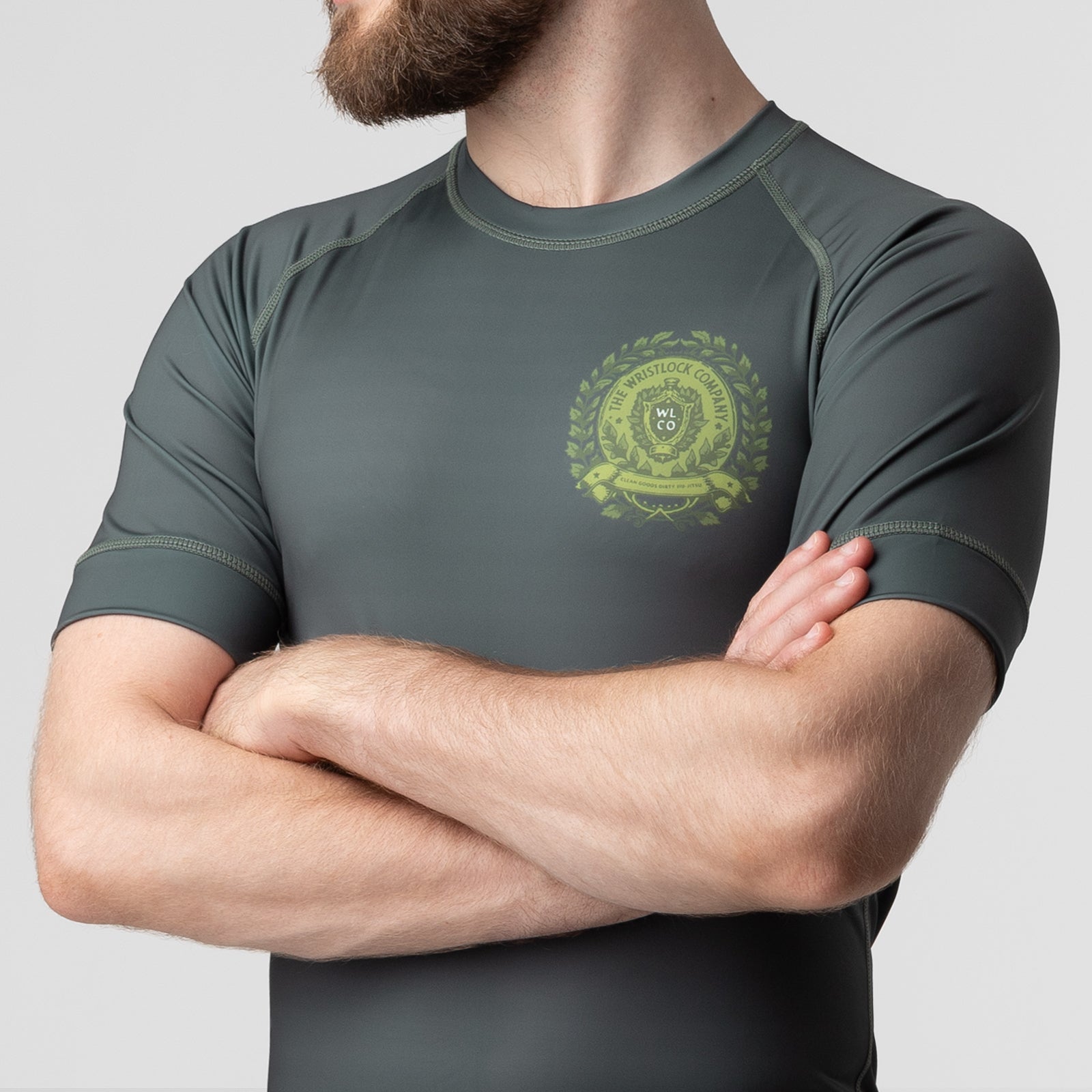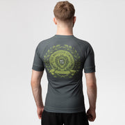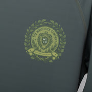 The Wristlock Company's rash guards are made with a high-quality polyester and spandex blend. The "Victory" rash showcases a dark green colorway with sublimated artwork and branding on the front and back panel.