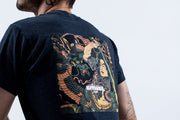 Kitsune's newest tee features the woodblock artwork from their "Heroes" Gi series, printed right here on the east coast US on a very comfy heather tee in a nice dark/muted blue colorway.