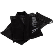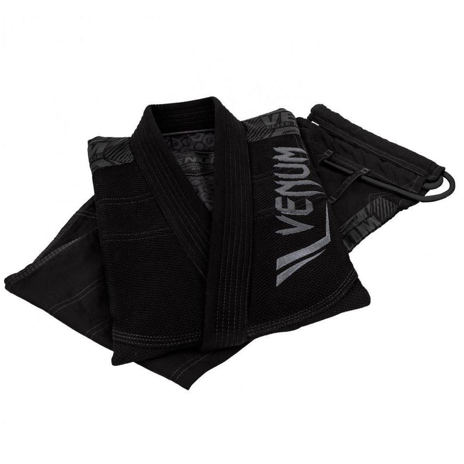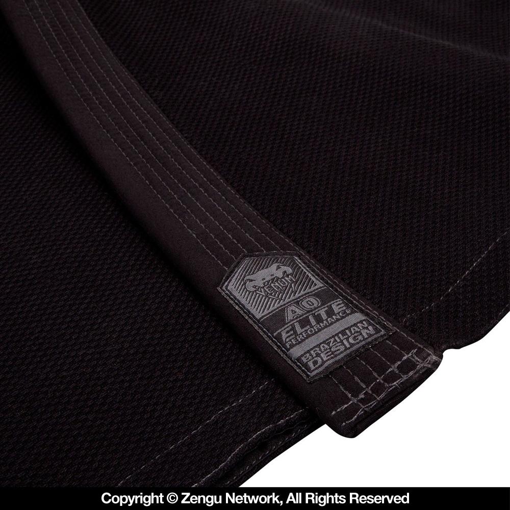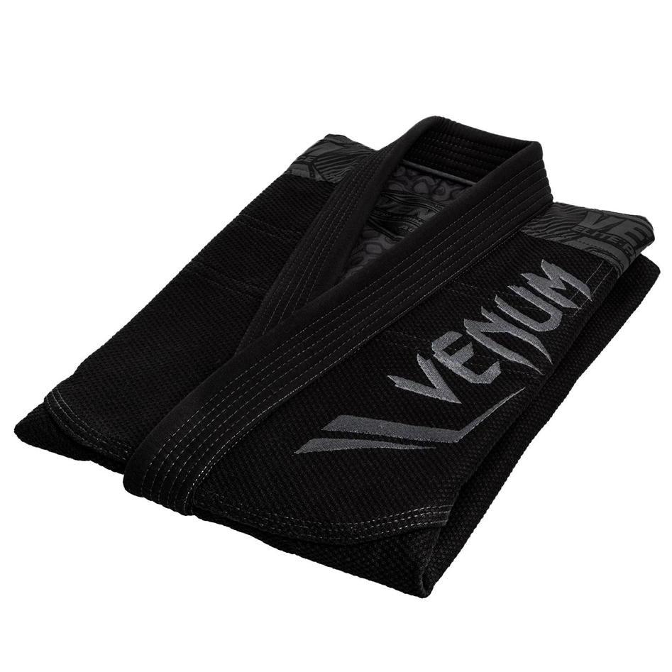 The new black on black edition of the Venum ELITE BJJ Gi! Main materials are pre-shrunk cotton: 500 GSM Gold Weave top and a lightweight ripstop pants.